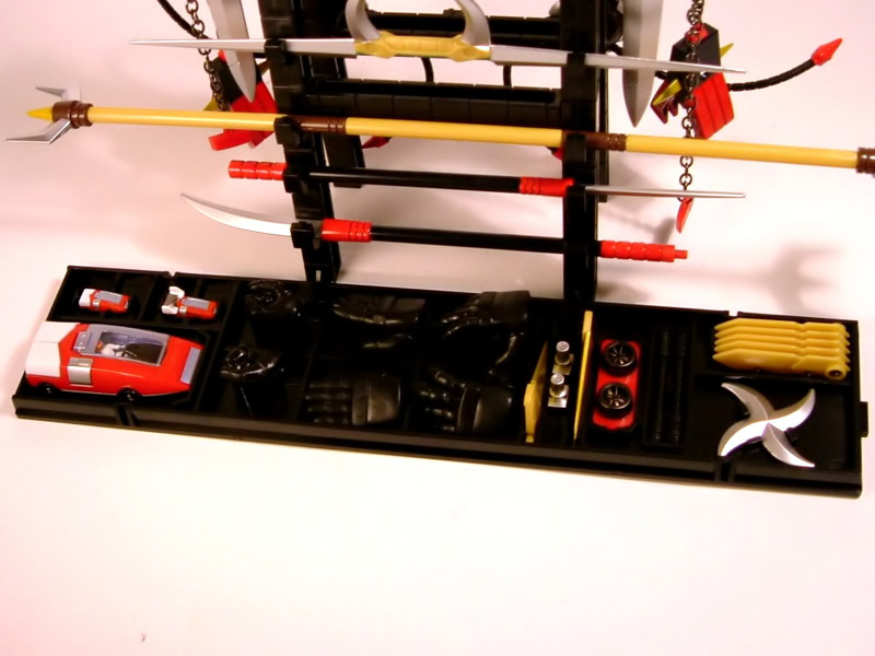 - Un astuccio in cartoncino contenente la base espositiva del Trancer e i componenti per assemblare l'espositore delle armi del robot.
