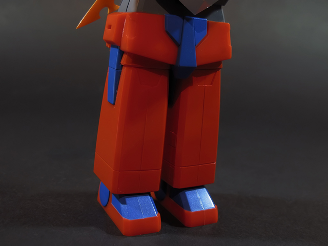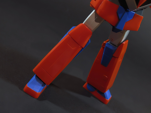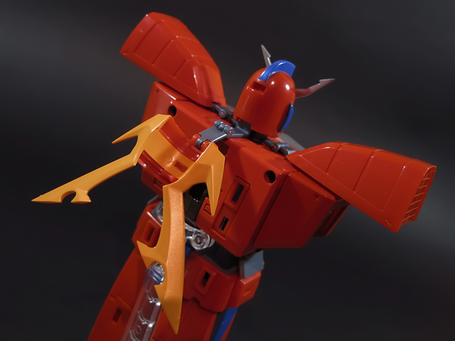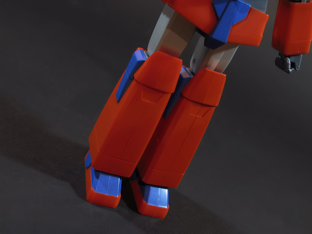 Estraendo Ace Redder dal suo alloggiamento la prima sensazione è innegabilmente fastidiosa e sgradevole, non fosse altro che per l’irrisorio peso di 210 grammi distribuiti sulla non indifferente altezza di 19.5 cm che tradiscono una composizione quasi totalmente in plastica (in metallo sono solamente la parte anteriore del torace al di sotto della pettorina removibile e le articolazioni di anca e spalla). Se infatti era lecito attendersi per questo componente (vista anche la posizione alta occupata nel robot) un contenuto in zama limitato pena il rischio di sbilanciare il Daioja una volta assemblato, era altrettanto plausibile aspettarsi qualcosina di più, che quasi certamente si sarebbe potuto fare. Ma plastica o metallo che siano ciò che in realtà lascia davvero sconcertati è la qualità della plastica stessa, se infatti si escludono le spalle che sono verniciate e (forse) le gambe, le restanti parti rosse del modello (praticamente tutte, in altre parole), sono colorate in pasta e presentano una tonalità che trasmette in modo tanto evidente quanto sconfortante una fortissima sensazione di giocattolo da bancarella che di rado, ma purtroppo sempre con maggior frequenza negli ultimi tempi, mi è capitato di avvertire con un SOC. Piccole imperfezioni di verniciatura costellano le parti grigie, sia a livello del fregio frontale (proprio in bella vista sulla testa del robot ma per fortuna è una cosa molto modesta) che sul braccio sinistro mentre una piccola ritoccatura di vernice fa bella mostra di se sul margine esterno della spalla destra. Abbondano sulle plastiche rosse e non solo i segni di distacco dalle sprue, gran parte dei quali distribuiti sul lato B del modello (in particolar modo sul retro di piede, gamba, coscia ed avambraccio), altri in posizione ben più scomoda come a livello degli inserti rossi ai lati della testa del robot, dove risultano veramente indisponenti. A questo punto vi chiederete mai se dopo simili critiche questo soggetto possa presentare un seppur minimo aspetto positivo. Ebbene si, fedeltà all’anime a parte (ineccepibile al 100%), la nota lieta arriva dal più che soddisfacente grado di posabilità (fallo anche essere impalato….). Le caviglie, ad attrito, hanno ampi movimenti di inclinazione laterale mentre le ginocchia, a scatto, si flettono fino ad un massimo di 90 gradi. L’anca ha notevoli escursioni in abduzione (quasi fino a 90 gradi) e discreta rotazione sull’asse longitudinale. Il busto, complice la necessità di realizzare un modello internamente cavo per consentirne la conversione, è privo di snodi. Le spalle, a scatto in rotazione (ampiezza di movimento 360 gradi), nei movimenti di abduzione (praticabili fino ad un massimo di 90 gradi) si comportano come articolazioni ad attrito. Le braccia sono rotabili sull’asse longitudinale a 360 gradi all’attacco con la spalla ed i gomiti, ad attrito, si flettono ad angolo retto. Le mani non sono intercambiabili, di fatto il robot ha un solo paio di mani preapplicate con movimenti modesti al polso (solo rotazione) e con dita tra loro fuse dall’indice al mignolo e snodate all’altezza delle nocche e dell’attacco del pollice alla mano così da permettergli di impugnare la spada (unica arma in dotazione). La testa, regolata da uno snodo a sfera, avrebbe potenzialmente buone possibilità di escursione, ma viene molto limitata in questo senso dagli inserti rossi ai suoi lati. La sensazione di fragilità almeno in questo elemento è comunque sempre ben percepibile. Personalmente, estraendolo, uno dei due avambracci telescopici (rientrano sulle braccia per ripiegarsi nel torace del robot nella trasformazione) mi è bellamente rimasto in mano (l’ho riapplicato senza problemi), in molti lamentano (almeno in questo a me è andata bene) l’instabilità della pettorina che tenderebbe a staccarsi ad ogni refolo di vento. Insomma, diciamo che si parte decisamente male! Nell’augurio che gli altri due mecha possano risollevare le sorti del modello accingiamoci ad estrarre Aoider dal suo alloggiamento…..