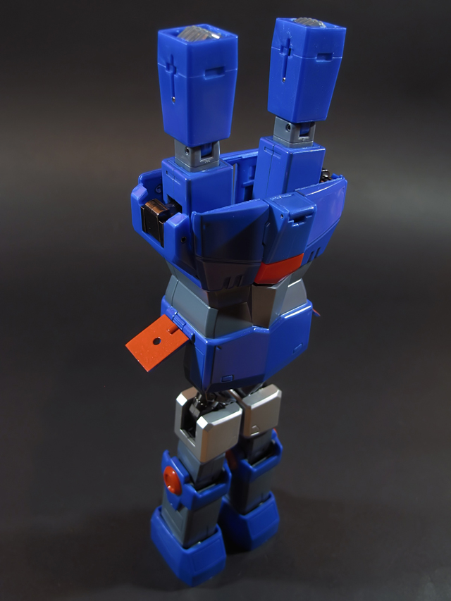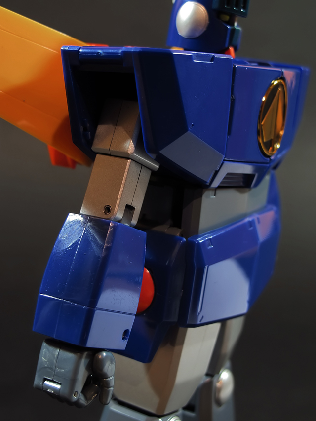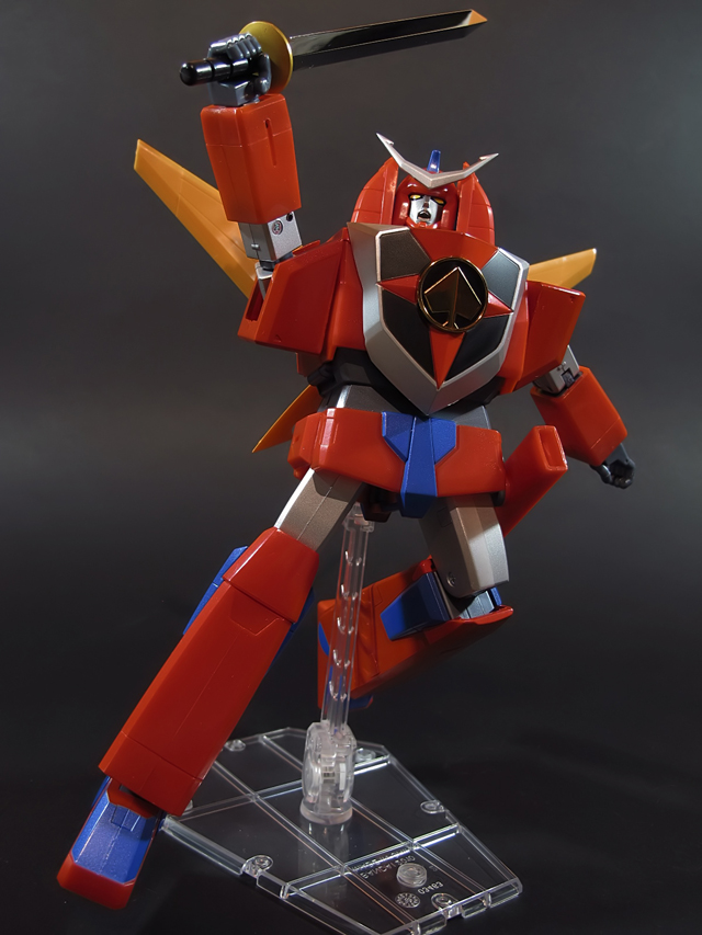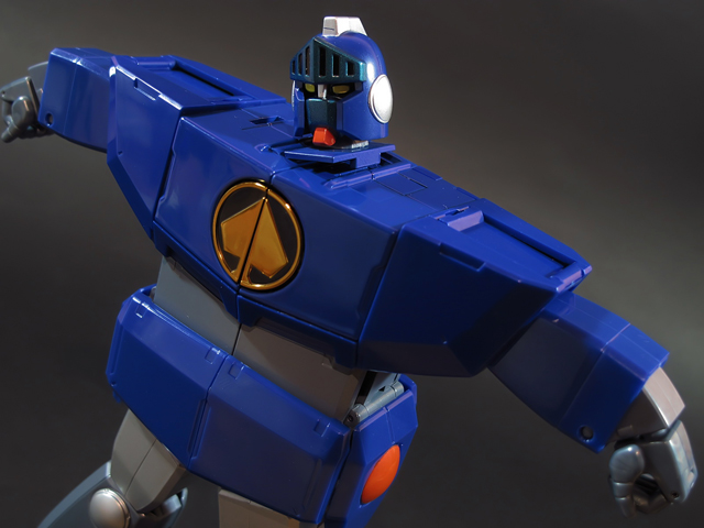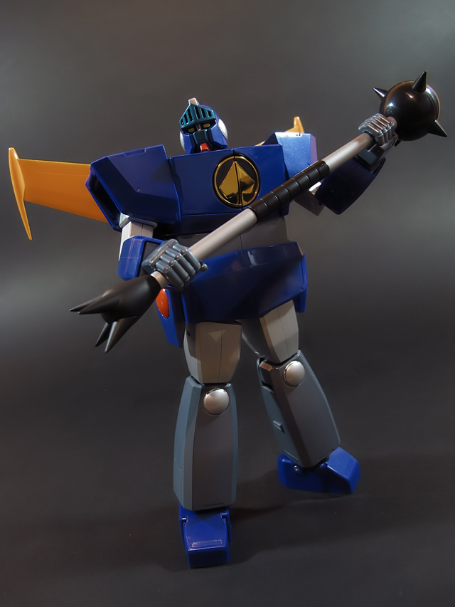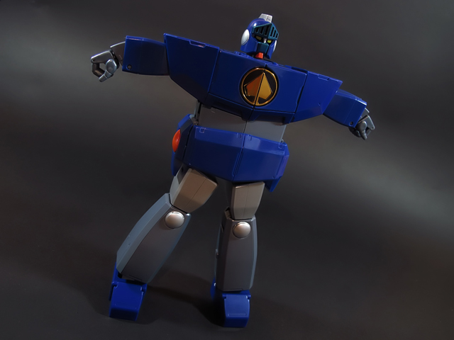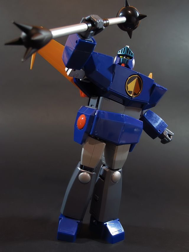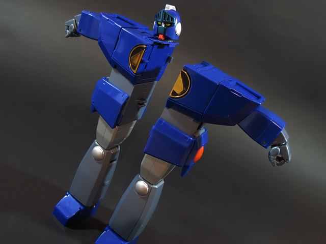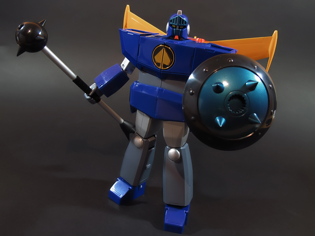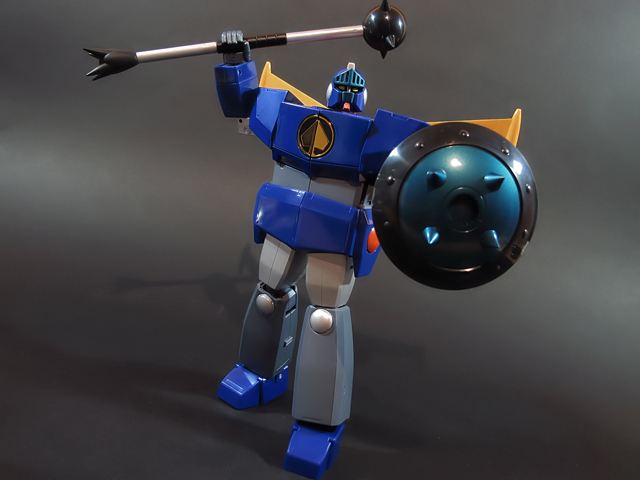 Toh?! Un chogokin! Perdonate l’ironia, ma il Cobalter, al terzo tentativo, riesce finalmente ad appagare in modo pienamente soddisfacente gli zama-dipendenti! 382 grammi per un’altezza di 19.5 cm evidenziano in modo chiaro la presenza in quantità adeguata di metallo, concentrato nelle gambe e nell’intero blocco del torace. La verniciatura è finalmente a livelli buoni anche se leggermente stona la differenza di tonalità del blu allo stacco torace-spalle per diversa composizione (torace in metallo, spalla in plastica). Pochi e ben celati i segni di distacco dalle sprue (superficie posteriore dei piedi e degli avambracci). Accettabile il grado di posabilità, buona la stabilità, ottima la fedeltà all’anime. Le caviglie sono cave ed il loro snodo a sfera, posizionato a metà del margine interno della gamba, assicura ampi movimenti di inclinazione interna e di rotazione a 360 gradi. Le ginocchia, ben solide, sono a scatto e si flettono ad angolo retto. L’anca, a frizione, ruota a 360 gradi ma ha minime escursioni sia in flesso-estensione che in abduzione vanificando in parte le buone prestazioni delle caviglie. Le spalle, ad attrito, ruotano liberamente e non si abducono oltre i 90 gradi in parte per effetto della loro conformazione anatomica che ne limita l’escursione sul piano frontale. Le braccia ruotano longitudinalmente a 360 gradi all’attacco con la spalla, i gomiti non si flettono oltre i 90 gradi ed i polsi sono parzialmente flessibili oltre che liberamente ruotabili. Anche in questo caso il robot è dotato di un paio di mani preapplicate con snodi alle nocche ed all’attacco del pollice alla mano. La testa ha movimenti minimi sia in flessione ed estensione che in inclinazione laterale mentre può ruotare senza problemi per l’intera circonferenza. Le armi in dotazione sono costituite da una mazza chiodata e da uno scudo. Una piccola nota a margine: una volta assemblato il vostro Daioja fate attenzione a come lo spostate e soprattutto evitate di strusciare i piedi sul piano d’appoggio. La pianta dei piedi del Daioja, infatti, altro non è che la superficie superiore delle spalle del Cobalter, graffiarla significherebbe danneggiare sensibilmente ed irrimediabilmente le spalle di quest’ultimo. Benissimo, chiusa con un sostanziale pareggio tra alti e bassi l’analisi dei 3 mecha separati, siamo pronti per passare al capitolo finale della nostra disamina, il Grande Sovrano, il Saikyo Robo Daioja. (