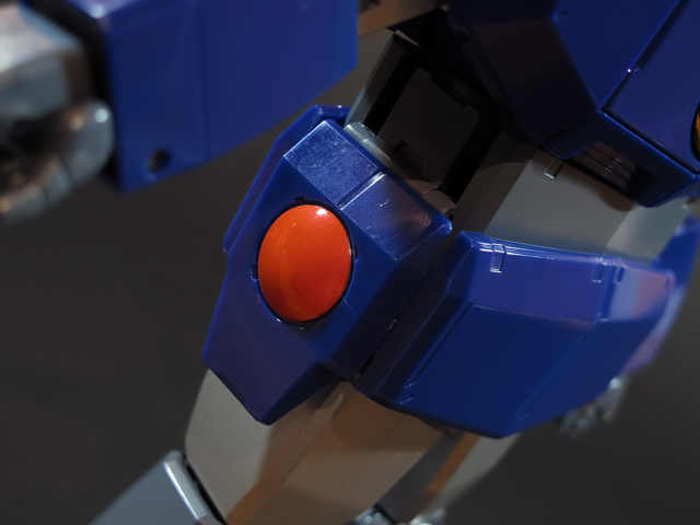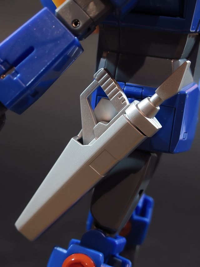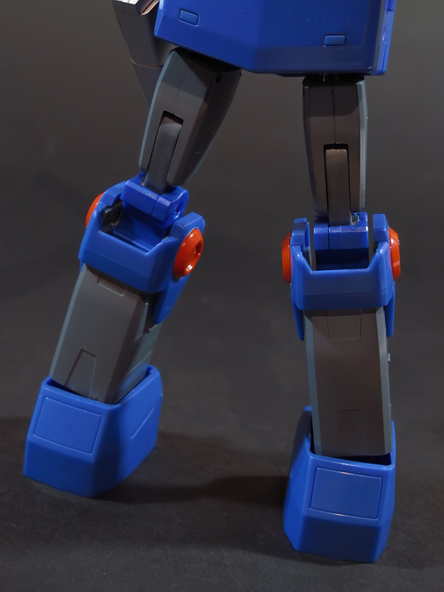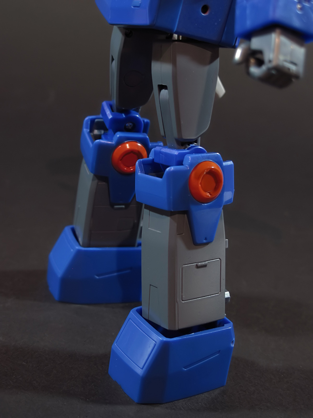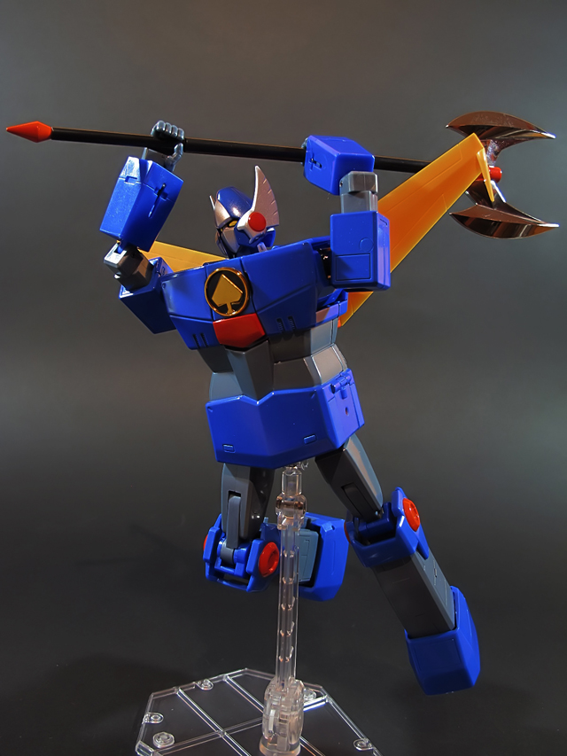 La fredda sensazione di metallo e di appagante consistenza ponderale che Aoider trasmette quando se ne afferra il tronco ci fa subito capire che a differenza del suo compare rosso, questo soggetto ha minori problematiche di familiarizzazione con il concetto di zama, e la bilancia non mente, i 282 grammi di peso per circa 20 cm di altezza ci fanno capire che finalmente la musica potrebbe cambiare. La quota di metallo, presente nell’intero blocco del tronco, in corrispondenza delle spalle ed a livello delle articolazioni di anche e spalle, rappresenta una percentuale nel complesso soddisfacente e comunque tale da rendere il modello degno del termine chogokin piuttosto che action figure. Ciò che balza però subito all’occhio è come il metallo, soprattutto se ripartito in modo squilibrato, finisca inesorabilmente per fare a cazzotti con la posabilità e ancor di più con la stabilità di un chogokin. L’Aoider, infatti, parrebbe avere in una estrema instabilità la sua principale pecca anche per il modo in cui, per necessità di trasfomazione, sono stati concepiti gli arti inferiori, apparentemente troppo esili ed instabili per dare un adeguato supporto al resto del corpo. Ma così non è, per fortuna. I tappi in dotazione con il modello per chiudere la pianta del piede ne migliorano, e di molto, il grado di stabilità, aiutati in questo da un piccolo perno in plastica che, applicato nel bacino del robot ne stabilizza le anche e ne ottimizza i movimenti. La verniciatura è buona, decisamente migliore di quella dell’Ace Redder, ed anche i distacchi dalle sprue, presenti solo sulla faccia posteriore e concentrati sulle parti blu, sono meno numerosi ed evidenti (principalmente piedi, ginocchia, margini inferiori degli avambracci), forse anche per il diverso colore delle plastiche in cui meno risaltano. Ancora una volta viene confermata la scarsa qualità dei materiali utilizzati, le venature che solcano la plastica blu colorata in pasta degli avambracci ma soprattutto dei pannelli ai lati della testa del robot sono, in una sola, semplice parola, brutte. Sulla posabilità abbiamo già detto qualcosa ma scendiamo nel dettaglio degli snodi. Le caviglie, per ragioni di trasformazione, sono cave e governate da uno snodo ad attrito localizzato sulla parte posteriore della gamba che permette movimenti di inclinazione discreti sull’esterno e modesti sull’interno anche se nutro qualche perplessità sulla eventuale tenuta nel tempo che con il passare degli anni potrebbe diventare scarsa per quelle che dovrebbero essere le necessità di carico dell’articolazione. Il ginocchio è a scatto e si flette fino a 90 gradi mentre l’anca, ad attrito, ruota sull’asse longitudinale a 360 gradi ma ha escursioni piuttosto limitate sia in flesso-estensione che in abduzione. Le spalle hanno uno snodo particolarmente rigido che funziona ad attrito in rotazione (movimento completo a 360 gradi) ed a scatto in abduzione (fino 90 gradi). Le braccia sono ruotabili longitudinalmente all’attacco con la spalla e le mani, come quelle dell’Ace Redder, non sono intercambiabili ma fisse e con snodo alle nocche ed alla base del pollice per permettere l’impugnatura delle armi. La testa ruota a 360 gradi presentando modesti movimenti sia in flessione ed estensione che di inclinazione laterale. Molto buona la fedeltà del soggetto all’anime, se infatti si escludono le cosce, forse un po’ tropo esili, è difficile eccepire qualcosa sulla rassomiglianza alla controparte animata. Le armi in dotazione, senza infamia e senza lode, sono l’alabarda ed il fucile con relativa fondina.