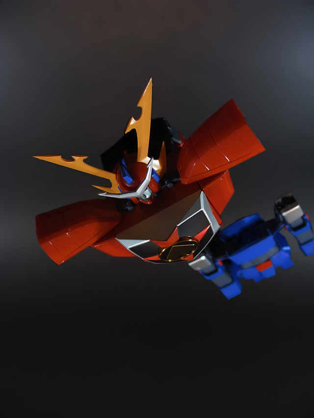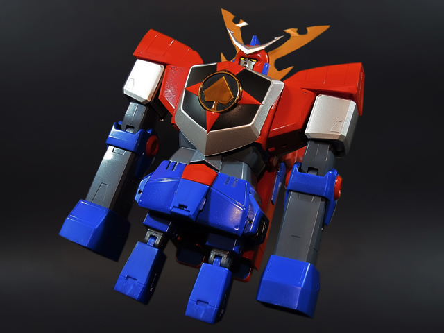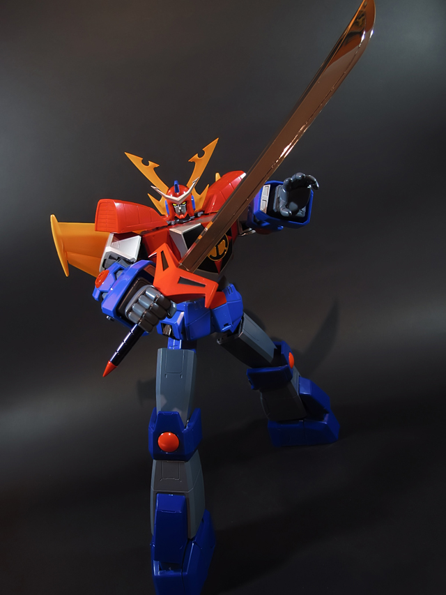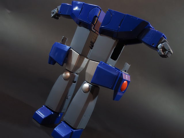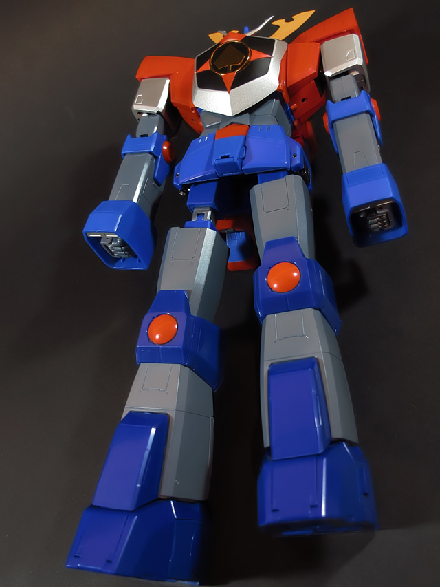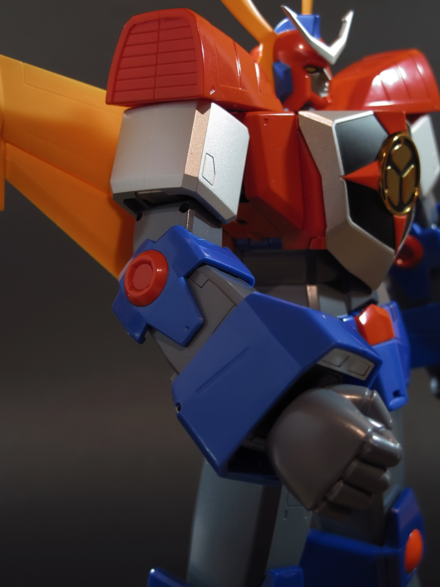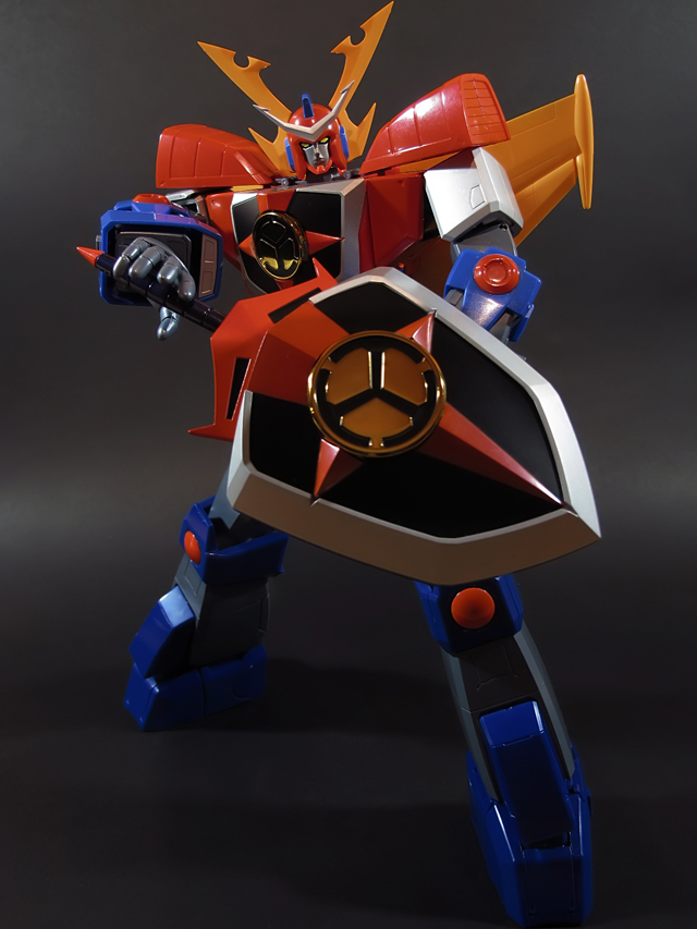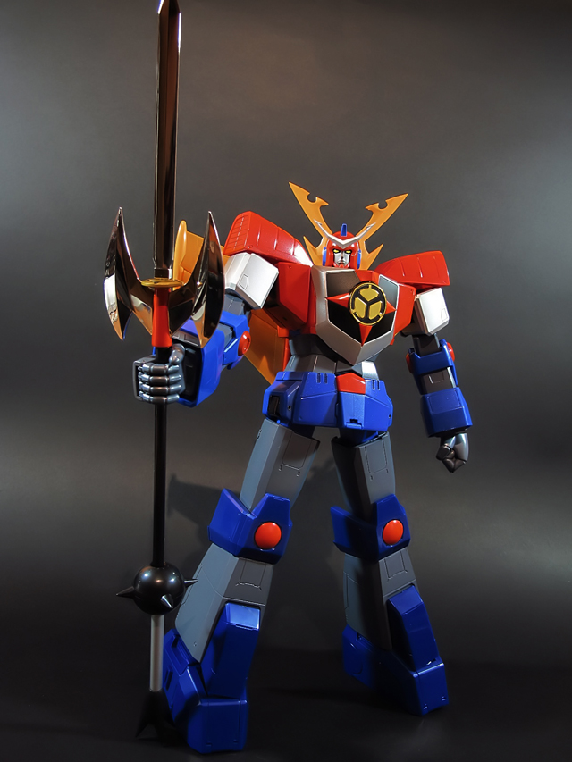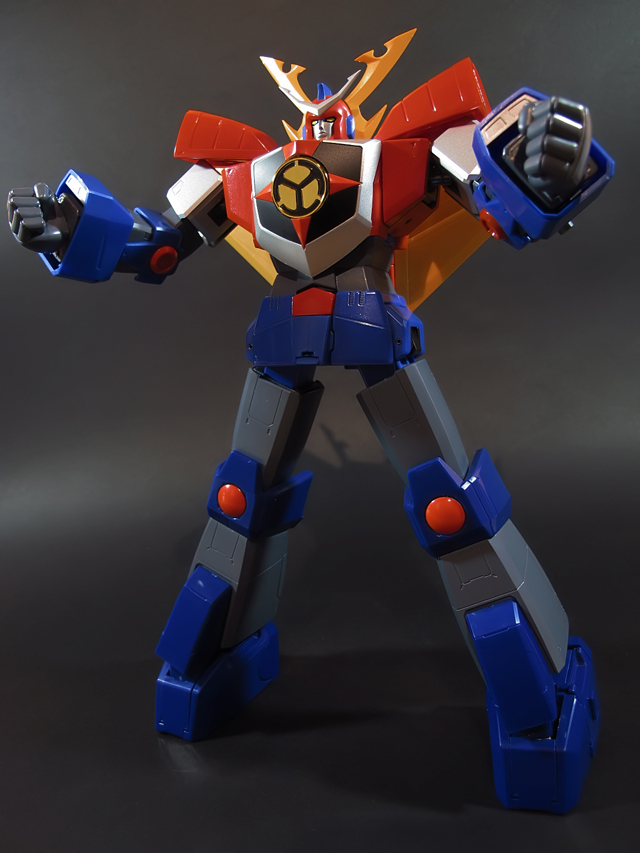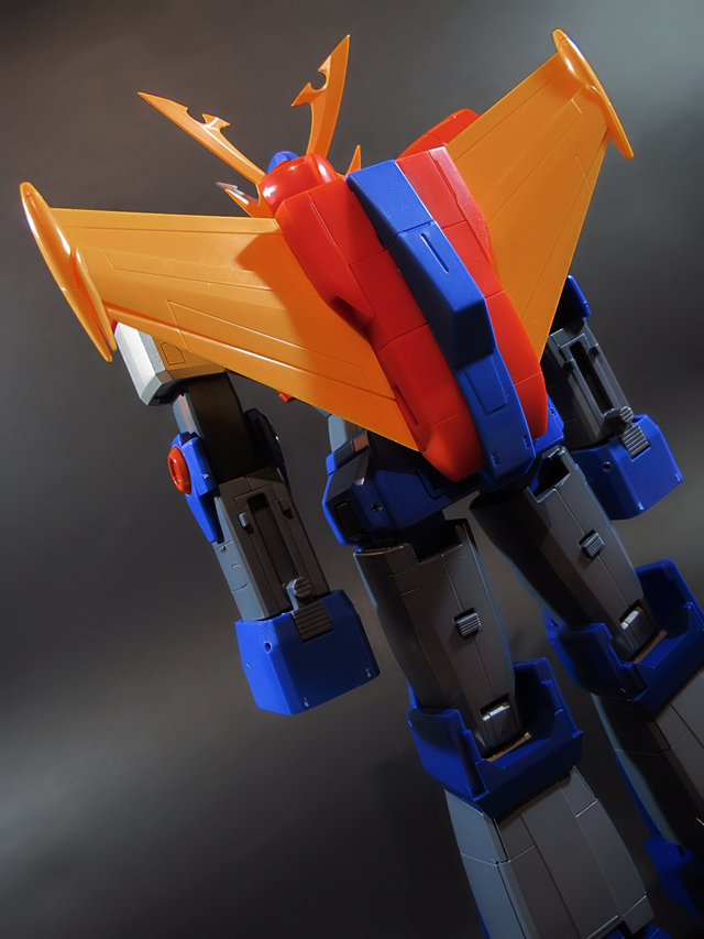 Bene, andiamo per gradi e cominciamo per ordine l’analisi dell’argomento principe di questa recensione: il gokin assemblato. Avviamo quindi la nostra disamina dal punto di partenza, e cioè la trasformazione del robot. Da questo punto di vista penso che stiamo parlando di quello che in assoluto è il vero, enorme punto di forza di questo chogokin. La conversione dei 3 mecha separati nelle varie parti del Daioja è qualcosa di sublime ed incredibilmente sorprendente, in particolar modo per la fedeltà all’anime, assolutamente ineccepibile al 1000% . Ed ecco che quasi per incantesimo, proprio come nel cartone, Ace Redder va a comporre torace e testa, Aoider diventa l’addome e le braccia e Cobalter si converte nelle gambe del grande Daioja. Se per soc trasformabili comunque assai validi una delle critiche più frequentemente ricorrenti era lo stravolgimento della reale sequenza di trasformazione (gruppo senza ombra di dubbio capeggiato dal controverso gx-43 Daimos) in questo caso penso che nessuno possa assolutamente eccepire niente. Davvero pazzesco il numero di comparti apribili, parti ribaltabili (carina l’idea del logo sul petto dell’Ace Redder, che riproduce una foglia come quelli sul petto di Aoider e Cobalter, ruotabile per riprodurre il logo del Daioja, che altro non è che il simbolo dell’unione delle 3 suddette foglie) e pannellini girevoli che in più punti arricchiscono il mecha senza il rischio di sfregamenti o graffi (purchè si abbia l’accortezza di seguire alla lettera il libretto di istruzioni) e che sottolineano uno studio più che minuzioso del connubio tra la fedeltà a quanto apprezzato in video ed un risultato estetico accettabile, sia per i 3 mecha scomposti che per il Daioja assemblato. Ovviamente sarebbe stato impossibile, per quest’ultimo, avere proporzioni assolutamente perfette, ecco che si è resa necessaria quindi la dotazione del modello in parti aggiuntive (come già avvenuto per il gx-46) indispensabili per renderne maggiormente proporzionate le fattezze. Tali parti sono costituite da spalle, coprispalle, gambe e superficie posteriore dei piedi. Fate però moltissima attenzione nell’applicazione delle coperture delle gambe, se non le si fanno combaciare perfettamente e si forza, il rischio è di sverniciare le gambe stesse (che non sono altro che le cosce del Cobalter). Bella anche l’unione delle ali dei 3 mecha in una sola grande ala per il Daioja. Disgraziatamente una delle due spalle rosse (le parti ai lati della pettorina per intenderci) mi si è letteralmente spappolata in mano dividendosi in due metà. Niente di grave ed istantaneamente riparabile con una semplice goccia di attack fortunatamente, ma nei vecchi SOC componibili queste cose non succedevano…. Ad ogni modo il risultato finale, di sicuro impatto estetico, è quello di un gigante dell’altezza di 29 cm per un peso, tutto sommato non così scarso, di 835 grammi. Uno dei principali dubbi che inizialmente attanagliava i collezionisti era relativo alla posabilità del modello una volta assemblato, non fosse altro che per l’estrema complessità della trasformazione. Bene, sotto questo punto di vista possiamo ammettere che il gx-61 ha passato la prova con una sufficienza abbondante. Le caviglie, ad attrito, sono estraibili e regolate da uno snodo praticamente analogo a quello già apprezzato nel gx-53 Daitarn 3, un piccolo cilindro localizzato nell’angolo posteriore interno del piede che permette, quando allungato, inclinazioni tutto sommato discrete (in questo caso minori di quelle della caviglia del gx-53 perché limitate dalle coperture delle gambe). Le ginocchia, a scatto, si flettono non oltre i 90 gradi. Per le anche (ad attrito) si deve fare invece un discorso a parte nel senso che presentano escursioni relativamente modeste (discreta abduzione, rotazione longitudinale nulla, estensione e flessione minime) se si lasciano applicati, al momento della trasformazione, i piedi del Cobalter. Se invece, come consigliato nel libretto di istruzioni, si ha l’accortezza di rimuovere questi ultimi, la musica cambia, e di molto, nel senso che l’articolazione finisce per guadagnare moltissimo in abduzione (in teoria il robot arriva a fare la spaccata), leggermente in flessione-estensione e minimamente in rotazione longitudinale anche se la sensazione (a onor del vero non confermata dai fatti) è che il modello possa pagare dazio a questa opzione almeno in termini di stabilità, apparentemente più precaria. La spalla è governata da una articolazione a scatto sia nei movimenti di rotazione (praticabili liberamente a 360 gradi) che in abduzione (estendibile poco oltre i 90 gradi). Le braccia ruotano longitudinalmente a 360 gradi all’attacco con la spalla ed i gomiti, a scatto, sono flessibili a 90 gradi. Le mani di base in dotazione ed alloggiate nei piedi dell’Aoider, sono articolate al polso con uno snodo a sfera ed hanno dita articolate separatamente alla base delle falangi. Sono sostituibili con 3 differenti paia di mani (chiuse a pugno, con palmo aperto e con foro centrale per l’impugnatura delle armi). La testa, articolata al torace con uno snodo a sfera, ha movimenti di rotazione dell’ampiezza di 120 gradi circa, si flette leggermente, non ha estensione ne’ flessione laterale. Nel complesso, concludendo, la posabilità del modello, considerata la complessità della sua trasformazione, non è neanche così male. Ciò che davvero in realtà è snervante (difetto confermato da molti ma non da tutti) è l’instabilità delle parti aggiuntive nei cambi di posa. Nel mio esemplare ogni tentativo di piegatura della caviglia o di abduzione della coscia si accompagna inevitabilmente alla caduta delle coperture delle gambe o a quella della parte posteriore del piede anche se devo sinceramente ammettere che ponendo particolare attenzione a far combaciare bene gli agganci tra la parte anteriore e quella posteriore delle coperture delle gambe la situazione un po’ è m