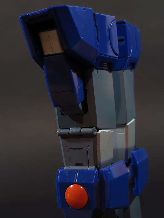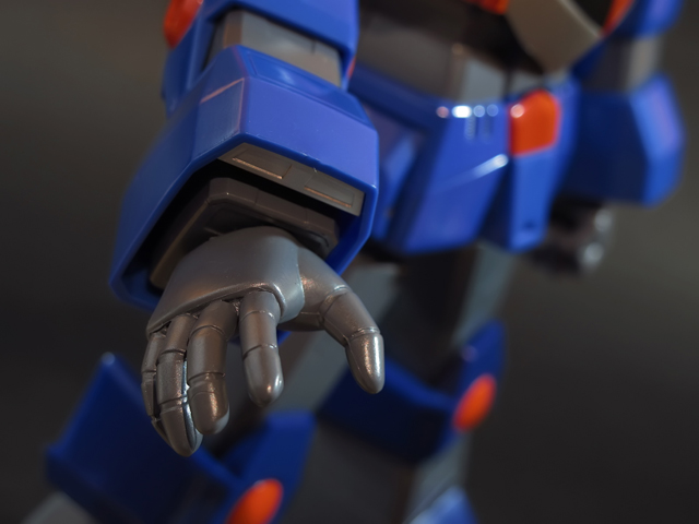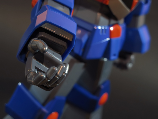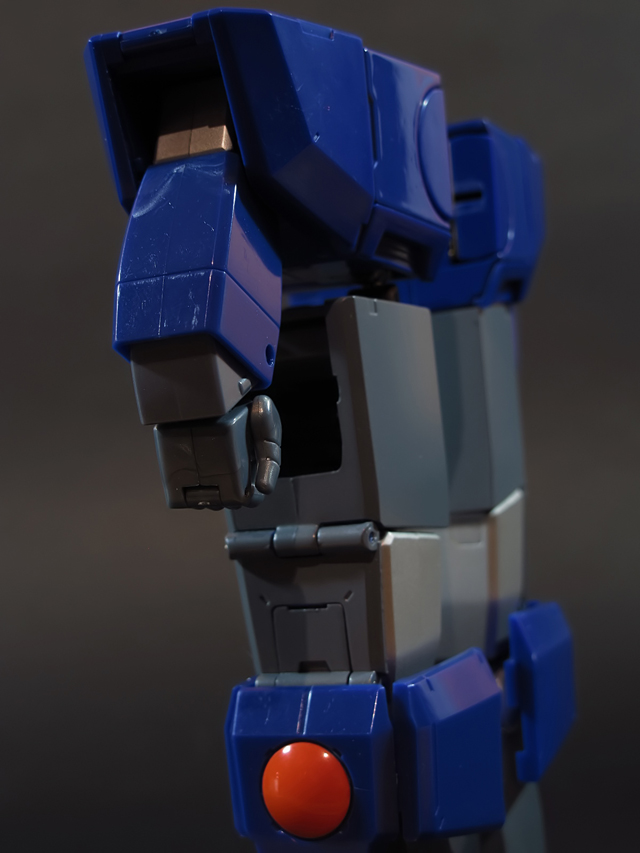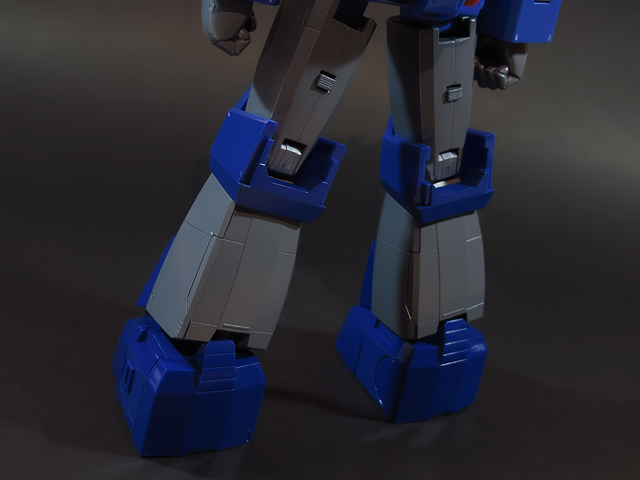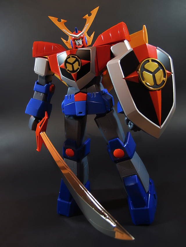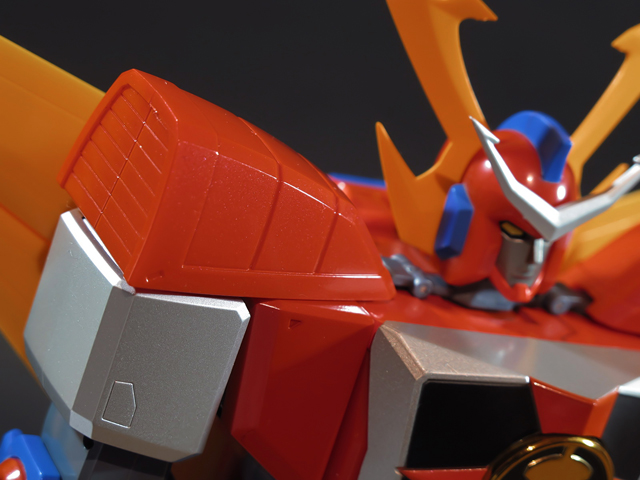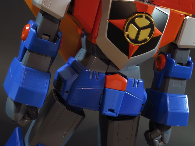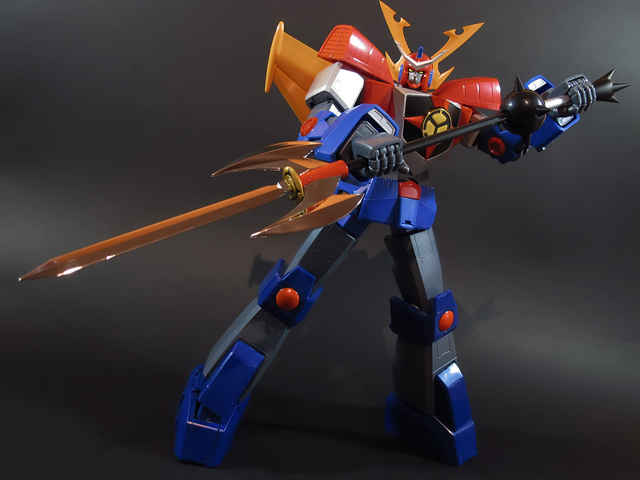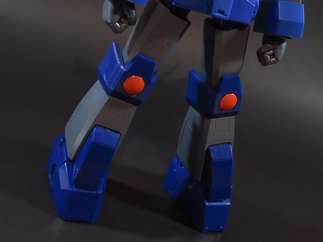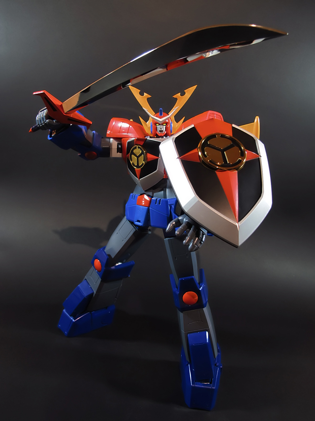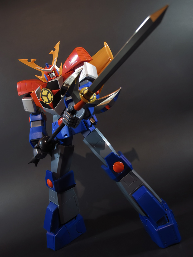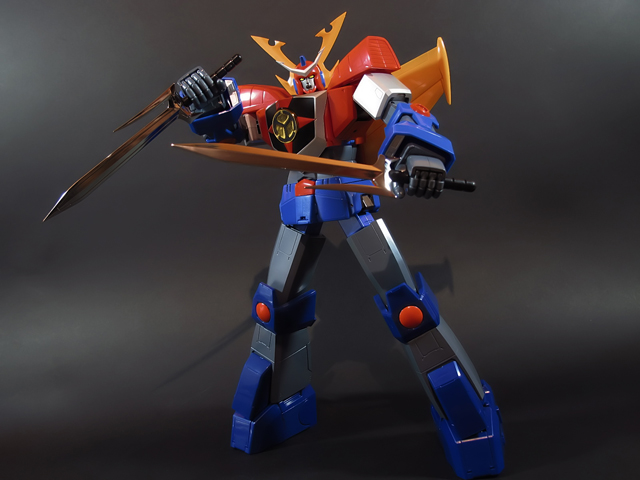 Bene, andiamo per gradi e cominciamo per ordine l’analisi dell’argomento principe di questa recensione: il gokin assemblato. Avviamo quindi la nostra disamina dal punto di partenza, e cioè la trasformazione del robot. Da questo punto di vista penso che stiamo parlando di quello che in assoluto è il vero, enorme punto di forza di questo chogokin. La conversione dei 3 mecha separati nelle varie parti del Daioja è qualcosa di sublime ed incredibilmente sorprendente, in particolar modo per la fedeltà all’anime, assolutamente ineccepibile al 1000% . Ed ecco che quasi per incantesimo, proprio come nel cartone, Ace Redder va a comporre torace e testa, Aoider diventa l’addome e le braccia e Cobalter si converte nelle gambe del grande Daioja. Se per soc trasformabili comunque assai validi una delle critiche più frequentemente ricorrenti era lo stravolgimento della reale sequenza di trasformazione (gruppo senza ombra di dubbio capeggiato dal controverso gx-43 Daimos) in questo caso penso che nessuno possa assolutamente eccepire niente. Davvero pazzesco il numero di comparti apribili, parti ribaltabili (carina l’idea del logo sul petto dell’Ace Redder, che riproduce una foglia come quelli sul petto di Aoider e Cobalter, ruotabile per riprodurre il logo del Daioja, che altro non è che il simbolo dell’unione delle 3 suddette foglie) e pannellini girevoli che in più punti arricchiscono il mecha senza il rischio di sfregamenti o graffi (purchè si abbia l’accortezza di seguire alla lettera il libretto di istruzioni) e che sottolineano uno studio più che minuzioso del connubio tra la fedeltà a quanto apprezzato in video ed un risultato estetico accettabile, sia per i 3 mecha scomposti che per il Daioja assemblato. Ovviamente sarebbe stato impossibile, per quest’ultimo, avere proporzioni assolutamente perfette, ecco che si è resa necessaria quindi la dotazione del modello in parti aggiuntive (come già avvenuto per il gx-46) indispensabili per renderne maggiormente proporzionate le fattezze. Tali parti sono costituite da spalle, coprispalle, gambe e superficie posteriore dei piedi. Fate però moltissima attenzione nell’applicazione delle coperture delle gambe, se non le si fanno combaciare perfettamente e si forza, il rischio è di sverniciare le gambe stesse (che non sono altro che le cosce del Cobalter). Bella anche l’unione delle ali dei 3 mecha in una sola grande ala per il Daioja. Disgraziatamente una delle due spalle rosse (le parti ai lati della pettorina per intenderci) mi si è letteralmente spappolata in mano dividendosi in due metà. Niente di grave ed istantaneamente riparabile con una semplice goccia di attack fortunatamente, ma nei vecchi SOC componibili queste cose non succedevano…. Ad ogni modo il risultato finale, di sicuro impatto estetico, è quello di un gigante dell’altezza di 29 cm per un peso, tutto sommato non così scarso, di 835 grammi. Uno dei principali dubbi che inizialmente attanagliava i collezionisti era relativo alla posabilità del modello una volta assemblato, non fosse altro che per l’estrema complessità della trasformazione. Bene, sotto questo punto di vista possiamo ammettere che il gx-61 ha passato la prova con una sufficienza abbondante. Le caviglie, ad attrito, sono estraibili e regolate da uno snodo praticamente analogo a quello già apprezzato nel gx-53 Daitarn 3, un piccolo cilindro localizzato nell’angolo posteriore interno del piede che permette, quando allungato, inclinazioni tutto sommato discrete (in questo caso minori di quelle della caviglia del gx-53 perché limitate dalle coperture delle gambe). Le ginocchia, a scatto, si flettono non oltre i 90 gradi. Per le anche (ad attrito) si deve fare invece un discorso a parte nel senso che presentano escursioni relativamente modeste (discreta abduzione, rotazione longitudinale nulla, estensione e flessione minime) se si lasciano applicati, al momento della trasformazione, i piedi del Cobalter. Se invece, come consigliato nel libretto di istruzioni, si ha l’accortezza di rimuovere questi ultimi, la musica cambia, e di molto, nel senso che l’articolazione finisce per guadagnare moltissimo in abduzione (in teoria il robot arriva a fare la spaccata), leggermente in flessione-estensione e minimamente in rotazione longitudinale anche se la sensazione (a onor del vero non confermata dai fatti) è che il modello possa pagare dazio a questa opzione almeno in termini di stabilità, apparentemente più precaria. La spalla è governata da una articolazione a scatto sia nei movimenti di rotazione (praticabili liberamente a 360 gradi) che in abduzione (estendibile poco oltre i 90 gradi). Le braccia ruotano longitudinalmente a 360 gradi all’attacco con la spalla ed i gomiti, a scatto, sono flessibili a 90 gradi. Le mani di base in dotazione ed alloggiate nei piedi dell’Aoider, sono articolate al polso con uno snodo a sfera ed hanno dita articolate separatamente alla base delle falangi. Sono sostituibili con 3 differenti paia di mani (chiuse a pugno, con palmo aperto e con foro centrale per l’impugnatura delle armi). La testa, articolata al torace con uno snodo a sfera, ha movimenti di rotazione dell’ampiezza di 120 gradi circa, si flette leggermente, non ha estensione ne’ flessione laterale. Nel complesso, concludendo, la posabilità del modello, considerata la complessità della sua trasformazione, non è neanche così male. Ciò che davvero in realtà è snervante (difetto confermato da molti ma non da tutti) è l’instabilità delle parti aggiuntive nei cambi di posa. Nel mio esemplare ogni tentativo di piegatura della caviglia o di abduzione della coscia si accompagna inevitabilmente alla caduta delle coperture delle gambe o a quella della parte posteriore del piede anche se devo sinceramente ammettere che ponendo particolare attenzione a far combaciare bene gli agganci tra la parte anteriore e quella posteriore delle coperture delle gambe la situazione un po’ è m