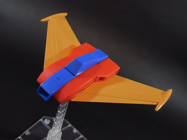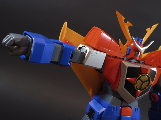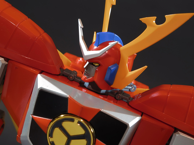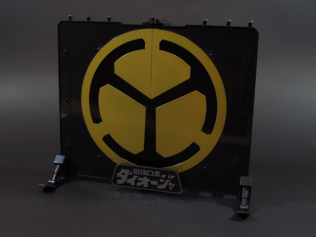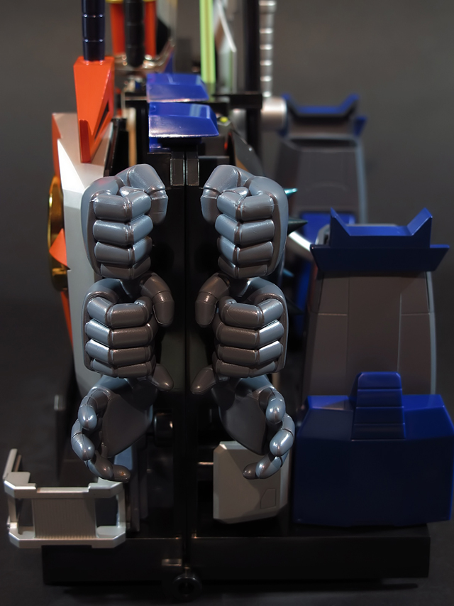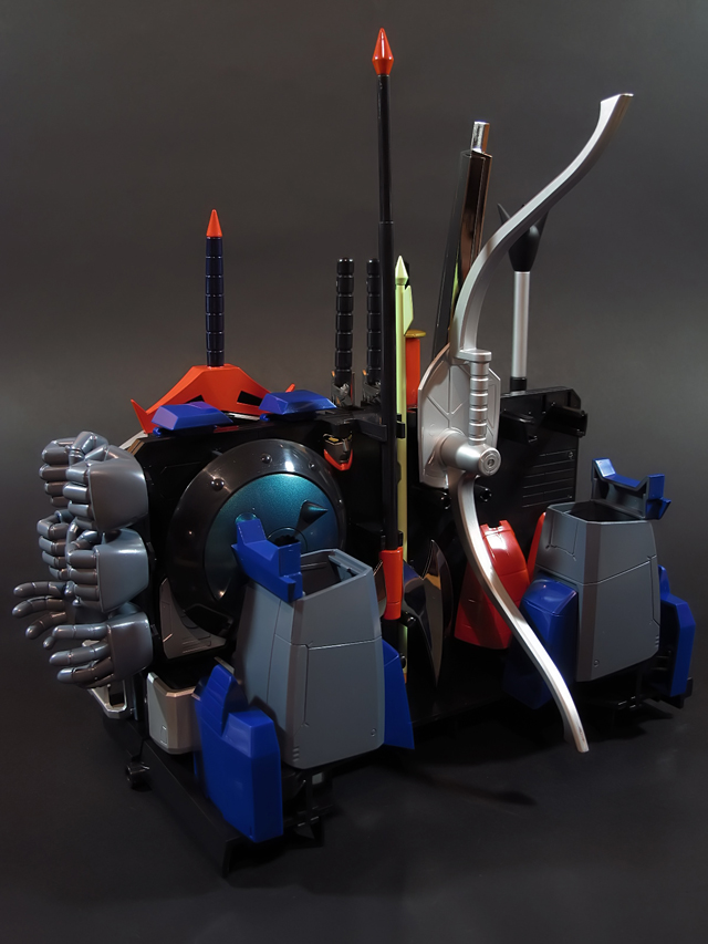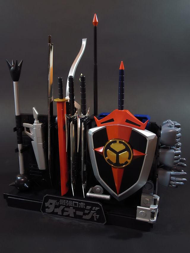 In questo caso penso sia giusto fare un piccolo cenno a parte relativamente allo stand espositivo di questo gx-61. Se infatti gli espositori dei precedenti SOC componibili/trasformabili con la verosimile unica eccezione del gx-34 non hanno mai brillato per fantasia e complessità, bisogna ammettere che stavolta Bandai ha fatto le cose per bene. In questo caso l’espositore infatti può essere adoperato in due modalità differenti dal momento che è costituito da due metà incernierate tra loro e quindi alternativamente apribili ad esporre il grande logo del robot per fare da sfondo allo stesso Daioja o richiudibili a libro l’una sull’altra per dare alloggiamento, come vero stand portaccessori, a tutte le mani, le parti aggiuntive e le armi (sia dei mecha scomposti che del Daioja) del modello.