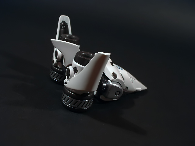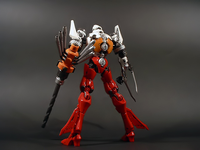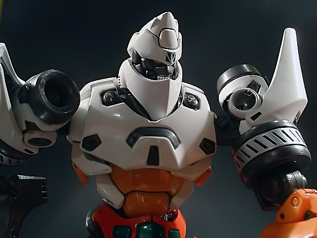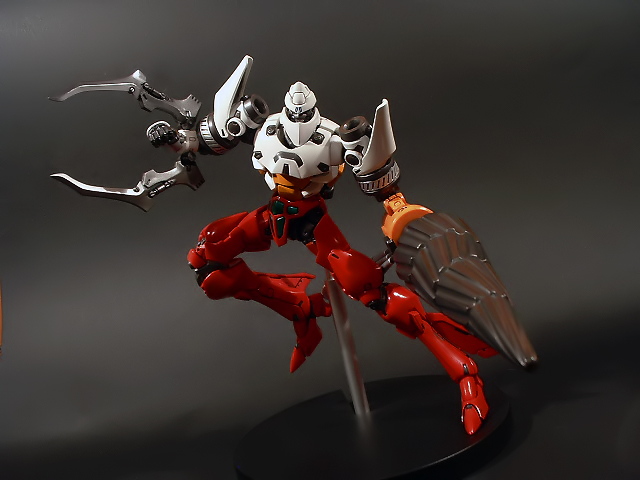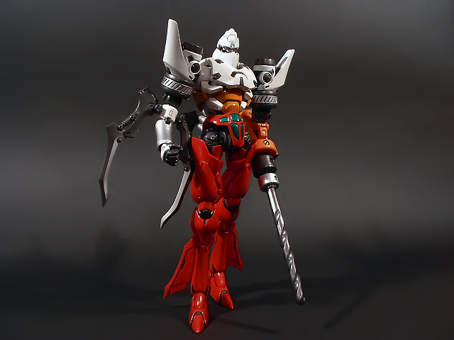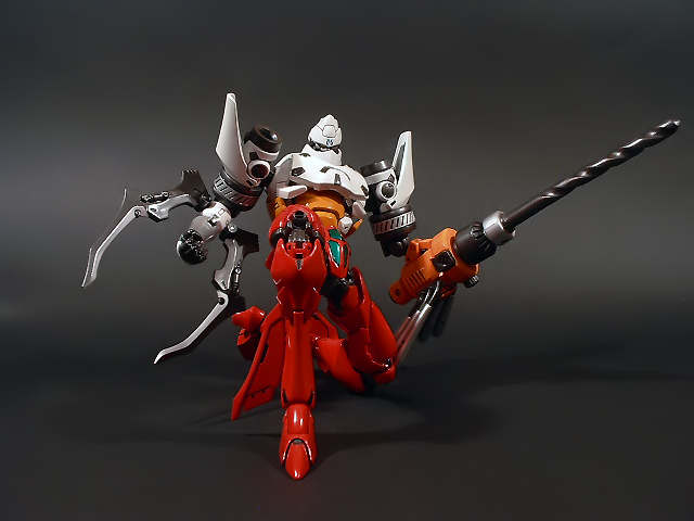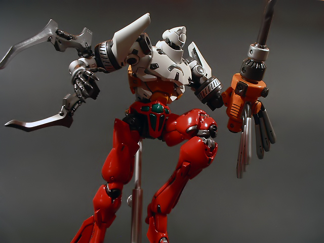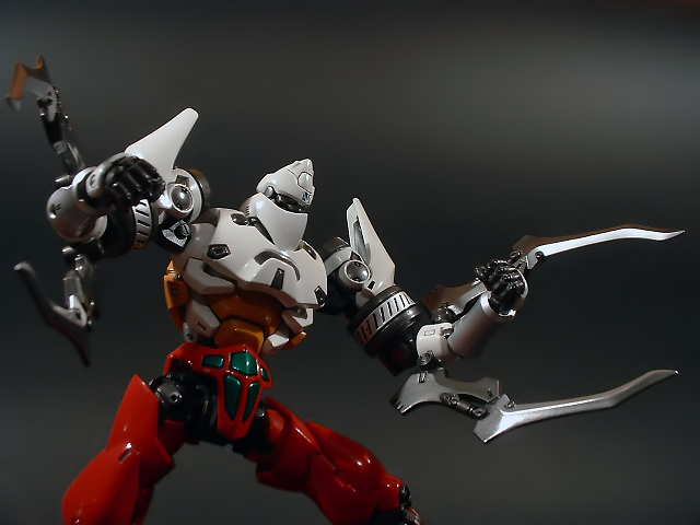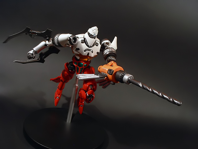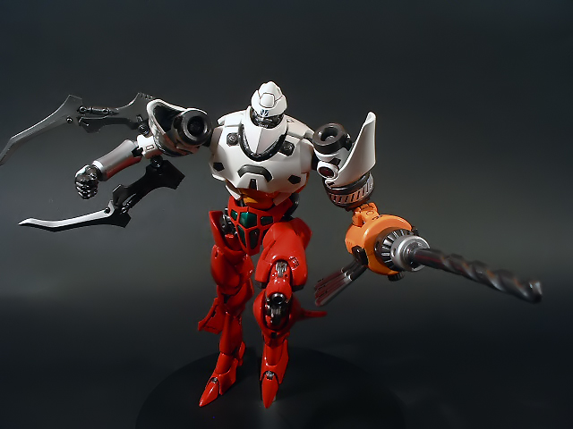 Altezza 25 centimetri per 625 grammi di peso, per testa, busto, spalle e dal ginocchio in giù abbiamo metallo, mentre braccia, trivelle, lame, alettoni e femori sono costruiti in plastica con alcuni particolari in gomma dura. Il livello di dettaglio è ottimo, anche le parti più piccole sono ben stilizzate, la verniciatura è di tonalità omogenea su tutto il modello e, cosa positiva, non si nota lo stacco di colore fra la plastica del femore e il metallo del resto della gamba. Nessuna sbavatura di colore sulla copia in mio possesso, però devo rilevare qualche piccolissimo grumo di vernice sulla Getmachine e dietro alla testa del Getter, nulla di eclatante comunque. La mobilità di questo Getter 2 Ex Gokin si attesta su buoni livelli, le gambe divaricano moltissimo grazie ad articolazioni a scatto molto potenti dando,teoricamente, al modello la possibilità di assumere pose molto dinamiche, peccato che le caviglie non godano di molta inclinazione. I piedi sono stretti quindi anche la superficie di appoggio non aiuta moltissimo nell’assicurare molta stabilità quando le gambe sono molto aperte. Abbiamo la possibilità di ruotare il femore sia internamente che esternamente, il ginocchio è dotato di doppio snodo, quando lo abbiamo piegato completamente entra in funzione la seconda articolazione che si trova proprio sopra di esso, questa fa si che la parte della gamba possa compiere una escursione all’indietro davvero notevole. Altra bella mossa è l’applicazione di un’articolazione separata per il movimento del bacino, mi spiego meglio, oltre alla normale possibilità di rotazione della gamba, possiamo inclinare avanti o indietro il solo bacino andando quindi a cercare il giusto equilibrio per la posa che abbiamo adottato in quel momento, questa soluzione è davvero molto gradita e non fa altro che donare sicurezza la dove i piedi non garantiscono una grande stabilità, diciamo che hanno compensato in parte il problema con questa soluzione. Le punte dei piedi sono snodate e si rendo molto utili quando il modello viene posizionato con un ginocchio a terra o viene messo in particolari posizioni mediante l’uso del Display Stand. Il busto del Getter 2 ha la possibilità di ruotare a destra e sinistra, anche qui doppio movimento grazie alla separazione in due parti distinte, possiamo ruotare molto la parte addominale, ma un po’ meno quella del torace, attenzione qui allo sfregamento con la parte rossa del bacino, ruotando troppo le parti vanno a sfregare una contro l’altra e di conseguenza si potrebbe incorrere in graffiature sulla vernice. Le braccia ruotano completamente, posso essere orientate in qualsiasi posizione si voglia grazie allo snodo a disco posto sotto alla spalla. Oltre alla rotazione è presente anche l’articolazione che permette la piega dell’avambraccio, ma anche per questa parte del corpo la Fewture ha concepito un doppio movimento disassando il gomito del Getter 2. Dove dovrebbe esserci di fatto il gomito c’è una parte rotonda che ospita l’aggancio delle lame laterali, quindi le due articolazioni che consentono il movimento sono poste sopra e sotto questa parte, in pratica piegando completamente l’avambraccio si ottiene quasi un’innaturale chiusura ad U. Anche le spalle godono di buona mobilità, possono avanzare in avanti ed arretrare oltre ad essere allargate notevolmente, essendo costruite in metallo lo snodo che permette i movimenti è a scatto, questo per garantirne la resistenza nel corso del tempo. Indovinate un po’, anche la testa ha doppio movimento, la parte superiore con la faccia del Getter s’inclina in alto ed in basso, mentre la copertura del collo compie anche il movimento d’inclinazione laterale. Il discorso della posabilità va obbligatoriamente scisso in due parti diverse, come ho scritto poche righe sopra le pose a terra non garantiscono molta sicurezza al modello, anche perché il peso del busto tende a schiacciare a terra il Getter 2 provocando un’ulteriore apertura delle gambe che qualche volta scivolano lasciando cadere il modello…..a me è capitato diverse volte purtroppo. Ben più sicura quindi diventa l’esposizione e la stabilità usando l’apposito Display Stand che troviamo nella confezione, qui ci si può davvero sbizzarrire nel replicare pose dinamiche veramente belle, il Getter è praticamente ancorato al supporto grazie al bloccaggio con incastro al bacino e chiusura a vite, quindi non c’è il mino pericolo di caduta del modellino, addirittura lo si può lasciare sospeso da terra senza alcun problema! Certamente l’ingombro aumenta parecchio dato che lo Stand non è piccolo avendo un diametro di 18 centimetri, ma io ne consiglio vivamente l’uso per evitare brutte sorprese! Gli accessori, come citato prima, sono in plastica e gomma dura, le lame che si agganciano alle braccia hanno un piccolo perno maschio che si aggancia alla sede posta ai lati dell’avambraccio, una volta montate possono essere anche allargate. Due trivelle per il nostro Getter 2, il fissaggio dell’accessorio avviane ad incastro, si smonta l’avambraccio desiderato e si applica l’estensione a trivella. Esteticamente molto bella con all’esterno 6 tubi di scarico come a voler sottolineare che all’interno ci sia un potente motore…diavolo di un Sato………Le punte in dotazione sono due, la più piccola ricorda praticamente una punta da trapano ed è parte integrante dell’accessorio, la seconda è molto più grande ed ha la classica forma a cono e va ad incastrarsi sopra a quella più piccola, in questo modo si ottiene un’enorme trivella dall’aspetto davvero devastante lunga ben 25 centimetri! Bisogna sottolineare però un aspetto negativo, montando la trivella più grande il peso aumenta e il braccio del Getter cede miseramente facendo cascare l’enorme accessorio, qui sarebbe stato molto utile un’articolazione a scatto che avrebbe certamente evitato il problema del peso. I pugni in dotazione sono interamente 