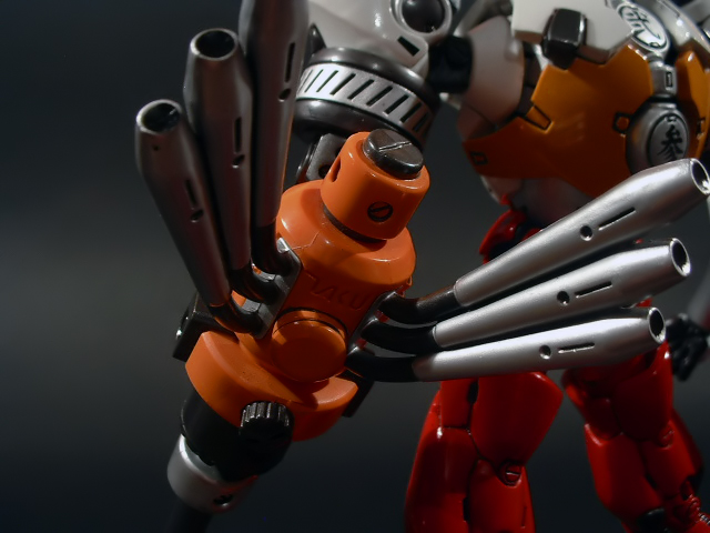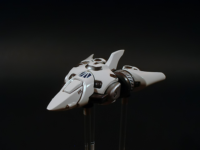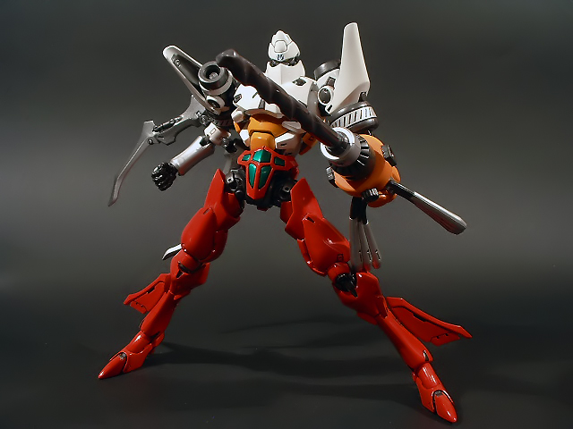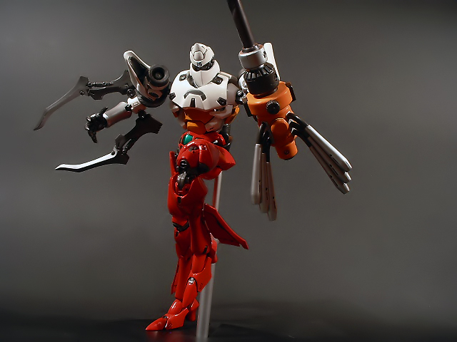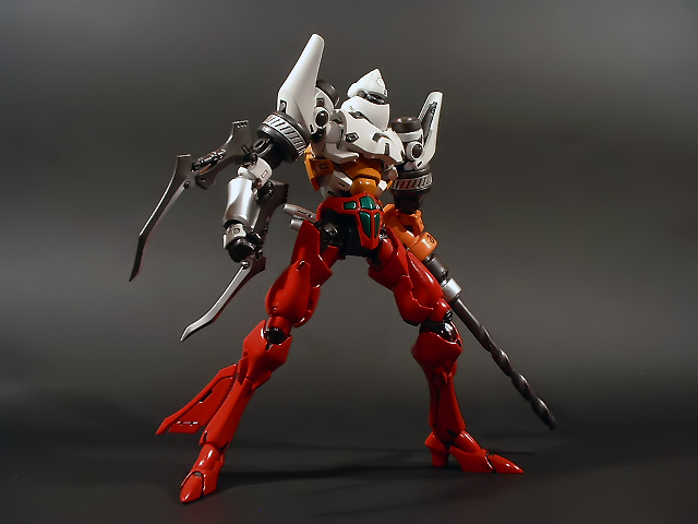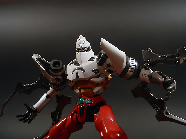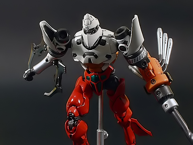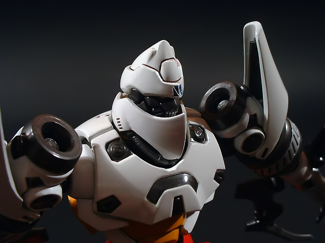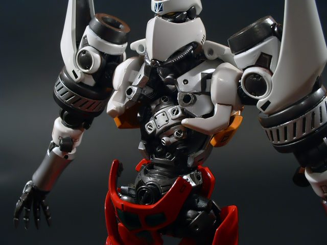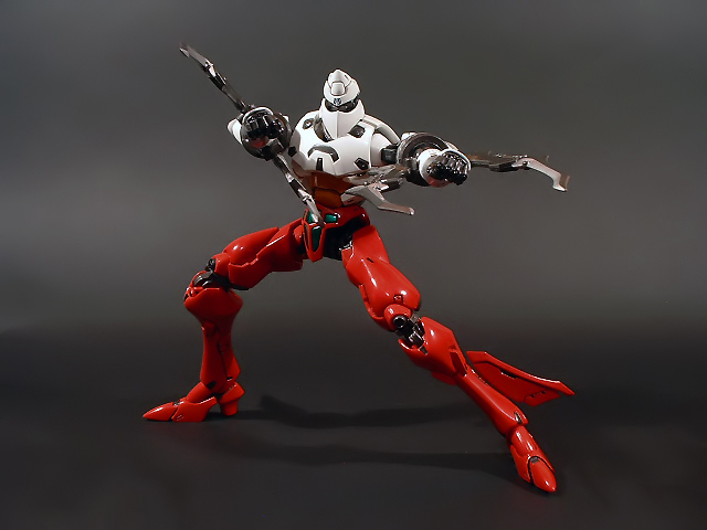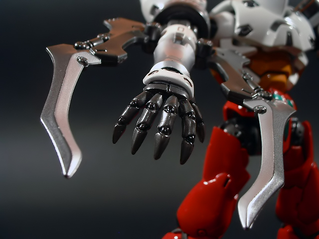 Altezza 25 centimetri per 625 grammi di peso, per testa, busto, spalle e dal ginocchio in giù abbiamo metallo, mentre braccia, trivelle, lame, alettoni e femori sono costruiti in plastica con alcuni particolari in gomma dura. Il livello di dettaglio è ottimo, anche le parti più piccole sono ben stilizzate, la verniciatura è di tonalità omogenea su tutto il modello e, cosa positiva, non si nota lo stacco di colore fra la plastica del femore e il metallo del resto della gamba. Nessuna sbavatura di colore sulla copia in mio possesso, però devo rilevare qualche piccolissimo grumo di vernice sulla Getmachine e dietro alla testa del Getter, nulla di eclatante comunque. La mobilità di questo Getter 2 Ex Gokin si attesta su buoni livelli, le gambe divaricano moltissimo grazie ad articolazioni a scatto molto potenti dando,teoricamente, al modello la possibilità di assumere pose molto dinamiche, peccato che le caviglie non godano di molta inclinazione. I piedi sono stretti quindi anche la superficie di appoggio non aiuta moltissimo nell’assicurare molta stabilità quando le gambe sono molto aperte. Abbiamo la possibilità di ruotare il femore sia internamente che esternamente, il ginocchio è dotato di doppio snodo, quando lo abbiamo piegato completamente entra in funzione la seconda articolazione che si trova proprio sopra di esso, questa fa si che la parte della gamba possa compiere una escursione all’indietro davvero notevole. Altra bella mossa è l’applicazione di un’articolazione separata per il movimento del bacino, mi spiego meglio, oltre alla normale possibilità di rotazione della gamba, possiamo inclinare avanti o indietro il solo bacino andando quindi a cercare il giusto equilibrio per la posa che abbiamo adottato in quel momento, questa soluzione è davvero molto gradita e non fa altro che donare sicurezza la dove i piedi non garantiscono una grande stabilità, diciamo che hanno compensato in parte il problema con questa soluzione. Le punte dei piedi sono snodate e si rendo molto utili quando il modello viene posizionato con un ginocchio a terra o viene messo in particolari posizioni mediante l’uso del Display Stand. Il busto del Getter 2 ha la possibilità di ruotare a destra e sinistra, anche qui doppio movimento grazie alla separazione in due parti distinte, possiamo ruotare molto la parte addominale, ma un po’ meno quella del torace, attenzione qui allo sfregamento con la parte rossa del bacino, ruotando troppo le parti vanno a sfregare una contro l’altra e di conseguenza si potrebbe incorrere in graffiature sulla vernice. Le braccia ruotano completamente, posso essere orientate in qualsiasi posizione si voglia grazie allo snodo a disco posto sotto alla spalla. Oltre alla rotazione è presente anche l’articolazione che permette la piega dell’avambraccio, ma anche per questa parte del corpo la Fewture ha concepito un doppio movimento disassando il gomito del Getter 2. Dove dovrebbe esserci di fatto il gomito c’è una parte rotonda che ospita l’aggancio delle lame laterali, quindi le due articolazioni che consentono il movimento sono poste sopra e sotto questa parte, in pratica piegando completamente l’avambraccio si ottiene quasi un’innaturale chiusura ad U. Anche le spalle godono di buona mobilità, possono avanzare in avanti ed arretrare oltre ad essere allargate notevolmente, essendo costruite in metallo lo snodo che permette i movimenti è a scatto, questo per garantirne la resistenza nel corso del tempo. Indovinate un po’, anche la testa ha doppio movimento, la parte superiore con la faccia del Getter s’inclina in alto ed in basso, mentre la copertura del collo compie anche il movimento d’inclinazione laterale. Il discorso della posabilità va obbligatoriamente scisso in due parti diverse, come ho scritto poche righe sopra le pose a terra non garantiscono molta sicurezza al modello, anche perché il peso del busto tende a schiacciare a terra il Getter 2 provocando un’ulteriore apertura delle gambe che qualche volta scivolano lasciando cadere il modello…..a me è capitato diverse volte purtroppo. Ben più sicura quindi diventa l’esposizione e la stabilità usando l’apposito Display Stand che troviamo nella confezione, qui ci si può davvero sbizzarrire nel replicare pose dinamiche veramente belle, il Getter è praticamente ancorato al supporto grazie al bloccaggio con incastro al bacino e chiusura a vite, quindi non c’è il mino pericolo di caduta del modellino, addirittura lo si può lasciare sospeso da terra senza alcun problema! Certamente l’ingombro aumenta parecchio dato che lo Stand non è piccolo avendo un diametro di 18 centimetri, ma io ne consiglio vivamente l’uso per evitare brutte sorprese! Gli accessori, come citato prima, sono in plastica e gomma dura, le lame che si agganciano alle braccia hanno un piccolo perno maschio che si aggancia alla sede posta ai lati dell’avambraccio, una volta montate possono essere anche allargate. Due trivelle per il nostro Getter 2, il fissaggio dell’accessorio avviane ad incastro, si smonta l’avambraccio desiderato e si applica l’estensione a trivella. Esteticamente molto bella con all’esterno 6 tubi di scarico come a voler sottolineare che all’interno ci sia un potente motore…diavolo di un Sato………Le punte in dotazione sono due, la più piccola ricorda praticamente una punta da trapano ed è parte integrante dell’accessorio, la seconda è molto più grande ed ha la classica forma a cono e va ad incastrarsi sopra a quella più piccola, in questo modo si ottiene un’enorme trivella dall’aspetto davvero devastante lunga ben 25 centimetri! Bisogna sottolineare però un aspetto negativo, montando la trivella più grande il peso aumenta e il braccio del Getter cede miseramente facendo cascare l’enorme accessorio, qui sarebbe stato molto utile un’articolazione a scatto che avrebbe certamente evitato il problema del peso. I pugni in dotazione sono interamente 