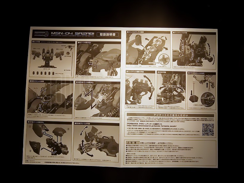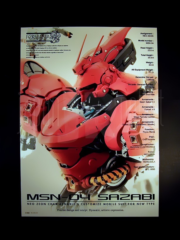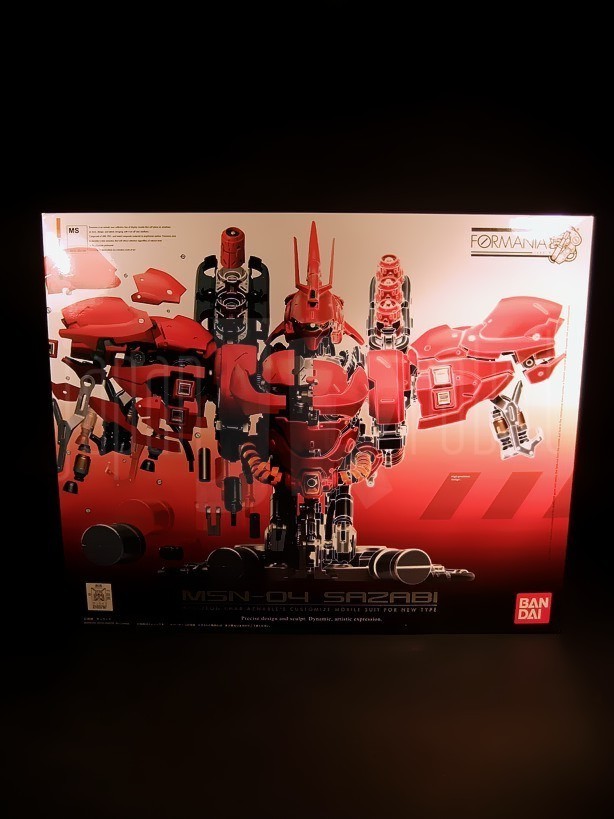 La scatola è abbastanza voluminosa per un oggetto non poi così grande (29 x 25 x 20 cm) ed ha un peso abbastanza contenuto, pari a 1160 grammi. Il design è davvero elegante. Sull’anteriore è ritratto il Sazabi stesso, una metà assemblata, l’altra scomposta nelle singole piastre e componenti che lo costituiscono. A destra sono presenti nell’angolo in alto il logo Formania ed in basso quello Bandai. Sul versante posteriore l’artwork ricalca quello del precedente Nu Gundam con due immagini, frontale e posteriore, del busto illustranti i possibili movimenti di spalle, backpack, tronco e reattori e costellate da una miriade di piccoli riquadri focalizzati sui dettagli più fini (cockpit, vani apribili, mezzo di riparazione, reattori, pannelli apribili dei funnels) principalmente tesi ad illustrarne l’estrema cura dei piccoli particolari. Sul laterale sinistro, come da tradizione, sono riassunte le caratteristiche tecniche relative a codice identificativo, altezza, peso, potenza, armamentario, anno di produzione, casa produttrice, esercito di assegnazione e pilota. Eleganti i piccoli adesivi con logo Formania che bloccano i lati apribili della scatola.
