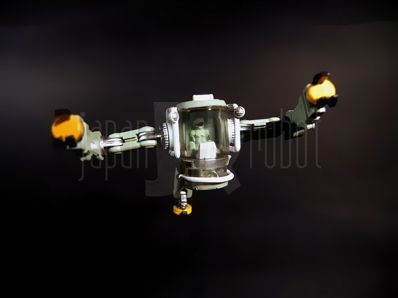 Il coperchio, molto spesso, presenta un alloggiamento centrale in cui, nella classica bustina di plastica trasparente sono accolti un cartoncino plastificato a colori con le specifiche tecniche già riassunte sull’esterno della confezione ed un foglio in bianco e nero piegato in 2 con le istruzioni relative a movimenti e compartimenti apribili. Tolto il coperchio dopo la rimozione delle larghe strisce di scotch che lo assicurano al resto del contenitore lungo i suoi 2 lati più lunghi, si accede al vano principale il cui alloggiamento centrale è occupato dal busto senza spalle, sistemate ai lati di questo. In alto i 6 funnels agganciabili al backpack sono accolti in vani separati. Al di sopra delle spalle si trovano rispettivamente a sinistra ed a destra il mezzo di riparazione a corredo e la relativa basetta di appoggio. Sotto al busto l’asticella per mantenere in sospensione il suddetto mezzo. Ogni singolo elemento è protetto dalla relativa bustina di plastica trasparente.