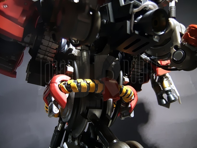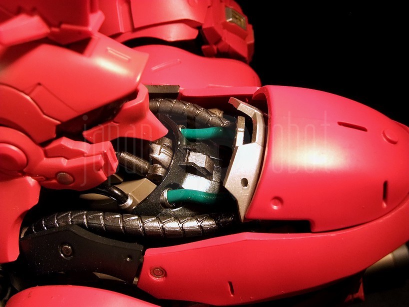 Più voluminoso rispetto a quello del Nu Gundam, questo busto si caratterizza per un’altezza oscillante tra 18.5 e 23 cm all’apice dell’antenna centrale (variabile in rapporto al grado di estensione del collo e del tronco) ed una larghezza di 26 cm (dall’estremo di una spalla a quello opposto) per un peso di 637 grammi. La composizione è quasi interamente in plastica, le uniche parti metalliche si localizzano infatti esclusivamente a livello del piedistallo (in pratica sono in metallo le parti grigie più chiare ed i cilindri dei 3 pistoncini (2 anteriori ed 1 posteriore) scorrevoli). La cura dei dettagli è veramente notevole, nelle pannellature, nella riproduzione del cockpit, dei fasci di cavi e tubature e degli ingranaggi nonché nelle markerizzazioni sul backpack. La verniciatura è altrettanto ben curata e senza sbavature di rilievo, certamente migliore di quella già buona ma con qualche piccolo-medio neo del Nu Gundam. Le spalle si agganciano a pressione e sono ruotabili ad attrito a 360 gradi, ciascuna è scomponibile in 3 pannelli l’anteriore dei quali soffre di una certa instabilità per cui non è infrequente che maneggiando la parte tenda a sganciarsi spontaneamente. Nessun problema di questo tipo invece per il pannello superiore e quello posteriore, anch’essi rimovibili. Anche il rivestimento della parte superiore del petto è staccabile, questo permette di scoprire tutta una serie di tubature, pistoni e circuiti variamente intrecciati tra loro e davvero ben riprodotti. La parte superiore della testa è ribaltabile, così come la visiera con il relativo cursore in modo da lasciare scoperto il cockpit ed il sedile del pilota. La testa ha escursioni solo sul piano sagittale con movimenti di flesso-estensione e senza rotazione laterale (a differenza del Nu Gundam), bella la possibilità di spostare il cursore da destra a sinistra e viceversa. Il tronco è a sua volta flessibile (articolazione ad attrito) all’attacco con il piedistallo dove intelligente è l’utilizzo di tubature di pvc morbido e quindi adattabili alle escursioni articolari senza rischio di rottura. Il backpack è mobile all’aggancio con la schiena del robot dove può essere regolato in inclinazione con una articolazione a scatto (2 scatti e 3 possibili posizioni). Il suo corpo centrale è dotato di un paio di sportellini apribili. I due elementi laterali sono ruotabili sul piano sagittale e parzialmente ripiegabili medialmente ed abducibili lateralmente. Sulla loro superficie superiore, con pannellature scorrevoli, sono applicabili i sei funnels (si appoggiano e sono 3 per lato), una delle armi più potenti e temibili del Mobile Suit. Questi ultimi sono a loro volta molto dettagliati e dotati di 4 pannelli apribili proprio come nell’anime. Qualche segno di distacco dalle sprue di troppo è stato furbescamente celato localizzandolo sulle parti grigie più interne o che rimangono nascoste sotto i rivestimenti rimovibili. Il mezzo di supporto è ben verniciato, ha il tettuccio apribile, ha le 3 braccia snodate ed è interamente in pvc. Intelligente l’idea di mettere a corredo la basetta con relativa asta d’appoggio per permetterne l’eposizione in volo così da simulare le operazioni di riparazione del Mobile Suit.