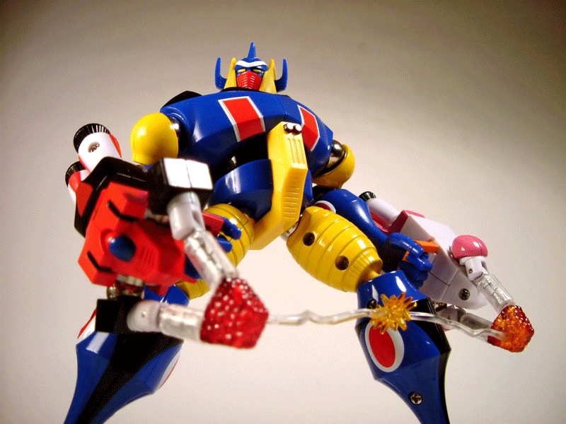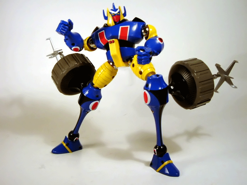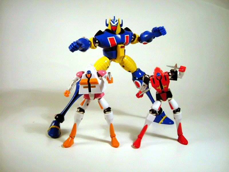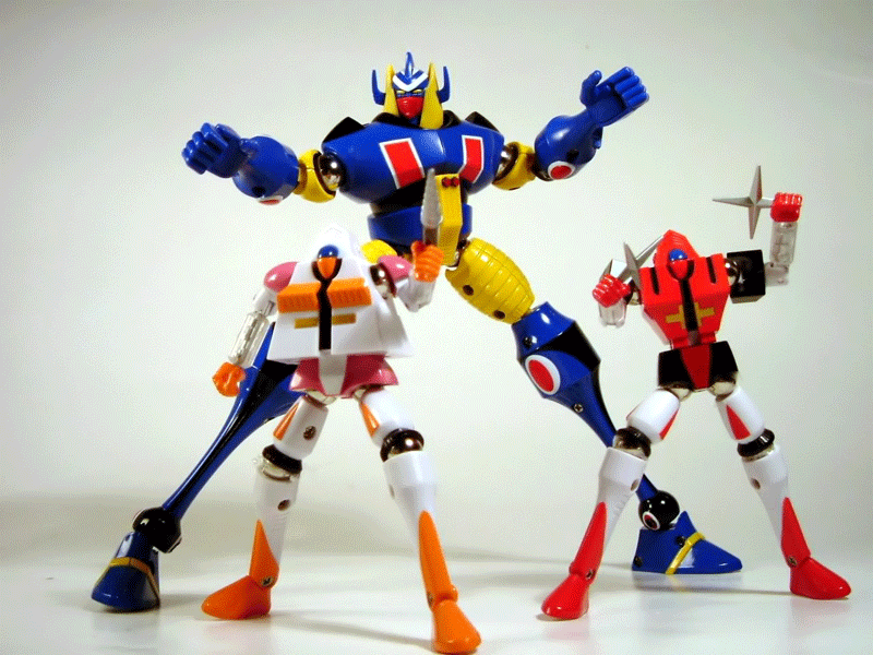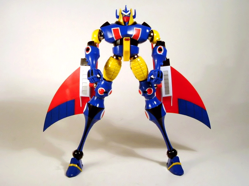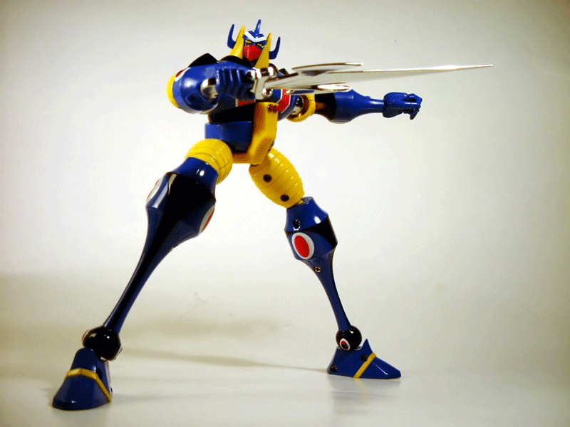 Partiamo subito con i dati tecnici. Il modello è alto 18 cm per un peso, senza accessori, di 206 grammi.Le parti in metallo sono gli arti inferiori (per intero, piedi compresi) e le spalle. Tronco avambracci e testa sono invece in plastica. La stragrande maggioranza del peso del modello è in pratica concentrata dalla vita in giù. Le proporzioni sono assolutamente perfette, il modello è Gakeen, in tutto e per tutto e i dettagli sono curati in modo assai minuzioso sin nei minimi particolari con una verniciatura assolutamente impeccabile, perfetta in tutto e apparentemente resistente. Considerato che avevo aperto il Baldios prima del Gakeen sono rimasto sorpresissimo della assoluta discrepanza tra il curatissimo dettaglio di questo modello e la scarsissima cura impiegata in tal senso nel Baldios tanto da lasciar pensare, se uno non lo sapesse, che si tratta di toys prodotti da case diverse e non dalla stessa ditta (tra l'altro quasi in contemporanea). E veniamo adesso all'inevitabile confronto con un altro modello a magneti recentemente prodotto, il gx-42 Kotetsu Shin Jeeg di Bandai. Certamente il Gakeen ha una tenuta delle calamite ben più potente di quella del gx-42, si fa una certa fatica a staccare le gambe e le braccia dal tronco, indicando come la potenza delle calamite sia più rassicurante di quella modello Bandai. Purtroppo però anche in questo caso esiste la magagna: le cosce si allargano molto e le caviglie si piegano moltissimo per cui la posabilità sembrerebbe ottima ma così purtroppo non è per il semplice motivo che i piedi del modello sono interamente in metallo tendendo quindi a scivolare su qualsiasi superficie vengano poggiati facendo esibire il nostro eroe in spaccate degne della migliore Carla Fracci, aiutato in tal senso dal fatto che nonostante la potenza delle calamite alle anche la superficie liscia delle sfere tende comunque a scivolare nel suo alloggiamento. Un paio di feltri sotto la pianta del piede avrebbero risolto in questo caso qualsiasi problema a differenza dello Shin Jeeg in cui rappresentavano una toppa insufficiente a nascondere le ben più complesse falle del gokin. Tra i due modelli quindi vince certamente il Gakeen, ma anch'esso non è esente da pecche ed è un peccato soprattutto considerato il prezzo del modello. E' comunque possibile porre rimedio (anche se sembra assurdo dover mettere mano a un modello da più di 200 euro) con un paio di striscioline di scotch di carta così da aumentare l'attrito delle piante dei piedi sulle superfici di appoggio, in questo modo avrete in pochi minuti un Gakeen iperposabile e stabilissimo. Per aumentare la tenuta delle anche può essere invece sufficiente un doppio strato del normale cellophane da cucina a rivestire le sfere, visivamente non lo si nota e rende il modello solido come la roccia. A proposito dei piedi dobbiamo ricordare la piccola chicca del piede tagliente, la tipica lama che fuoriesce dalla pianta e che nel modello è estraibile. L'articolazione del ginocchio è a scatto ed è costituita da un perno in plastica incastrato in un alloggiamento di gomma all'interno della gamba. Inizialmente ho avuto difficoltà a piegare il ginocchio anche se i rischi di rottura del perno son praticamente nulli perchè se l'alloggiamento resta bloccatonella gamba il perno stesso fuoriesce (essendo l'alloggiamento in gomma) senza spezzarsi. Ho potuto mobilizzare l'articolazione semplicemente usando come leva il cappuccio di una bic e flettendo con forza il ginocchio. Fatta questa manovra per 2-3 volte l'articolazione si allenta e diventa libera di flettersi a 90 gradi. Brutto il particolare della linea di giunzione tra le due metà proprio sulla superficie anteriore della coscia evidentemente dettata da necessità tecniche. L'articolazione calamitata dell'anca è stata progettata in modo intelligente dal momento che la sfera di metallo non è fissa ma parzialmente estraibile così da permettere maggiori escursioni e soprattutto la possibilità di una flessione a 90 gradi, necessaria per mettere il modello in posizione seduta alla guida del Variant. Le spalle ruotano liberamente a 360 gradi ma i movimenti di abduzione sono limitati proprio per la conformazione dell'articolazione dal momento che spostando lateralmente la spalla il suo movimento viene a essere bloccato dal contatto col tronco. I pugni sono sparanti e maneggiando il modello per modificarne posa saltano che è una bellezza, hanno dita snodate fatta eccezione per il pollice che è fisso. Carino il dettaglio degli artigli d'acciaio estraibili dal dorso ma anche in questo caso, come nel Baldios, l'eccessiva parsimonia di CM'S nella dotazioni in mani si è fatta sentire: un solo paio!!! La testa essendo calamitata ruota completamente ed ha anche una buona capacità di estensione consentendo la riproduzione delle pose di volo. I due piccoli robot Plyzer e Mighty sono quasi totalmente in plastica, sono anch'essi calamitati (a livello di ginocchia, anche e spalle), sono curatissimi e riprodotti con precisione assai encomiabile. Bello il dettaglio del tronco apribile (nella serie anime questo si chiude quando i robot si trasformano nei razzi di supporto del Gakeen). Peccato che la loro posa sia difficoltosissima dal momento che alle anche, ma soprattutto alle ginocchia, la potenza delle calamite è così esigua da vincolare in modo del tutto insufficiente le suddette articolazioni. Questo problema, nel mio esemplare, è più accentuato nel Plyzer. Gli accessori sono completamente in metallo e in parte calamitati (le ali supersoniche sono agganciabili alle parti aggiuntive delle gambe e al Variant con attacco calamitato), hanno una verniciatura nel complesso buona. Tra di essi i miei preferiti rimangono le alabarde, la spada, le ali supersoniche e la lama atomica. Il Variant è enorme e detta sinceramente l'ho estratto dalla scatola solo per scattare le foto, subito dopo è ritornato nel suo alloggiamento dal quale non credo che lo farò più uscire dal mo