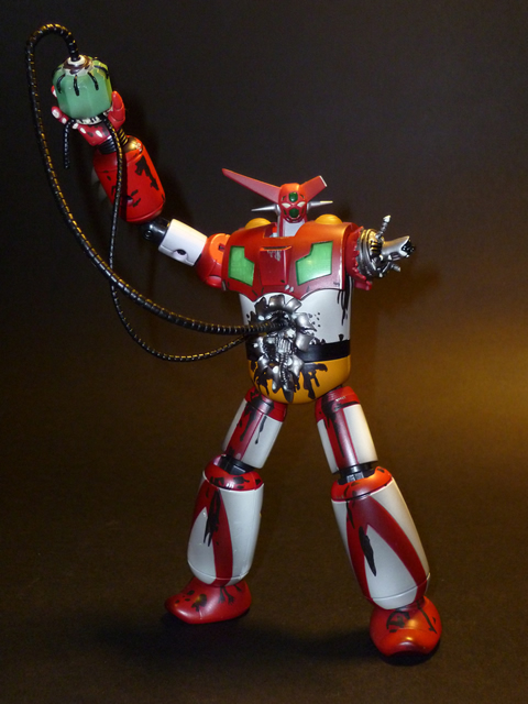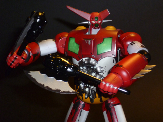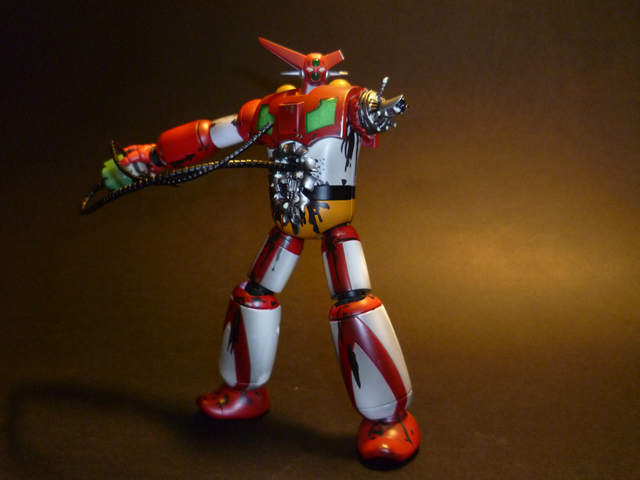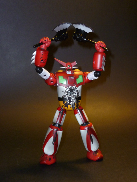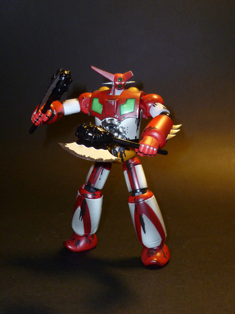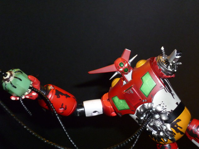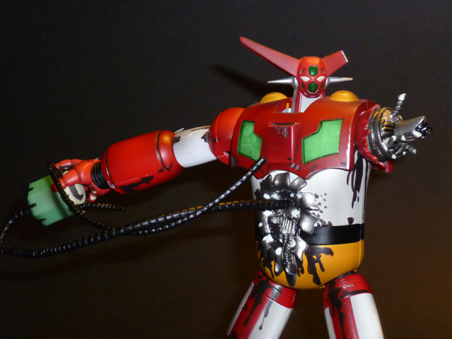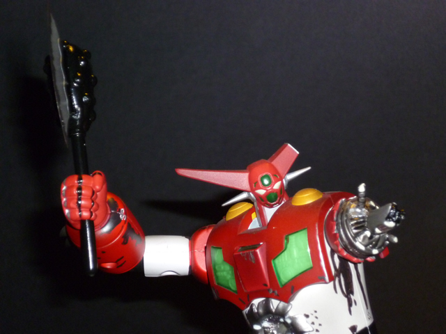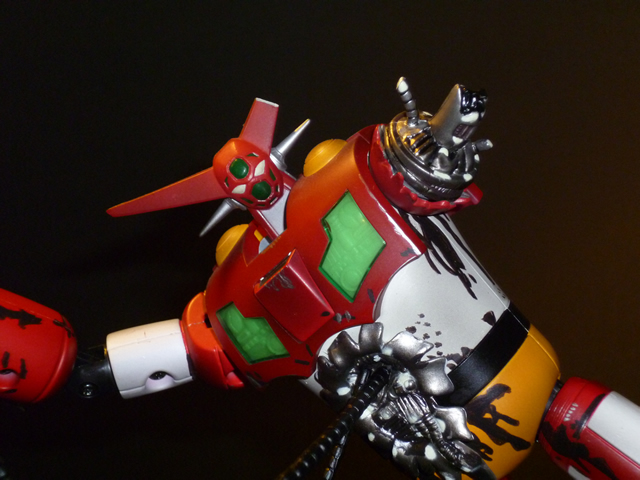 Purtroppo le linee che tendono a marcarne l’utilizzo in battaglia e della rottura del robot son fin troppo nette in alcuni punti e sembrano disegnate a pennarello. Molto meglio invece la rottura nel petto che sia come colore che come forma dà la sensazione di “estrazione”. Una delle “corna” del getter è spezzata ed anche li però l’effetto non è egregio, meglio invece l’effetto sporco sulle “antenne” laterali e sulla testa. L’effetto sporco generale invece rende meglio e si nota che la ditta in questione ha già dato prova della sua bravura in questo senso, tano è vero che l’effetto sporco/usato ricercato è abbastanza riuscito.