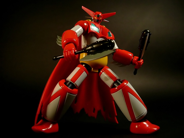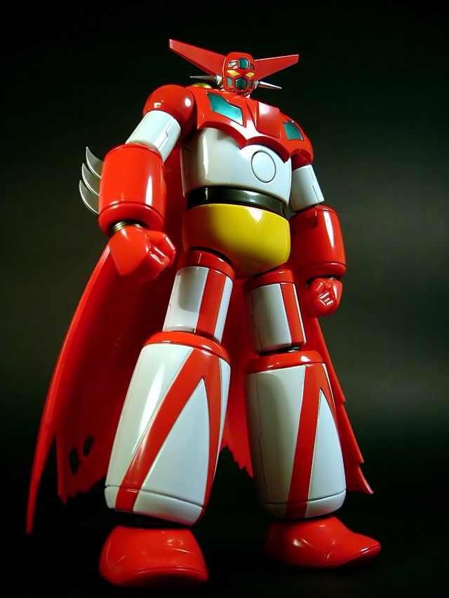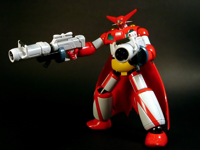 e presentano una buona mobilità. Il collo ha due punti di snodo, uno all'aggancio con lapettorina, l'altro all'attacco con la testa. La testa ruota liberamente a 360 gradi, ha una buona flessione ed una modesta estensione con una ottima flessione laterale. Il mantello può essere applicato abbastanza agevolmente agganciandolo nell'alloggiamento localizzato sotto alla pettorina. E' in plastica rigida e soffre di una certa instabilità se non lo si fissa a fondo. Personalmete si fa preferire a quello che correda il getter 1 Aoshima in gomma morbida e che, a mio modo di vedere, è sin troppo corto. Per quanto riguarda gli altri accessori e in particolar modo i fucili c'è da dire che fa finalmente piacere poter mettere in collezione un getter 1 OAV in grado di impugnarli mantenendoli paralleli all'avambraccio, cosa praticamente impossibile per come questi erano stati concepiti nel modello Aoshima. Non presentano difetti di verniciatura ed hanno il caricatore arretrabile. Originale l'idea del getter beam applicabile all'addome come placchetta a pressione grazie a un sistema a molla che consente l'arretramento dello sportellino sull'addome, ma in questo caso non saprei se preferire questo o lo sportellino apribile tramite la pressione di un pulsante sulla schiena ideato da Aoshima (trovo in entrambe i casi l'accessorio/gimmick relativamente inutile). Carina e funzionale la basetta espositiva, ma niente di nuovo o sconvolgente rispetto a quanto visto in precedenza. Passando per un attimo all'aspetto estetico del modello e lodandone quella che a mio avviso è una notevole fedeltà alla controparte animata, si deve constatare anche in questo caso e per l'ennesima volta come quelli di Bandai siano allergici all'uso di tappini coprivite o alla fornitura con il modello di questi ultimi con il brutto effetto groviera della veduta posteriore del nostro robot. Se è vero che nessuno espone di schiena i propri gokin è altrettanto vero che a Bandai non costerebbe davvero nulla corredarlo di un set di tappi coprivite. In questo caso se non altro potrà giungere in aiuto il mantello, in grado di mascherare diverse di queste brutture. Come detto in apertura, dato che le recensioni sono spesso fatte per dare consigli e guidare all'acquisto i lettori, credo che a questo punto sia necessario un seppur breve confronto tra questo modello ed il suo omonimo prodotto da Aoshima tre anni fa circa. Premesso che parlo a titolo puramente personale e che quindi il mio è un parere assolutamente opinabile, nel confronto tra i due modelli la variante Aoshima vince a mio avviso su due versanti: le dimensioni (e forse neanche in quelle....) e il contenuto in metallo. Riguardo al primo dei due aspetti mi spiego meglio: il modello Aoshima è decisamente più alto di questo ma a ben vedere nell'esposizione accanto allo Shin Getter 1 Aoshima è alla fin fine il gx-52 ad essere meglio accostabile mantenendo un minimo di scala. Aoshima vince invece senza dubbi per quanto concerne il contenuto in metallo avendo pure i piedi e gli avambracci diecast. Tuttavia, come detto in precedenza, il gx-52 riesce a difendersi comunque assai bene sotto questo aspetto. Per il resto il Bandai primeggia decisamente in posabilità, soluzioni tecniche e fedeltà all'anime (forse solo lo sculpt della testa dell'Aoshima è superiore ma sempre con il limite della microcefalia e della sproporzione rispetto alle restanti parti del corpo di cui soffre quest'ultimo). Ci sono poi tutta una serie di altre differenze che possono piacere o meno in modo assolutamente soggettivo e variabile (vedi pettorine coi vetri verniciati nel Bandai o con plastica trasparente che lascia intravedere gli ingranaggi glow in the dark nell'Aoshima, il getter beam con placchetta del Bandai o con sportellino apribile nell'Aoshima, la cabina di pilotaggio e la cintura fisse nel Bandai e apribili nell'Aoshima, il mantello più lungo e rigido nel Bandai e più corto e morbido nell'Aoshima, la basetta espositiva del Bandai a fronte della miniatura presente nell'Aoshima etc.). Come sempre il consiglio è quello di documentarsi bene visionando recensioni e foto prima di un acquisto. In tal senso vi consiglio di dare un'occhiata, sempre nella sezione articoli del nostro sito, alla recensione del Getter 1 Full Mantle by Aoshima; anch'essa, insieme a questa, potrà darvi una mano nella guida ad una eventuale compera.