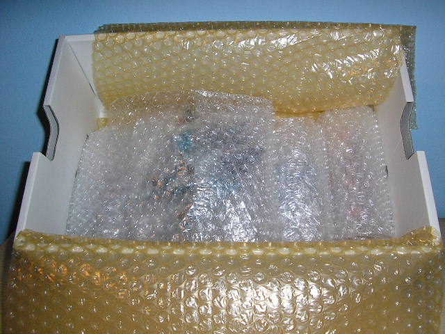 La scatola si presenta nella solita elegante veste nera, (dimensioni cm. 34 x 23 x 15 h.) con le immagini del modello stampate sulla sommità e sui flap laterali. Come già visto per il Perfect Change Getter del 1999, anch’essa si trasforma! In pratica è dotata di un falso coperchio, chiuso con una striscia di velcro, che simula un piccolo diorama in cui inserire il GFG trasformato ed intento a preparare il suo devastante attacco Hell and Heaven. Per completare la scenetta occorre togliere le parti pre-fustellate e fissare con due clip (fornite) i cerchi d’energia in cartoncino. I quali possono così ruotare e muoversi orizzontalmente. Se guardate la foto li vedrete solo appoggiati: perdonate se non l’ho fatto, ma non mi andava di trasformare anche la scatola…Il modello è contenuto in un vassoio di cartone che si estrae aprendo i flap laterali. Qui siamo nel territorio della più pura artigianalità: i singoli veicoli sono alloggiati in buste di millebolle, a loro avvolte in altri fogli di millebolle. Personalmente non ho mai avuto problemi di rotture all’interno delle scatole, ma capisco che una simile sistemazione può far tremare i polsi di un collezionista. Vi garantisco però che i pezzi sono saldi e protetti come un pisello nel proprio baccello…
