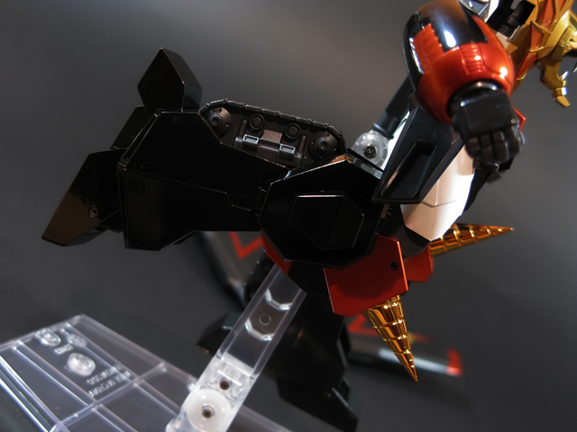 Lo snodo del collo è a sfara e permette una leggera escursione della testa indietro, maggiore in avanti e può girare a 360° sull'asse orizzontale.Spalle e busto sono tutti snodi a sfera e le braccia come la testa si possono estrarre. La spalla in realtà ha un triplo snodo, la sfera è inserita in un pezzo che ruota all'interno del busto, inoltre ha il pezzo del braccio collegato al treno avente uno snodo che permette al braccio di muoversi sull'asse orizzontale delle braccia, lo snodo a sfera fa il resto.Il busto permette l'inclinazione fronte-retro ed il movimento laterale ed ovviamente una via di mezzo tra i due, ovvero piegare il busto in avanti e leggermente di lato.Lo snodo delle anche, nella mia copia, resta comunque molto poco saldo e lo definirei molto "ballerino", nel senso che facendo poco attrito le gambe possono risultare un pò floscie. Le gambe ruotano molto poco sull'asse orizzontale però è quel tanto che basta per far assumere al modello pose dinamiche come il colpo principale del robot "hell and Heaven". Le gambe presentano anche una leggera escursione frontale-posteriore (anche nell'anime questo mecha non ha mai spiccato per dinamicità dei movimenti).Il ginocchio è molto interessante (oltre al già citato snodo della spalla) data peculiarità di far in modo che la punta del "drill gao" si alzi mentre il ginocchio si piega. Anche quì troviamo uno snodo ad attrito.Il piede, anch'esso fornito di uno snodo a sfera permette una leggera escursione frontale ben superiore invece l'escursione posteriore. Grazie alla parte esterna della gamba resa "mobile", il piede ha la possibilità di piegarsi verso l'esterno fornendo la possibilità al modello di assumere pose più dinamiche senza riscontrare quel bruttissimo effetto del piede non posato a terra, bruttissimo effetto di cui molti modelli invece soffrono.Il gomito ha l'ormai usuale doppio snodo, ovvero un punto pieghevole dalla parte inferiore del braccio ed uno sulla parte superiore dell'avambraccio permettendo così di superare l'angolo di 90 gradi nel momento in cui si pega il gomito (dimensioni dell'avambraccio permettendo).Il polso, anche quì troviamo lo snodo a sfera che si differenzia da altri modelli per via di un innesto rettangolare per le mani ed alcune armi del Gao, quali ad esempio il "dividing driver".Ho apprezzato molto che la ali (Stealth Gao) siano pighevoli verso l'esterno in modo da non intralciare alcune pose del robot, così come ho apprezzato la bocca del leone mobile (apro - chiudo)