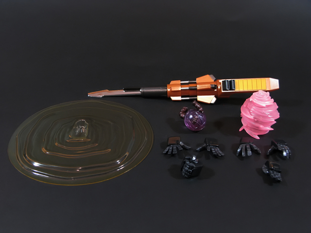 All'interno della confezione del robot troviamo un doppio maglio per simulare l'"hell and heaven", un paio di mani aperte, un paio di mani semiaperte che simulano la presa del nucleo "zoacrystal" che troviamo sempre nella confezione, una mano "piatta" per inserire l'effetto "protect shield", l'effetto "broken magnum" da applicare sull'avambraccio destro, il dividing driver, le ali del Robot (Stealth Gao), fregio sulla fronte in più, una faccia per rappresentare il gaigar prima di diventare Gaogaigar due accessori per gli stand, due prese d'aria per lo stalth gao, due parti laterali della faccia del leone (tipo criniera) con uno spazio per permettere alle braccia del robot di simulare il doppio pugno del "Hell and Heaven".Ho apprezzato la faccia di ricambio, ma onestamente non ho capito a questo punto perchè non fare due teste e basta, anzichè dare all'acquirente l'incombenza di dover cambiare configurazione quando non ce ne la necessità, visto che il modello non è un trasformabile ed i componenti servono solo a simulare altre modalità, senza contare il fatto che i pezzetti sono piccoli e facilmente perdibili.