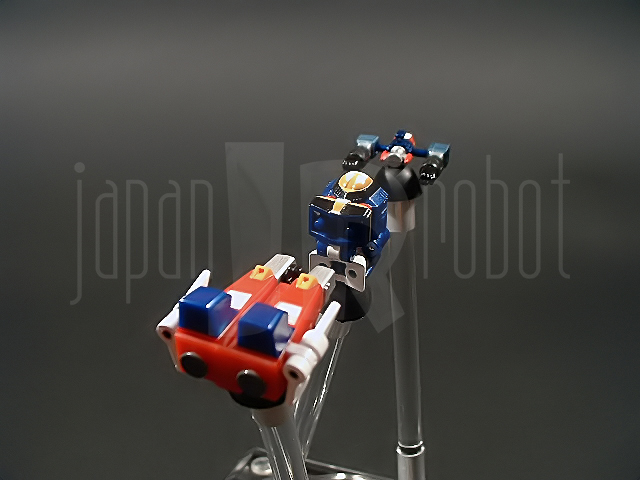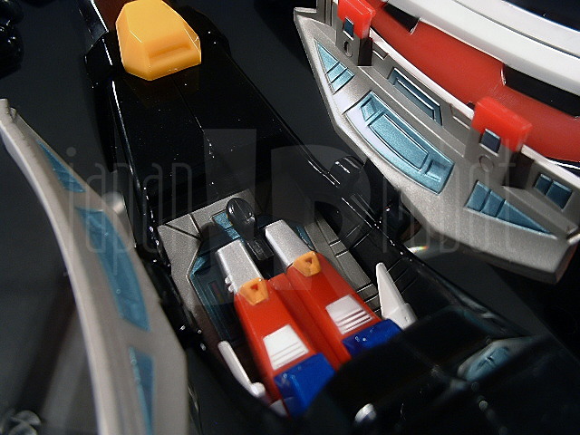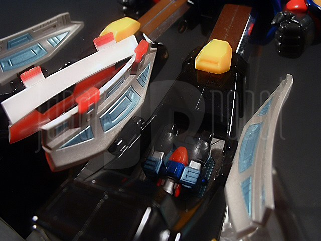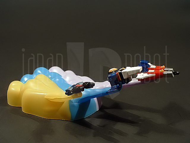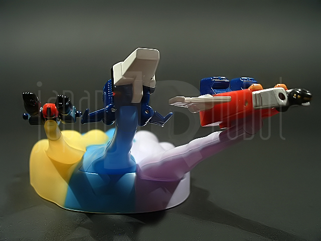 Passiamo ora ad occuparci del piccolo TRY 3, robot formato dall'unione dei tre Jet King Arrow, Jet Knight e Queen Rose. CM'S Corporation ha reso possibile la trasformazione dei tre Jet per dare forma al piccolo robot, ovviamente molto limitato nei suoi movimenti. 4 centimetri di altezza, rotazione delle braccia a 360 gradi e minimo movimento alle ginocchia, queste le possibilità del Try 3 riprodotto nella confezione, ma ovviamente lo scopo principale è quello di riprodurre l'agganciamento dei tre mezzi al Goshogun. I vani di aggancio sono ovviamente 3, petto per il King Arrow, tibia destra per il Jet Knight e tibia sinistra per il Queen Rose. I panelli si aprono mettendo in risalto bellissimi dettagli stile hangar all'interno, ogni piccolo Jet ha la propria sede con apposito aggancio che lo terrà saldamente ancorato dentro al nostro Goshogun. Come citato all'inizio, CM'S ha dotato di un particolarissimo stand espositivo i 3 piccoli Jet, gli appoggi dei mezzi riproducono la scia di fumo colorata lasciata alla partenza, idea che io ho trovato molto originale e carina da esporre.