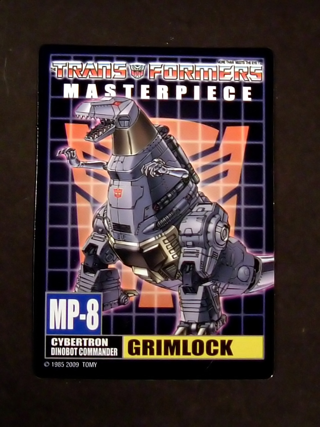 - Il libretto di istruzioni contenuto all'interno di una bustina di plastica trasparente insieme alla card identificativa del modello come da tradizione Masterpiece Takara. Come negli altri Masterpiece all'interno del libretto sono illustrate le precedenti versioni giocattolo di Grimlock, i gimmicks e gli accessori in dotazione con tanto di frames tratti dalla serie, una breve cronistoria del personaggio e, chiaramente riportate, tutte le istruzioni necessarie per effettuare la trasformazione del nostro modello in modo agevole.