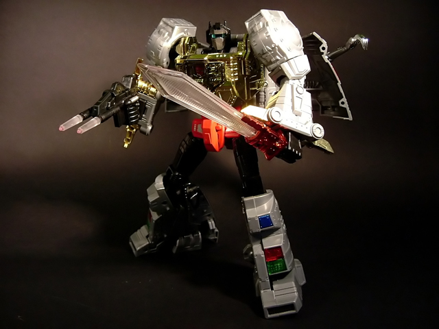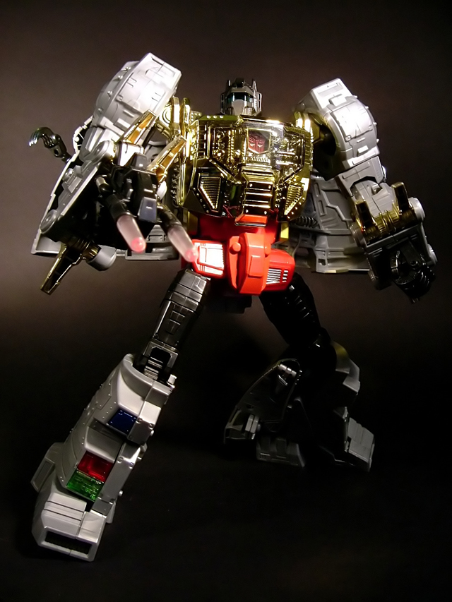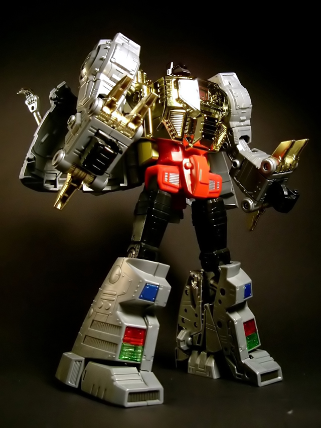 Relativamente leggero a fronte di una altezza di tutto rispetto (22 cm), il nostro Grimlock si caratterizza come tutti i Masterpiece (MP-1 e suoi recolor a parte) per una prevalente composizione in plastica. Nonostante ciò il peso di 544 grammi indica una seppur modesta percentuale in metallo che inizialmente ho avuto difficoltà ad identificare. Principalmente è localizzata a livello dell'articolazione della spalla del robot/anca del tirannosauro, delle dita delle zampe posteriori del tirannosauro/appendici sugli avambracci del robot, nella parte centrale del bacino e all'interno del blocco del torace. Molti si sono lamentati dell'altezza che, se il modello fosse stato fatto in scala, avrebbe dovuto essere in teoria superiore a quella di Optimus. Personalmente trovo che le dimensioni siano adeguate seppur non proporzionate dal momento che sia per materiali che per dimensioni ho sempre considerato l'MP-1 e l'MP-5 due uscite a parte rispetto al resto dei Masterpiece Takara. Molto curati i dettagli, soprattutto le chiodature ed i sistemi dei circuiti che, seppur non visibili nella serie animata, sono secondo me indispensabili per rendere meno piatto e insignificante l'aspetto del modello. Dispiace che a livello del collo e dell'addome del dinosauro non si sia ricorsi a un oro opaco più fedele a quanto visto sugli schermi, si è infatti deciso, probabilmente in omaggio alla versione vintage del 1985, di scegliere la doratura cromata dei circuiti qui riprodotti. La verniciatura è nel complesso buona, stonano un pochetto il riscontro di più di una venatura sulla plastica grigia (indice dell'uso di materiali non propriamente di prima qualità) e qualche segno di distacco dalle sprue di troppo sulla plastica rossa del bacino. La trasformazione, per semplice che sia, è stata come sempre realizzata in modo magistrale e scorre via senza intoppi complici le chiare indicazioni riportate sul libretto. La conversione delle gambe del robot nella coda del tirannosauro mi ha affascinato, veramente bellissima ed ingegnosa. In modalità animale il modello fa la sua bella figura e si contraddistingue per fedeltà alla controparte animata. Molto carini i gimmicks per cui spostando la coda in un senso il capo ruota in quello opposto, spingendo in basso il tronco la testa guarda in alto e premendo il tasto sulla mandibola a sinistra si simula il morso del tirannosauro chiudendo la bocca. Sfiziosa la possibilità di cambiare il colore degli occhi dall'azzurro al rosso della modalità combattimento tramite un sistema a rotazione all'interno della testa. Curato anche il dettaglio delle braccia in modalità animale, ben snodate con un sistema a sfera e ampiamente mobili in corrispondenza delle spalle, con gomiti flessibili e dita articolate separatamente le une dalle altre. Pure le anche e le ginocchia hanno una discreta mobilità garantendo, nonostante la goffaggine del nostro tirannosauro, una mobilità discreta nel limite del possibile. Imbarazzante, come accessorio, il grembiule con tanto di papillon e vassoio coi bicchieri, sono proprio curioso di capire chi mai ridicolizzerà il nostro eroe con una esposizione di questo tipo. Evidentemente Takara ha ascoltato le lamentele di chi criticava l'incompletezza della dotazione in accessori dei precedenti Masterpiece inserendo tutto, ma proprio tutto, ivi compreso, oltre ai suddetti, anche il sistema per la trasmissione delle onde cerebrali (anch'esso, per me, superfluo ed inutile). Passando alla modalità robot e partendo dalla mobilità, possiamo affermare che questa è da considerarsi complessivamente buona nonostante le caviglie non si pieghino moltissimo. Le ginocchia, a scatto, hanno movimenti di flessione soddisfacenti e le anche, ad attrito, hanno ampissime escursioni sia lateralmente che in senso antero-posteriore. La cosce sono libere di ruotare. Il tronco presenta movimenti di torsione a livello dello stacco addome-bacino. Le spalle, ad attrito, sono un po' troppo limitate in abduzione ma ruotano a 360 gradi e le braccia ruotano rispetto ad esse. I gomiti sono a scatto e si flettono a 90 gradi e la testa, dotata di uno snodo a sfera ha ampi movimenti di flessione-estensione potendo anche ruotare completamente. All'interno della spalla destra si localizzano le batterie (già in dotazione al modello) per l'alimentazione della luce localizzata nel pugno sinistro attivabile tramite la pressione di un pulsante sul retro della stessa spalla per illuminare la spada e il fucile quando questi vengano fatti impugnare al robot. Per questo motivo le falangi della mano destra non sono snodate ma bloccate in posizione di flessione, un vero peccato, mi risulta difficile pensare che non si sarebbe potuto escogitare un modo diverso per ideare questo gimmick senza limitare il movimento della mano. Ad ogni modo l'effetto finale di illuminazione in rosso della energon sword e del fucile è molto scenico. Anche in questa modalità è possibile convertire il colore della visiera da azzurro a rosso spostando una levetta posta al di dietro della testa del robot. Così come l'alt-mode, anche la variante robot del modello si contraddistingue per la notevole fedeltà all'aspetto che lo caratterizza nel cartone con gli unici appunti, secondo me, dell'eccessiva snellezza delle cosce che avrei trovato maggiormente somiglianti se più massicce (probabile che questa filiformità sia stata condizionata da ragioni dovute alle necessità di trasformazione) e della presenza della testa del tirannosauro "appesa" dietro alla schiena (decisamente non un bel vedere anche se, sinceramente, era difficile studiare soluzioni alternative).