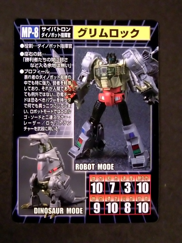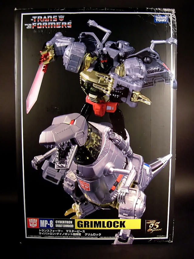 Il 2009 da poco trascorso ci ha lasciato in eredità, tra le tante novità proposte nel campo dei gokin, l'uscita del nuovo modello della serie Masterpiece Takara, l'MP8. A differenza di molti dei precedenti Masterpiece, immessi sul mercato con codici diversi ma spesso recolor o remold dell'MP-1 e dell'MP-3 (i 7 già usciti erano stati prodotti con appena 3 stampi), questo nuovo modello è stato fabbricato ricorrendo finalmente ad uno stampo nuovo di zecca. Il soggetto riprodotto questa volta ha sorpreso i più essendo rappresentato da Grimlock, noto come il leader dei Dinobots, robot convertibile in tirannosauro, e questa volta Takara si è superata fornendo in dotazione tutti gli accessori possibili e immaginabili, cosa che con i precedenti modelli di questa serie non aveva praticamente mai fatto costringendo gli appassionati alla customizzazione degli accessori mancanti. Molti di coloro che mi conoscono sanno che non sono un fan sfegatato dei Transformers, ma in questo caso il tipo di soggetto, da me esteticamente molto apprezzatto e la buona occasione che mi si è presentata, mi hanno dato modo di portarmi a casa questo piccolo gioiello che una volta di più conferma la validità tecnica dei modelli appartenenti a questa serie, ma procediamo con ordine......