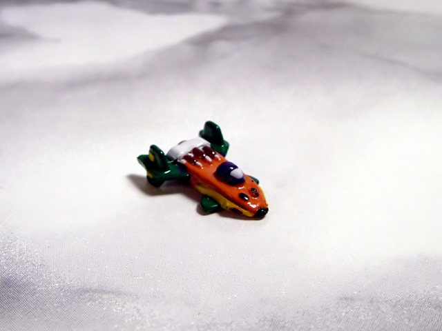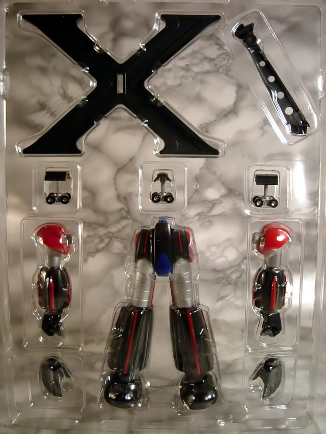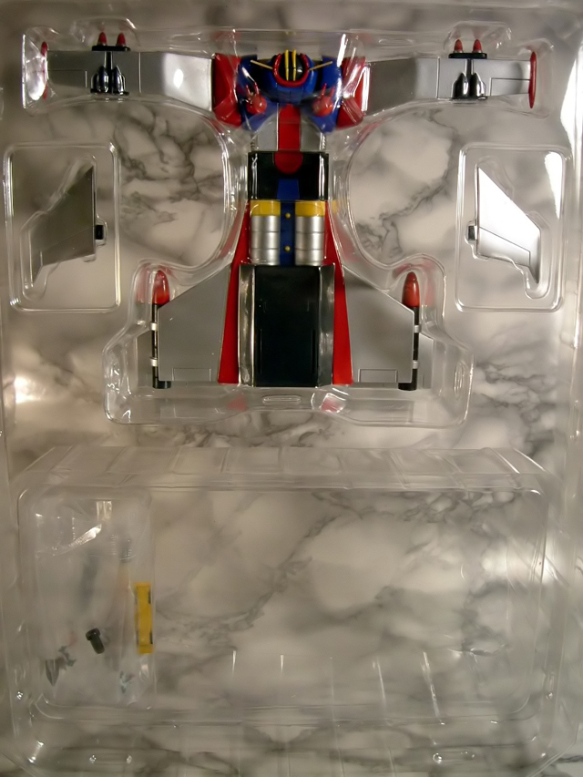 - Grande blister in plastica trasparente in cui troviamo alloggiato il robot in conformazione aereo, i due alettoni superiori di coda da applicare sul retro dell'aereo stesso e, in una bustina di plastica trasparente (ironia della sorte proprio là dove non ve ne era bisogno) le miniature dei tre mezzi di supporto, un piccolo missile per simularne l'uscita dal petto del robot, un missile grande, una scia che riproduce il fumo della propulsione da attaccare al missile grande stesso per simularne il lancio, un carrellino su cui appoggiare il missile grande. Nella parte inferiore di questo blister è presente un grosso scompartimento vuoto di cui sinceramente ignoro la funzione e che ipotizzo sia stato ideato per dare alloggio alle parti del papercraft di cui parleremo tra poco.