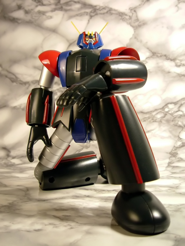 estraendolo gli alettoni postero-inferiori e i missili sulla superficie ventrale di quelli postero-superiori si distacchino spontaneamente visto che si incastrano a pressione. Poco male, si rimettono al loro posto e si prosegue, anche se la cosa non è certo positiva dal momento chei distacchi di queste parti possono verificarsi con una certa facilità anche mentre si maneggia ilmodello. Anche i missili antimateria sulla superficia ventrali delle ali sono applicati a pressione,ma a differenza delle parti di cui sopra godono di una maggiore solidità e stabilità. In questa modalità la lunghezza è di circa 15 cm per un peso relativamente esiguo (appena 200 g) condizionato dal fatto che a parte la porzione anteriore del corpo centrale per il resto l'aereo è completamente in plastica. Per completarlo è sufficiente applicare i due alettoni superiori di coda, confezionati separatamente e un po' fastidiosi da estrarre dal blister per la sin troppo efficace tenuta dei fermi. I carrelli posteriori sono applicabili a pressione nei relativi alloggiamenti. Molto carino il sistema a molla che permette la loro estrazione semplicemente premendo lo sportellino sul dorso della parte posteriore dell'aereo tra i due alettoni superiori. Anteriormente il carrellino è facilmente applicabile rimuovendo l'appposita placchetta sul torace del robot. Il torace è apribile per simulare la fuoriuscita dell'ipermissile Xandron e, con l'accessorio simulante il fumo della propulsione, il suo lancio. Si tratta di accessori carini che non aggiungono però molto al valore del modello. I cannoni termici sul dorso sono in pvc morbido e non sono regolabili in inclinazione mentre sono ruotabili le relative torrette. La verniciatura non è quanto di meglio si sia visto ma, almeno in questo esemplare, a parte alcune evidenti imperfezioni soprattutto nei dettagli più minuti del volto e sulle ali, raggiunge la sufficienza a differenza di altre copie in cui più di una persona si sarebbe lamentata di grossolani difetti non si sa bene quanto favoriti dalla modalità di confezionamento. La basetta espositiva è originale e funzionale e permette l'esposizione dell'aereo con la possibilità di sceglierne il grado di inclinazione. L'aggancio alla carlinga dell'aereo è semplice e solido. Passiamo a questo punto alla trasformazione sempre che di trasformazione si possa parlare. In pratica per convertire il nostro Groizer in robot è sufficiente fare un semplicissimo lavoro di stacca-attacca in cui l'unica parte ad essere risparmiata è il torace del robot dal momento che le restanti parti dell'aereo devono essere rimosse totalmente potendosene tornare tranquillamente in scatola. Se è vero che è criticabile la politica dell'all in one avviata da Bandai con la pedissequa ricerca della trasformabilità senza la necessità di aggiungere o rimuovere pezzi nelle varie conformazioni (tendenza che comporta un inevitabile sacrificio del contenuto in metallo e della somiglianza alla controparte animata del robot), è altrettanto vero che se un gokin è convertibile deve pur sempre avere un minimo di convertibilità, praticamente inesistente in questo caso. Un minimo sforzo in più da parte di Yamato per limitare lo stacca-attacca non nego che mi avrebbe fatto decisamente piacere! Nella fase di distacco delle varie appendici mi sono reso conto che anche l'ala sinistra non ha un aggancio solido per cui mi è rimasta in mano applicando una trazione modestissima. Credo che si tratti però di un difetto della mia sola copia dal momento che l'ala controlaterale non soffre di questa lassità. L'unica trasformazione da eseguire è in pratica quella che permette alla testa di portarsi dal dorso al di sopra delle spalle ed è molto semplice da effettuarsi. A questo punto è sufficiente attaccare a pressione le braccia (anch'esse un po' difficili da estrarre dal blister per effetto dei soliti fermi) ed il blocco bacino-gambe (a proposito, anche la copertura posteriore del bacino quando lo si estrae spesso si stacca ) ed avremo il nostro bel robot con un'altezza di 21 cm (al sommo delle antenne) ed il ragguardevole peso di 518 g. In questo caso il metallo non manca, sono infatti di metallo i piedi, le gambe, il blocco interno del bacino, il torace, le spalle e le braccia. In plastica abbiamo le cosce, il gonnellino, gli avambracci e la testa. Appena assemblato ho purtroppo avuto subito una brutta sorpresa: una vite (per la precisione la inferiore sulla superficie interna della gamba destra) se ne è andata allegramente a spasso per il tavolo. Munitomi di apposito cacciavite ho con pazienza riassemblato il tutto, ma decisamente non ci siamo..... Le articolazioni di ginocchio e anca sono a scatto. Le pime consentono flessioni notevoli favorite dalla presenza di appositi sportellini sulla parte superiore della facca posteriore della gamba e le seconde permettono sia movimenti laterali che in senso antero-posteriore. La notevole rigidità ed il suono emesso ad ogni scatto non mi hanno trasmesso una sensazione di particolare solidità, l'impressione è in pratica quella di rischiare di ritrovarsi con l'articolazione spezzata ogni volta che la si muove. Sopratutto a livello dell'anca l'escursione dell'articolazione è favorita dalla mobilità degli elementi (2 anteriori e 2 laterali) che costituiscono il gonnellino. Questi, in plastica, si agganciano al corpo centrale del bacino con dei pernetti che danno la sensazione di spezzarsi con estrema facilità (soprattutto negli elementi anteriori, uniti al bacino solo in corispondenza dell'angolo supero-mediale). Il consiglio è quindi quello di porre particolare cura nei movimenti delle anche, che peraltro consentono al modello di avere una posabilità assolutamente di rilievo (può essere tranquillamente posato in ginocchio). Le articolazioni della caviglia sono ad attrito e nel mio esemplare eccessivamente molli. Non permettono grosse inclinazioni essendo state concepite in modo certamente non ottimale con c