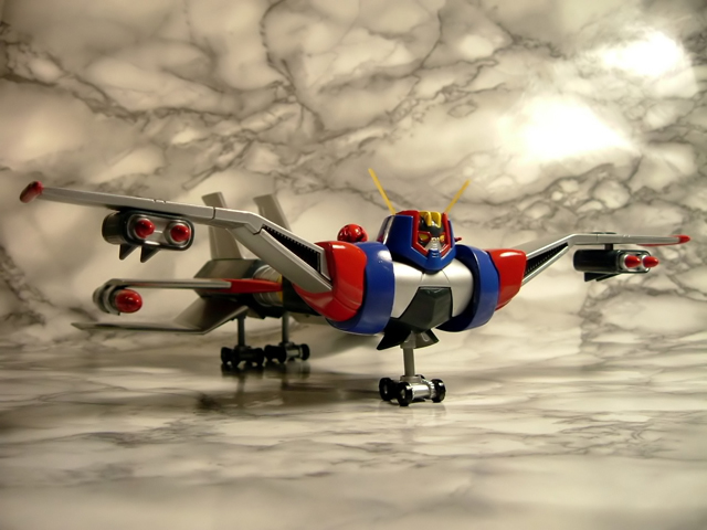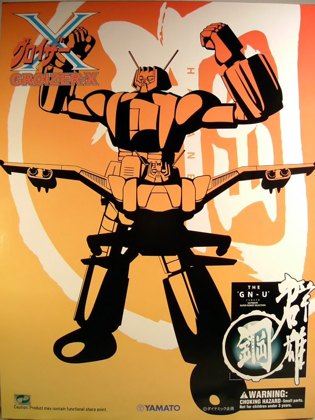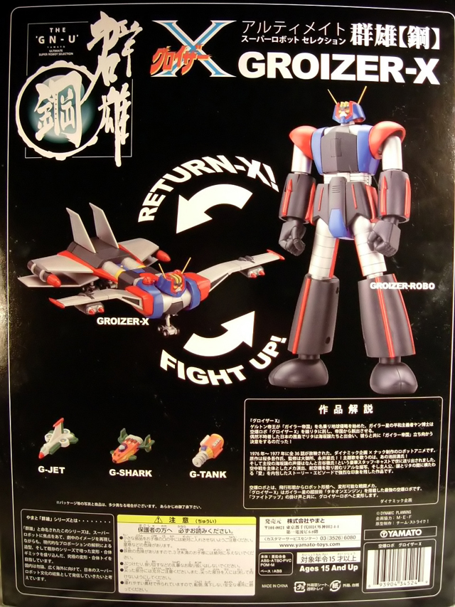 A cavallo tra il 1976 ed il 1977 Tokyo Channel 12 trasmetteva le 36 puntate di un nuovo anime robotico prodotto dalla Knack Animation a firma del Maestro Go Nagai e di Gosaku Ota dal titolo Groizer X. Sempre nota come una delle opere minori di Nagai, Groizer X (noto anche come Gloyzer X o Gloizer X), narra le vicende dell'enorme robot convertibile in aereo che, pilotato dal terrestre Joe Kasaka e dalla ragazza aliena Rita, combatte contro la razza aliena dei Gailariani che intendono conquistare la terra proprio a partire dal Giappone. Giunto in Italia nel 1981, quando Canale 5 ha trasmesso per intero la serie, l'anime non ha lasciato certo lo stesso segno di cartoni come i vari Mazinga, Atlas UFO Robot o Jeeg, ma si è comunque ricavato quella piccola nicchia nella memoria di noi bambini degli anni 70 per cui, quando poco più di un paio di anni fa Yamato ha annunciato la riproduzione del Groizer X come modello diecast per la serie "The GN-U ultimate super robot selection", ci siamo comunque trovati di fronte ad una immagine a noi familiare. Il modello, immesso sul mercato nella sua prima versione coi colori tipici dell'anime a fine 2007, è stato fatto seguire a distanza di pochi mesi da una seconda, improbabile variante a tiratura limitata con parti verdi ispirata alla colorazione che caratterizza il mecha nel manga su richiesta del noto shop online nipponico Hobby Link Japan. Complice lo scarso successo inizialmente riscosso dal modello ed il conseguente, drastico calo di prezzi subìto con il passare del tempo,alcuni mesi fa, anche sotto la spinta della positiva esperienza chiamata Danguard Yamato, mi sono deciso ad acquistare una copia di questo gokin, con verniciatura rigorosamente normal. Passo quindi a riferirvi la mia personalissima opinione sul gokin....