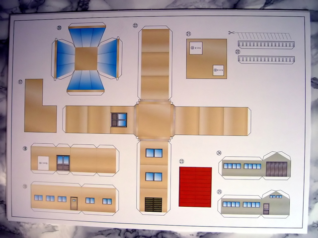 - Una busta di plastica trasparente contenente 5 fogli di cartoncino su cui sono stampate le varie parti di un papercraft da ritagliare e da assemblare con l'ausilio della scatola stessa e del contenitore in cartoncino che nella scatola accoglie i due blister. L'idea è decisamente carina anche se particolarmente poco pratica vista la cronica assenza di spazio per i collezionisti di gokin. Ad ogni modo è in questa maniera possibile riprodurre la base del Groizer che altro non è che una specie di aeroporto localizzato sull'isola di Akanè componendo così un diorama molto suggestivo, questa è certamente una nota di merito a favore di Yamato data l'originalità dell'idea.