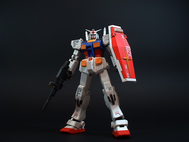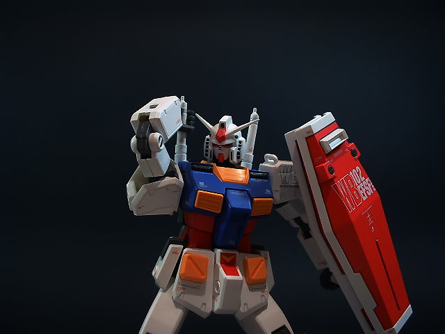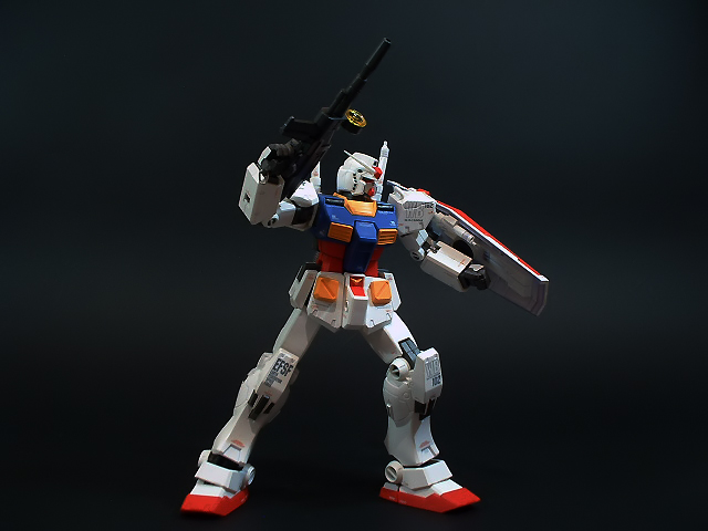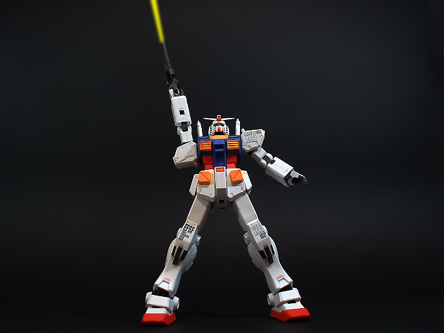 Il nostro Mobile Suit bianco è alto 19 cm ed ah un peso di 250 grammi, i materiali da cui è composto sono plastica, gomma dura e alcune parti in metallo. Voi ora vi chiederete, ma perché la sigla Metal Composite? Me lo sono chiesto anche io, probabilmente questa dicitura sta ad indicare che c’è una percentuale di metallo nella composizione del modellino, magra consolazione mi direte, ma è così. Le parti metalliche sono: il bicipite, la parte bianca dietro al ginocchio, l’interno della parte bassa della gamba ed anche del piede, questo sicuramente per dare peso e stabilità ad un modello che altrimenti sarebbe cascato al primo soffio di vento. La verniciatura è perfetta bellissime tutte le scritte applicate sul corpo del Gundam, addirittura ce ne sono di piccolissime, ma se prendete una lente d’ingrandimento le potrete leggere tutte! Molto bella la tonalità del blu e del rosso, le plastiche sono state dipinte quindi il risultato non da per nulla l’effetto giocattoloso. Nessun segno di stacco dalle griglie sulle plastiche, l’assemblaggio nell’insieme è buono, ma sugl’avambracci non è il massimo della perfezione, rimane purtroppo ben visibile la linea di giunzione nella parte frontale, mentre risulta meno vistosa nella posteriore. Anche per la testa si poteva sicuramente fare meglio, ma il fregio centrale nasconde sapientemente il difetto. La posabilità si attesta su buoni livelli, nulla di eccezionale, però si possono riprodurre discrete action pose tipiche della serie Gundam. Certamente con l’esperienza dei Kit Bandai poteva dotare di più movimenti questo Rx-78-2, il livello raggiunto in alcuni Master Grade è davvero stupefacente, e dato che questo modellino è in scala 1:100 mi aspettavo un lavoro più curato da questo punto di vista. Passo ad una descrizione più accurata dei movimenti, la testa ruota a 360 gradi, ma ha pochissima escursione, sia in laterale che in avanti/dietro, è praticamente agganciata ad un perno che ne permette/frena i movimenti. Le braccia ruotano completamente, c’è un ulteriore snodo sotto alla spalla che permette di muovere all’interno ed all’esterno tutto il braccio. Buona la rotazione del gomito che consente di piegare l’avambraccio quasi completamente dando la possibilità al Gundam di andare ad agganciare la Beam Saber dietro alla schiena, quasi nulla la mobilità del polso dove c’è il perno per l’aggancio delle mani. Il busto è ovviamente fisso dato che si stacca dal bacino per permettere l’agganciamento del Core Fighter, le gambe invece godono di discreta mobilità, abbiamo al massimo dell’apertura con piedi poggiati completamente a terra una divaricazione di 13 centimetri che non è per niente male. Questo grazie alla parziale rotazione che può compiere lo snodo posto sotto al bacino, è il classico a perno usato nei kit, volendo lo si potrebbe anche modificare……La rotazione è comandata da snodi ad atrito mentre al ginocchio abbiamo il più gradito a scatto, quest’ultimo permette un notevole piegamento all’indietro della parte inferiore delle gamba. Buonissima la resa della caviglia che può inclinarsi abbastanza per permettere al Mobile Suit di mantenere quasi sempre le piante dei piedi a terra, c’è da osservare anche la possibilità che ha il collo del piede di poter ruotare ed avanzare, questo contribuisce notevolmente al mantenimento della stabilità.