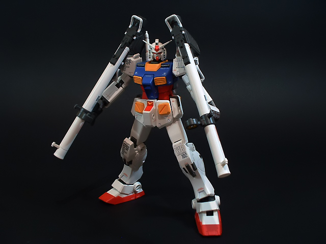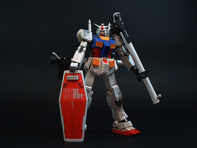 Il nostro Rx-78-2 è ovviamente provvisto di armi ed altri accessori che vengono impiegati per l’ottenimento delle varie configurazioni viste prima. Per completezza vado brevemente a descrivere le armi in dotazione, 2 Hyper Bazoka lunghi 16 centimetri con mirino fisso, possono essere agganciati singolarmente nel retro dell’ Rx-78-2. Beam Rifle è il classico fucile usato dal Gundam ed è lungo 9,5 centimetri, può essere impugnato indifferentemente a destra o a sinistra ed ha il mirino e la manopola orientabili. I 2 Shield sono gli scudi usati per la protezione dai colpi nemici, misurano 10,5 centimetri, uno è il classico con la stella gialla, il secondo invece è liscio con la sola scritta WB102 EFSF. La particolarità di questi scudi è che si possono sormontare grazie all’uso di un piccolo accessorio dando la possibilità al Gundam di averli entrambi in solo lato. Immancabili ovviamente le Beam Saber, sono le classiche spade laser che il Mobile Suit bianco estrae da dietro la schiena, agganciate la manico raggiungono la misura di 15,5 centimetri. Nella confezione sono presenti anche alcuni importanti accessori, abbiamo 2 manopole che servono per far sorreggere gli scudi all’ Rx-78-2 nella configurazione G-Armor, vengono agganciate nell’interno dei rispettivi Shield, aggancio singolo per posizionare lo scudo sul braccio mediante un perno che si va ad inserire nell’avambraccio, la particolarità di questo accessorio è che una volta agganciato lo scudo questo può essere fatto ruotare in qualsiasi direzione ed addirittura essere ripiegato all’indietro. La dotazione di accessori si chiude con un supporto che permette l’agganciamento del Gundam con le ruote cingolate del G-Fighter, questo ne assicura la tenuta nella configurazione G-Armor, tutte queste parti descritte sono in plastica verniciata con rifiniture perfette.