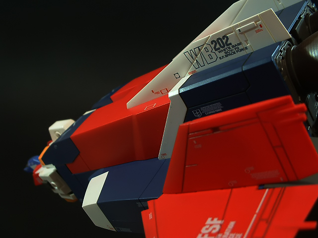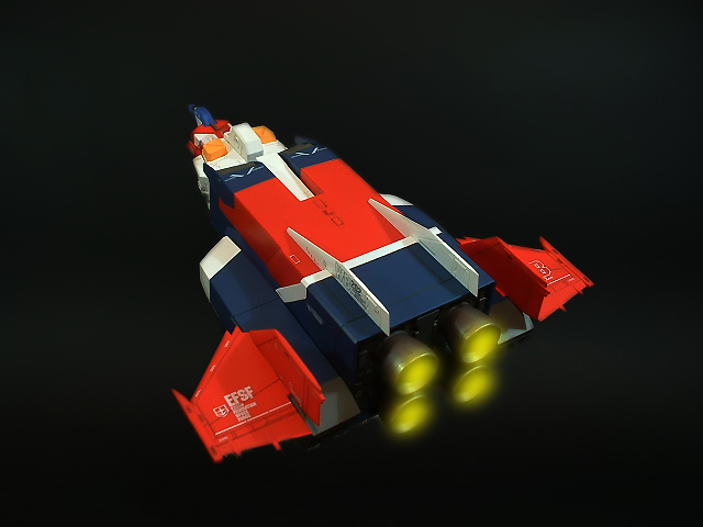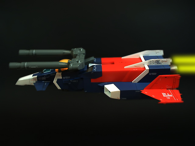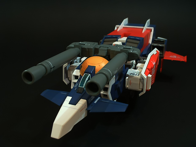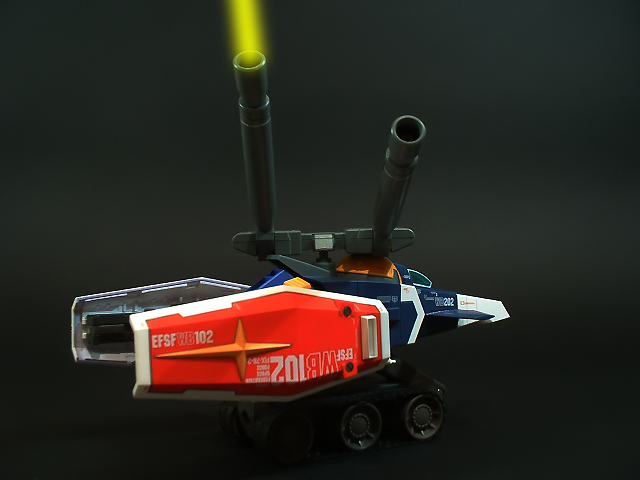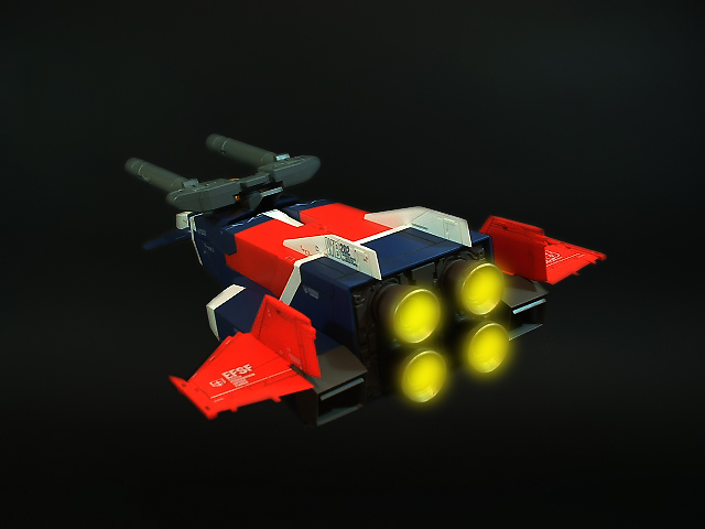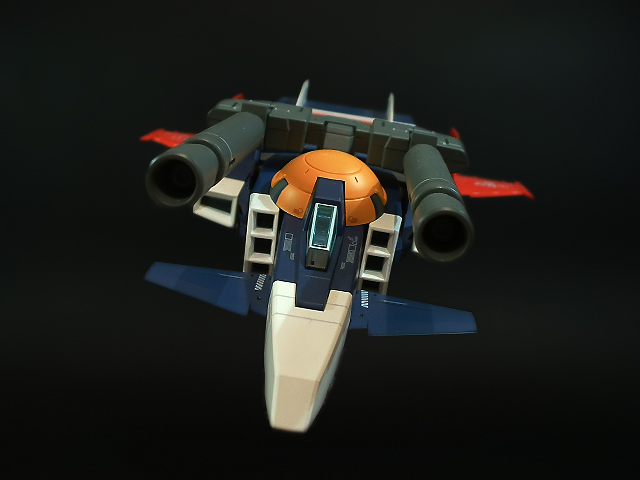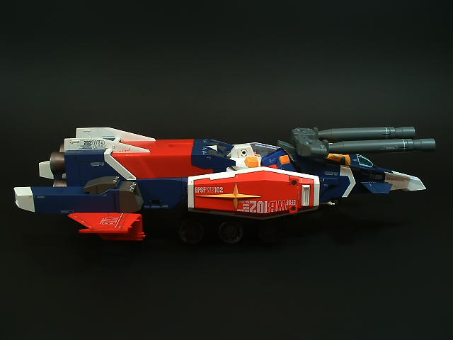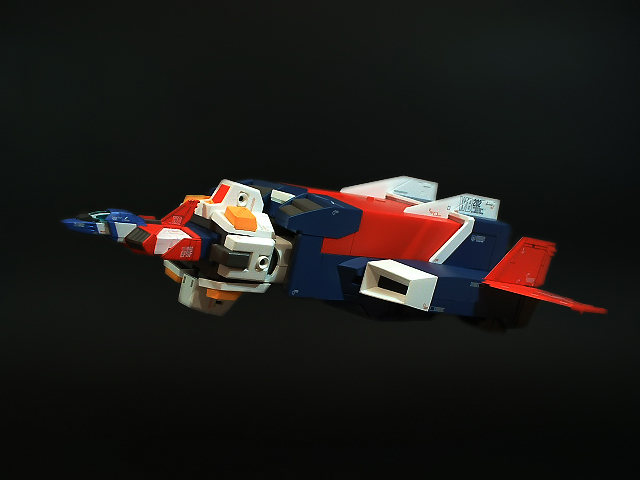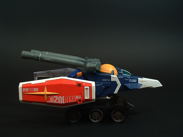 Il G-Fighter è il mezzo di supporto del nostro Rx-78-2, ha la possibilità di essere impiegato sia a terra che in volo, ma andiamo con ordine. Il G-Fighter pesa 270 grammi ed è lungo ben 28 centimetri, è composto totalmente in plastica ed ha una verniciatura molto valida come per il Gundam. Anche qui bellissime le tonalità dei colori blu e rosso, molto curate le varie scritte e soprattutto le pennellature sul corpo del G-Fighter e sul retro nella parte motori. La cabina di pilotaggio è di color verde trasparente, i bordi sono tracciati in bianco e si può anche vedere il sedile interno. Poco dietro alla cabina di comando c’è la grande torretta con due cannoni, essa può ruotare parzialmente e ha la possibilità di poter alzare singolarmente le due bocche di fuoco. Le ali di coda ruotano all’indietro per la configurazione G-Armor grazie ad uno snodo a scatto che ne scandisce ogni singola rotazione. Nella “pancia” del G-Fighter c’è un grande alloggiamento che nasconde le ruote cingolate, queste sono in gomma morbida e funzionano realmente. Questa parte è agganciata alla punta del G-Fighter, questa parte si stacca dal resto del corpo per permettere l’aggancio del Mobile Suit nella fase di trasformazione G-Armor. Passiamo ora alla descrizione del piccolo Core Fighter, presente ovviamente in versione trasformabile. Questo è il mezzo volante che serve ad Amuro Ray per agganciarsi al Gundam e in questa versione Metal Composite è sapientemente riprodotto pur essendo di piccole dimensioni, 6 centimetri di lunghezza, 3 in versione chiusa, per un peso di 0,5 grammi. Anche per il piccolo Core Fighter rifiniture e verniciatura ottime, perfetta la trasformazione per la fase di aggancio, la punta rientra all’interno e ruotando nella parte sottostante fa nascondere la coda posteriore, le ali si chiudono ed il piccolo gioiellino è pronto per diventare parte integrante del nostro Rx-78-2! Nella confezione troviamo anche i tre piccoli carrelli nel caso in cui si voglia esporlo accanto al Gundam.