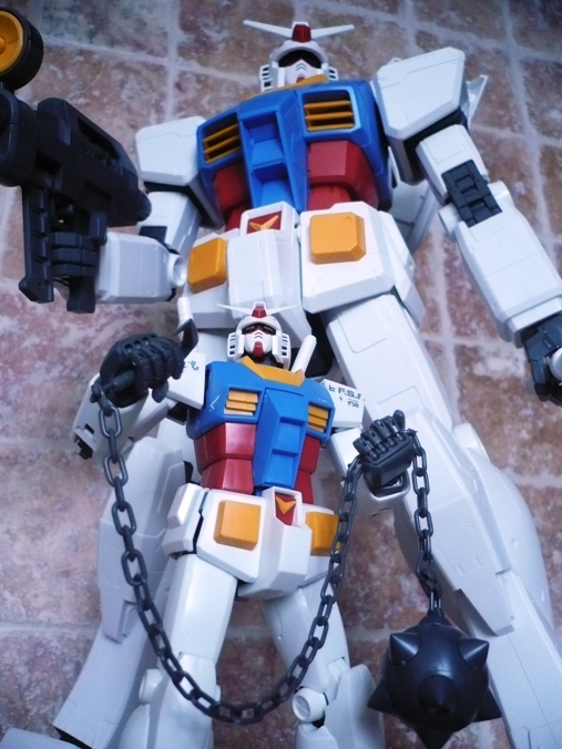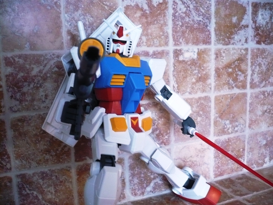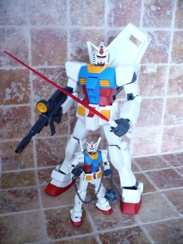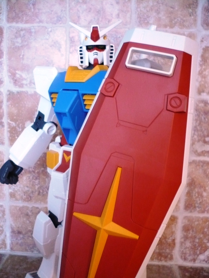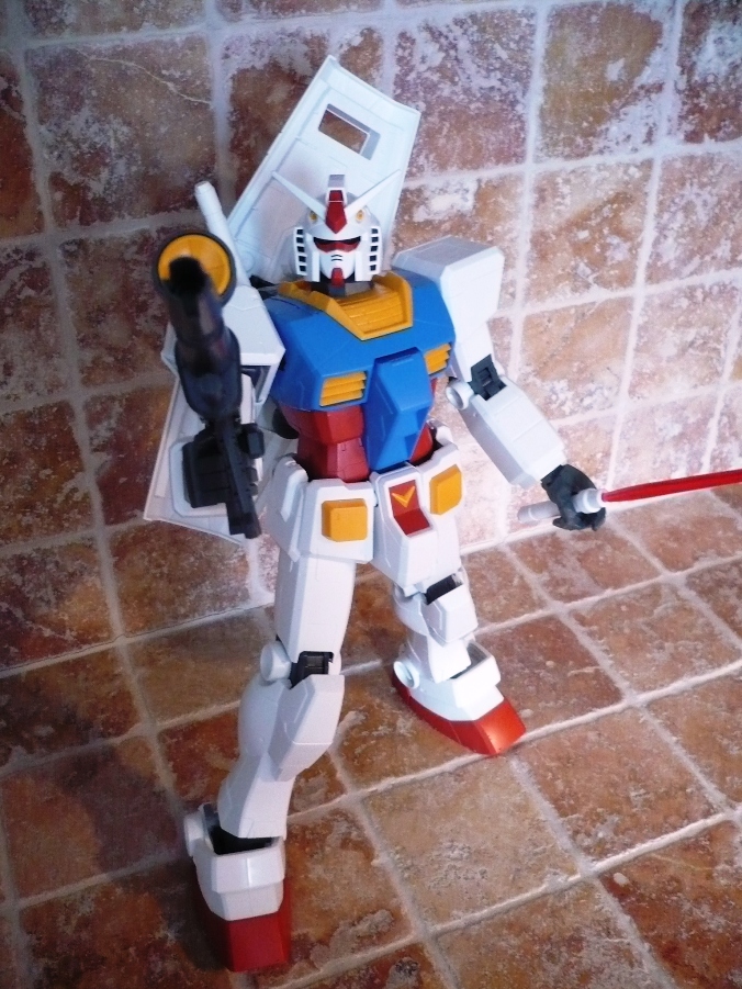 La testa non si discosta poi molto da quella degli altri “fratelli” e si fa apprezza per un ottimo snodo alla base del collo, che consente al Gundam di alzare o abbassare il capo in maniera egregia.Le armi sono “solamente” 4: 2 spade, fucile e scudo. Niente bazooka. Niente mazza ferrata. Le spade sono identiche alle controparti 1/100 e 1/60, lo scudo è costituito da 3 elementi (pezzo bianco, pezzo rosso e stella), mentre il fucile ha sia il manico, sia il mirino muovibile.Il Gundam è così montato e si mostrerà a voi orgoglioso grazie ai suo 37,5 cm e ai 660 grammi di peso.E qui entrano in gioco gli esperti modellisti con i vari marker da poter utilizzare, le decalcomanie e le vernici. Io ho preferito lasciarlo così com’è uscito dalle fabbriche Bandai e, come potete vedere nelle foto, la sua figura la fa comunque.