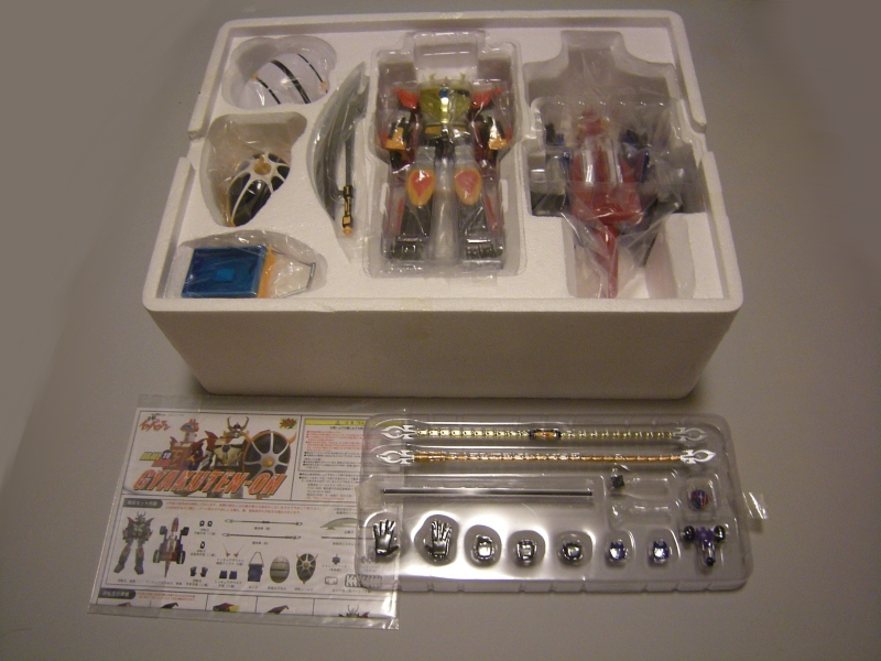 Una volta aperta la confezione ci troviamo di fronte a un sarcofago di polistirolo. Una volta tolta la copertura superiore, ecco come si presenta l’interno: Al centro della scatola si trova il Gyakuten-Oh in conformazione robot. Alla sua sinistra si trovano il container a forma di uovo, il Tokkyu Trailer per trasportarlo, la Seigito (spada della giustizia) e il Gyakuten Shield. A sinistra invece si trova il Relief Don. Sul retro della confezione di polistirolo é inserito un blister di plastica in cui si trovano due Mashinbo (bastone magico estensibile) - di cui uno rigido con effetto cromato e uno morbido in pvc - le antenne per il Tokkyu Saurus, le varie mani intercambiabili, la scaletta che fuoriesce dalla bocca del Tokkyu Saurus, lo Sharekobe Buggy e infine – sotto il blister – i tappini opzionali per coprire i buchi in cui alloggiano le viti. Tale blister é inserito in un vano del sarcofaco in polistirolo ed é tenuto fermo con del nastro adesivo. Dopo l’asportazione del nastro non rimane incastrato nel vano. Completa il contenuto il classico foglietto a colori ripiegato in quattro, che illustra le fasi della trasformazione e l'utilizzo delle armi opzionali.