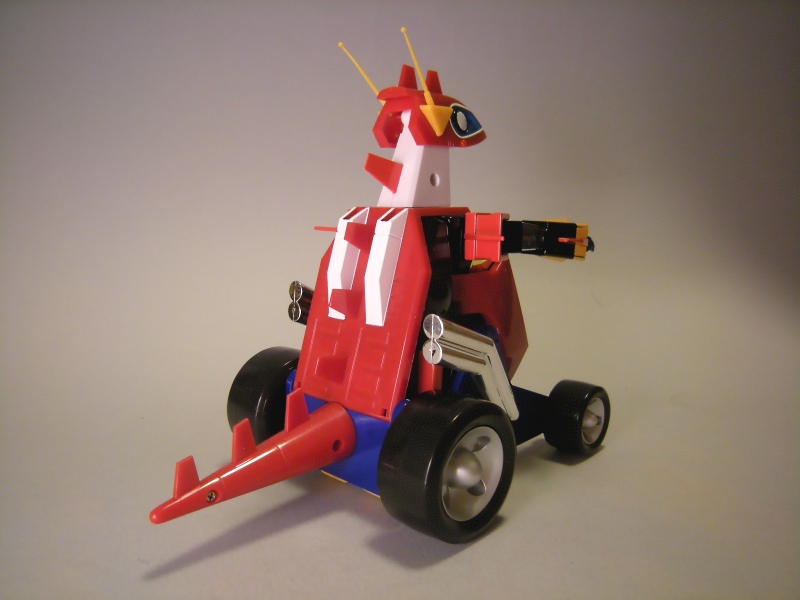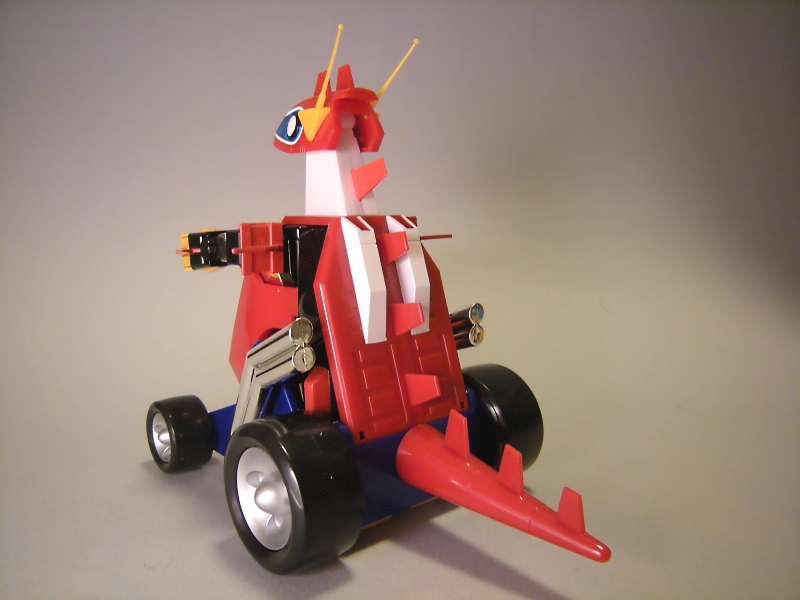 Il Gyakuten-Oh si ottiene tramite una semplice trasformazione del modulo centrale del Tokkyu Saurus e viene utilizzato da Go Sokkyu una volta trasformatosi in Ippatsuman. CM's per questa conformazione ha pensato a degli snodi semplici ma molto funzionali. Il fronte del Tokkyu Saurus presenta un disegno, che nell'anime originale scompariva al momento della trasformazione. Nel modellino la cosa é stata risolta utilizzando due pannelli ruotabili di 180 gradi. Quindi tutta la parte rossa viene fatta allargare e girata sulla schiena. Le gambe sono originariamente ripiegate all'indietro - un po' come per il Daikyojin/King Star in versione Sagittario - e vanno raddrizzate. Le braccia vanno abbassate. La componente della testa invece é un'astronavina a parte che raggiunge il robot al termine della sua trasformazione. Le mani del robot compaiono a seguito di una rotazione dei polsi. Difatti i lati delle braccia sono apribili, permettendo quindi alle zampe del Tokkyu Saurus di ruotare all'interno dello stesso avambraccio rivelando i pugni del robot a seguito del movimento di rotazione. Si tratta di un gimmick semplice e ad effetto, tuttavia lo spazio all'interno dell'avambraccio é molto risicato percui operare questo tipo di trasformazione può risultare più laborioso di quanto non sembri. A questo punto é preferibile staccare direttamente le zampe del dinosauro e inserire i pugni al loro posto.