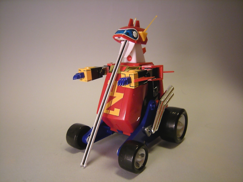 Tokkyu Saurus é il nome del mezzo sauriforme che il protagonista Go Sokkyu utilizza nel suo lavoro di consegne. In questo senso l'uovo che viene trainato dal mezzo non é niente altro che un container per la merce che viene trasportata. CM's per questo cargo ha realizzato un involucro completamente in plastica al cui interno va a incastrarsi la componente che diventerà il Gyakuten-Oh (questi quasi interamente di metallo). La lucertolona panciuta é un pezzo unico, e in questo senso l'unico movimento che può fare é scorrere sulle sue ruote, anch'esse in plastica dura. Le sue zampe sarebbero gli arti superiori del Gyakuten-Oh, quindi volendo possono essere mosse. La qualità della plastica utilizzata da CM's non é il massimo. Di buono va fatto notare che non si notano i segni di distacco dagli sprue, ma alla vista e al tatto appare come una plastica molto molto leggera e di non grande qualità. Il Tokkyu Saurus é dotato di due gimmik: 1) la bocca é apribile ed é possibile inserire al suo interno la scaletta per fare scendere il protagonista; 2) schiacciando il primo elemento della cresta del dinosauro, si aziona un movimento a scatto che apre di colpo gli occhi del robot, rivelando la cabina di pilotaggio dello stesso. Per quanto riguarda la conformazione Relief Don, per ottenerla é necessario estrarre dal corpo principale la componente del Gyakuten e quindi piegare semplicemente in avanti la schiena del soggetto e inserire al suo interno il Tokkyu Trailer. Inclinando quindi la testa verso l'alto si ottiene il suo aspetto finale.