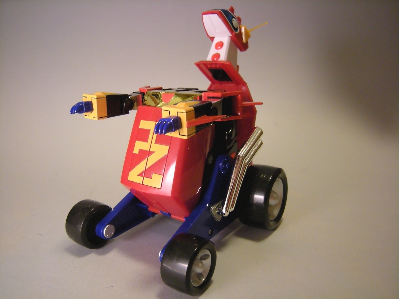 Veniamo ora agli snodi del modello. La testa ha uno snodo di rotazione sul collo, senza possibilità di inclinazione alcuna. Le spalle possono spostarsi verso l'alto, fino ad arrivare a fianco della testa del Gyakuten-Oh. Le braccia hanno snodi a scatto sia in rotazione che abduzione. Ci sono poi gli snodi ad attrito per la torsione e per la flessione del gomito. Le mani hanno solo lo snodo a sfera, ma non sono possibili altri movimenti oltre alla rotazione. Il busto é dotato di uno snodo ad attrito per la rotazione alla vita. Le anche hanno snodi ad attrito e permettono alle gambe sia di ruotare su se stesse e di muoversi sia in abduzione che in estensione anteroposteriore (quest'ultimo é purtroppo abbastanza limitato). La flessione del polpaccio é invece di almeno 90 gradi, causa trasformazione, e si effettua grazie a due punti di snodo sul ginocchio. I piedi hanno uno snodo a sfera che permette loro una rotazione di 360 gradi più un limitato movimento di inclinazione. Infine sono dotati di flessione plantare.