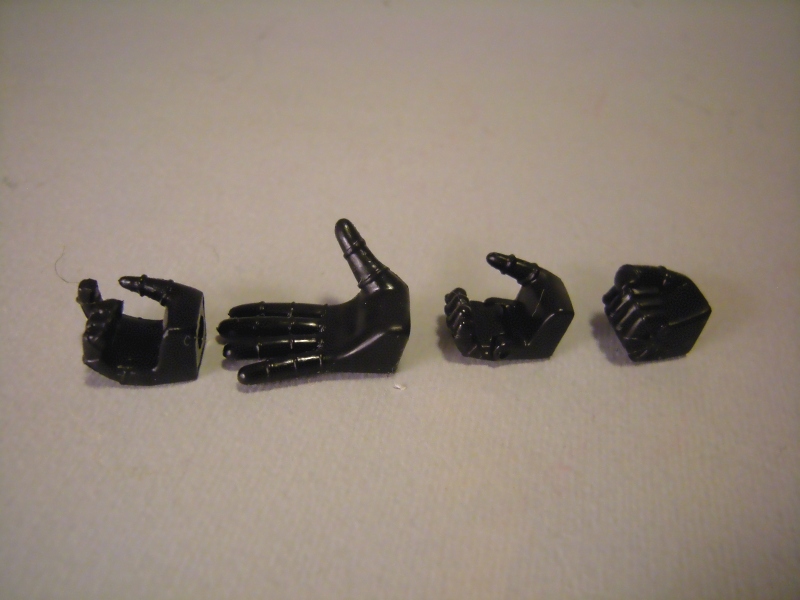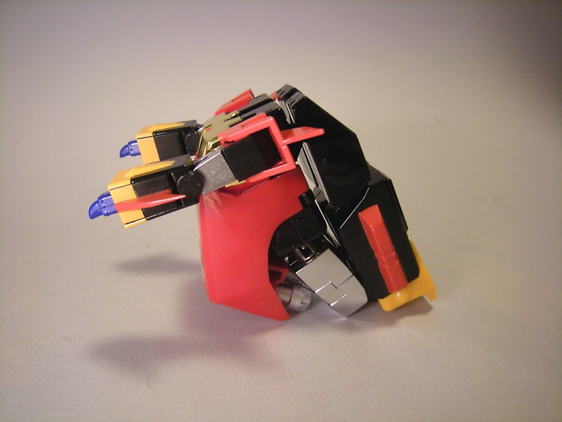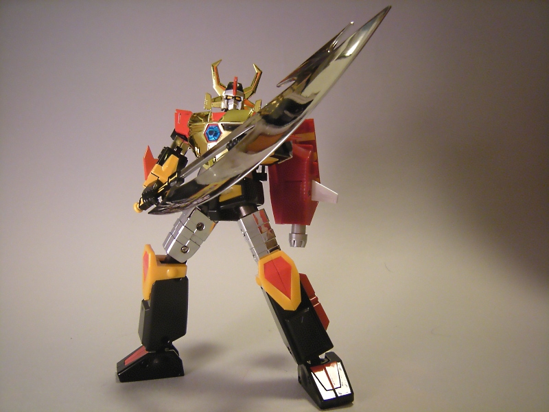 L'argomento pugni merita una digressione. Nella confezione sono contenuti due pugni chiusi (montati direttamente sul robot) due mani aperte con dita distese, due mani prensili con movimeno alle nocche e una mano destra posizionata nel gesto di afferrare un fucile, con tanto di dito indice disposto per il grilletto. La sostituzione delle varie mani può non essere velocissima dato che l'aggancio a sfera del polso si trova sull'asse di rotazione per la scomparsa delle mani all'interno dell'avambraccio. Percui può capitare che spingendo sulla sfera questi scivoli via invece di accogliere la mano. La versione per il fucile é ben fatta, senonché il Gyakuten-Oh non ha questo tipo di arma nel suo arsenale. Le mani prensili invece hanno il problema di avere un semplice snodo ad attrito che... fa poca presa. Nelle foto a corredo di questo articolo é stata utilizzata la versione da fucile per impugnare la spada.
