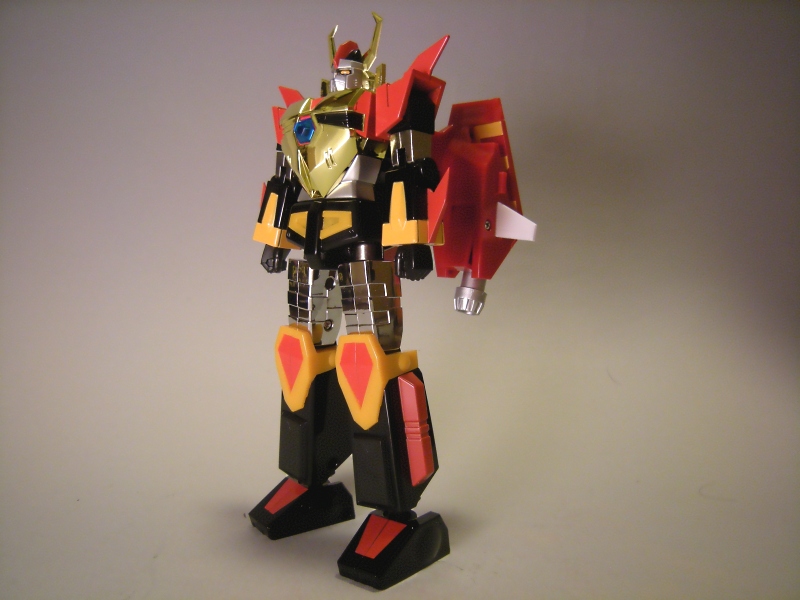 Gyakuten-Oh é il robot titolare della serie Gyakuten Ippatsuman del 1982, sesta incarnazione delle Time Bokan. Temporalmente segue direttamente Yattodetaman (in Italia Calendarman) e ne riprende alcuni schemi, come per l'appunto la presenza di un vero robot gigante dall'aspetto umanoide in luogo delle buffe macchine viste in Yattaman e gli altri. La serie ruota attorno alle vicende della compagnia Time Lease, che effettua consegne a domicilio in ogni dove e in ogni epoca, contrastata dalla compagnia avversaria Sharekobe Lease. Letteralmente Gyakuten-Oh significa "il re della rimonta". Rimonta va inteso col significato prettamente sportivo, difatti gyakuten indica il punto con cui si capovolgono le sorti di un incontro. Di questo robot fu la Takatoku a produrre all'epoca una versione standard e una deluxe - più altri mecha della serie -, mentre la sua incarnazione moderna dedicata al mercato dei collezionisti é opera di CM's Corporation, che lo include nella linea Brave Gokin assegnandogli il numero 10. Un dettaglio da fare notare é che CM’s si ispira idealmente proprio al modello della Takatoku per la colorazione, anche se non pedissequamente. Il torace del robot é color oro cromato in luogo del semplice giallo, ma corna e ginocchia non seguono lo schema del vintage. Il soggetto qui recensito é l’originale di settembre 2007. A questo sono seguiti il Metallic ad ottobre dello stesso anno e una ristampa nell’aprile 2009 (avente come extra una miniatura di metallo di Ippatsuman).