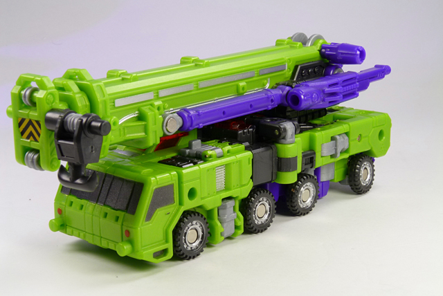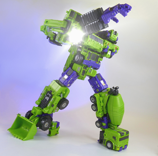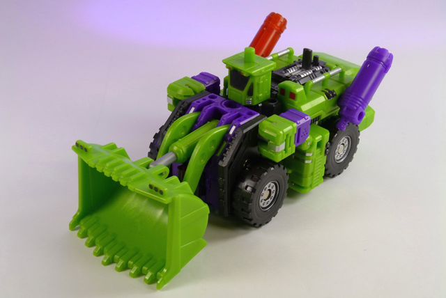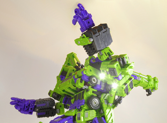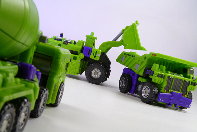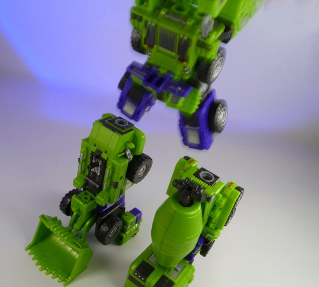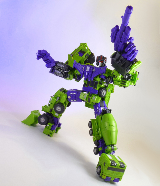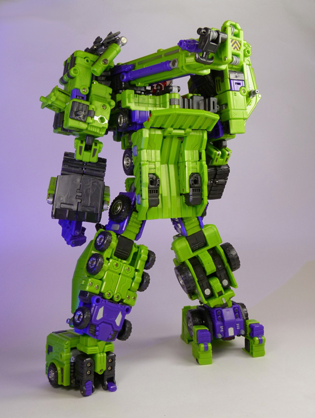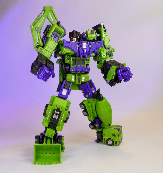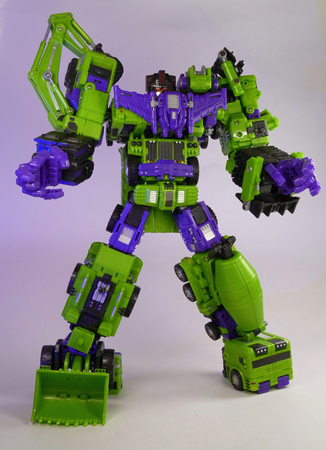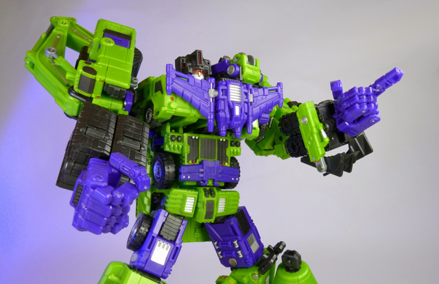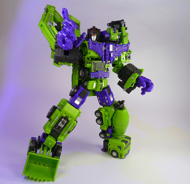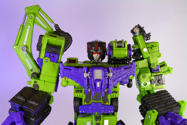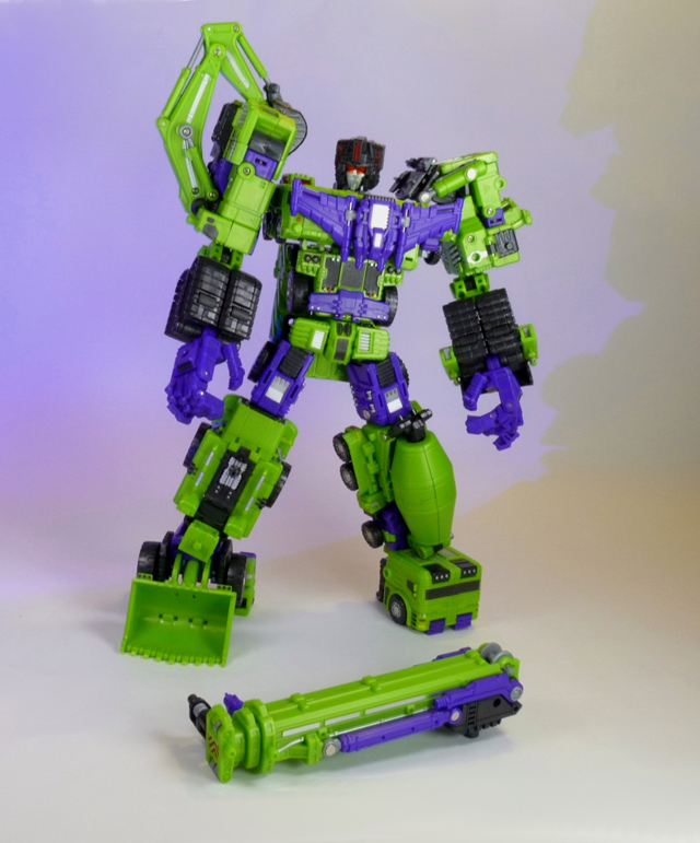 Due premesse prima di procedere: qui, purtroppo, non parliamo di Takara e di un suo ad oggi latitante Masterpiece Devastator, bensì di TFC Toys e del suo mastodontico Hercules. In pratica, una ditta di talentuosi appassionati orientali che non detiene diritti sui Transformers ha partorito un modello che si rifà al personaggio originale, ma NON lo è ufficialmente. Tuttavia, nomi nuovi, assenza del logo Decepticon e pesanti quanto inevitabili variazioni dal design televisivo non riescono a minare completamente la grande appetibilità del prodotto, che rimane comunque immediatamente riconoscibile e riconducibile all’originale G1 per distribuzione dei colori, componenti e tipologia dei mezzi da cantiere, nonché probabilmente ispirato alle linee adulte del fumetto All Hail Megatron disegnato da Guido Guidi. Ma qui si ferma la mia conoscenza in materia, per altri rimandi estetici vi invito ad osservare le foto di corredo all’articolo per farvi un’idea.
