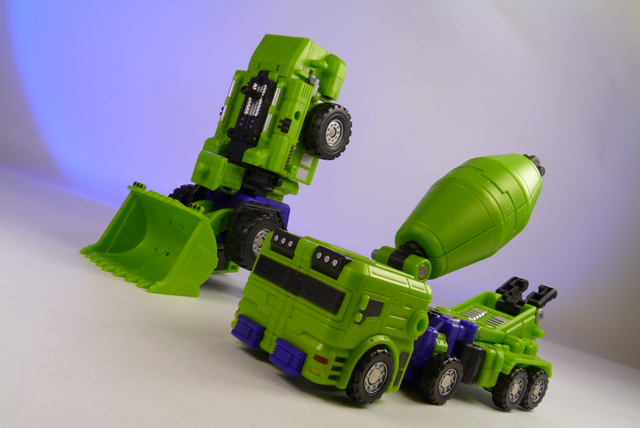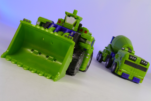 Passiamo agli alter ego veicolari. Le trasformazioni, niente affatto banali, non sono comunque troppo intricate e si effettuano con passaggi che divengono presto veloci ed intuitivi, grazie anche alla precisione degli incastri e alla solidità del progetto. I sei mezzi da lavoro sono esattamente quelli visti nell’anime: autocarro, bulldozer, betoniera, escavatore, gru e ruspa. Sono piuttosto carini e di certo dettagliati, ma a mio avviso sono forse il tallone d’Achille dell’uscita TFC, ovvero la modalità meno convincente. Parere personale naturalmente! Questo perché mi hanno trasmesso una giocattolosità abbastanza marcata, forse dettata dalle proporzioni, dal colore, dalla saltuaria presenza di pugni mal celati o dall’assenza di elementi più raffinati come ad esempio abitacoli con vetrino, porte apribili o ruote sterzanti ovviamente laddove possibile, mentre invece contemplano apprezzabile possibilità di movimento gli attrezzi del mestiere come la gru, le pale frontali, la benna e così via. Ma è evidente che tutta l’attenzione del produttore sia stata catalizzata dall’Hercules in toto, come è giusto che sia in fondo.