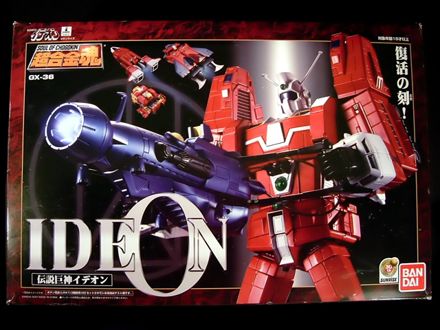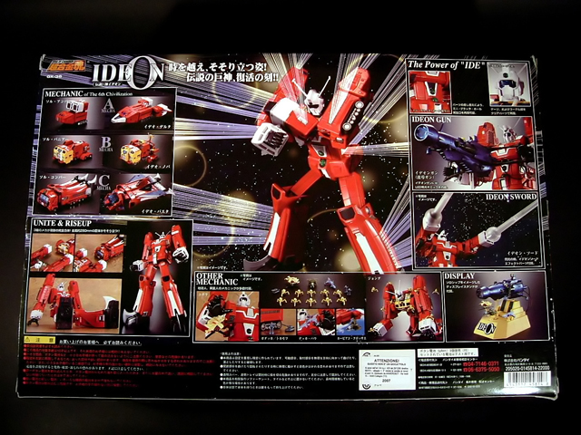 La scatola è decisamente grande (42 x 28 x 13 cm), e bella pesante. Sull'anteriore è immortalato in primo piano l'Ideon nell'atto di impugnare l'enorme Ideon Gun mentre sullo sfondo, in alto, si vedono i 3 mecha A, B e C che lo compongono, sfreccianti in conformazione di volo. Nell'angolo in basso a destra, accanto al logo Bandai, fa mostra di se l'adesivo celebrante il trentennale Sunrise. Nell'angolo diametralmente opposto, come da tradizione, abbiamo i loghi Soul of Chogokin, Sunrise e della serie anime e il codice del modello. Sul retro, intorno alla bellissima immagine centrale dell'Ideon nella posa di lancio dell'all directional missile, sono distribuiti tutta una serie di piccoli riquadri illustranti i mecha che compongono il robot e la possibilità di conversione in due conformazioni ciascuno, gli accessori in dotazione e la basetta espositiva.