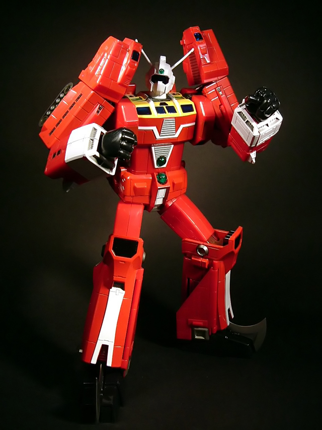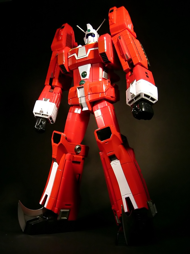 Imponente è dire poco, stiamo parlando del soc in assoluto più alto sinora prodotto, per la precisione 28 cm per l'invidiabilissimo peso di 1390 grammi. Tale peso, come detto, si concentra per gran parte a livello delle gambe garantendo grande stabilità ad un gokin che, data l'altezza, richiedeva giustamente di essere ben ancorato a terra. ll metallo si localizza in corrispondenza di gambe, bacino, torace e braccia. Sono invece di plastica i piedi, le cosce, l'addome, le spalle, gli avambracci e la testa. Nonostante le ragguardevoli dimensioni e la monocromaticità del soggetto che potrebbero trasmettere la sgradevole sensazione di "giocattolone", la cura del dettaglio messa da Bandai nella verniciatura ma soprattutto nella riproduzione di abbondanti pannellature su tutto il modello così da spezzarne la monotonia, sono riuscite a scongiurare questo rischio, il tutto mantenendo una invidiabile attinenza alla controparte animata. La verniciatura è quindi generalmente buona, priva di particolari difetti, ma dispiace che la differenza nella tonalità di rosso tra parti in plastica e parti in metallo sia abbastanza evidente (più in foto che non ad occhio nudo ad onor del vero). L'operazione di assemblaggio richiede pochi secondi visto che i mecha sono praticamente già confezionati in conformazione pronta per l'agganciamento. E' sufficiente estrarre le cosce dal modulo C, operazione che all'inizio può davvero terrorizzare l'ignaro collezionista visto che è necessaria una notevole forza per effettuare questa manovra, con l'ovvio timore di rompere il modello appena acquistato. Nessuna paura quindi, tirate con forza, è un soc resistente e dopo aver estratto le cosce per la prima volta (deve fare due scatti) l'operazione diverrà via via più agevole. Anche il rientro delle cosce nelle gambe inizialmente può non essere così facile, in questo caso è sufficiente un piccolo trucco: mentre spingete le cosce dentro alla gamba direzionate la vostra pressione verso la parte posteriore dell'articolazione del ginocchio, la parte rientrerà senza alcun problema. Si potrebbe credere che un oggetto così grande possa soffrire di una certa staticità: niente di più sbagliato! Il nostro Ideon ha una notevole posabilità data la sufficiente inclinazione delle caviglie e la discreta flessione delle ginocchia (a scatto), il tutto a fronte di una buona stabilità. A livello del bacino è stato inserito uno snodo localizzato posteriormente che altro non è che la logica evoluzione dell'analogo snodo introdotto nel gx-24. La parziale estrazione, a questo livello, consente l'estensione e la flessione estrema delle cosce e la possibilità di mettere il nostro bel gokin tranquillamente seduto simulando in questo modo il sollevamento del robot dopo l'unione dei moduli (che non si agganciavano in volo per cui il robot si assemblava da disteso). A favorire la naturalezza della posa seduta, la possibilità di rotazione delle cosce sull'asse longitudinale. Anche l'abduzione a livello di anca si può considerare più che buona. Il tronco è un blocco unico, privo di snodi per ovvie ragioni di trasformabilità. Le spalle sono dotate di articolazioni a scatto ed hanno ampia escursione e gli elementi che le sormontano sono in parte mobili e indipendenti perchè ancorati al braccio esternamente a tutto vantaggio della mobilità di questi segmenti. I gomiti, per ragioni legate alla convertibilità del modulo A, sono in parte estraibili potendo flettersi a 180 gradi. Gli avambracci sono ruotabili rispetto alle braccia. La testa ruota a 360 gradi con flessione-estensione quasi nulla. Riguardo alla testa c'è da dire che non è infrequente trovare modelli con antenne modestamente piegate, questo anche perchè, nonostante siano rientrabili nella testa, possono leggermente incurvarsi nella trasformazione in modulo A. La cosa non deve però preoccupare visto che sono state realizzate in plastica semirigida per cui possono essere tranquillamente piegate in senso opposto per fargli riassumere un aspetto rettilineo senza rischi di rottura. Passiamo ora per un attimo agli accessori. Complessivamente considero soddisfacente il numero di mani in dotazione (4 paia) ma ancor più soddisfacenti sono tutta quella serie di piccoli mecha come gli Jyong, i Gadakka e le astronavi che arricchiscono il modello peraltro con una cura del dettaglio davvero notevole a discapito di dimensioni particolarmente contenute. Ovviamente, però, tra tutti gli extra che Bandai ha messo a disposizione di questo gx-36, quello che spicca sugli altri è l'Ideon Gun: interamente in plastica, è davvero enorme e suggestivo quando illuminato dal momento che grazie a 3 batterie (LR44) già in dotazione può essere acceso con un apposito interruttore e con la possibilità di simulare lo sparo applicando sulla bocca di fuoco una delle Ideon Swords attraverso la trasmissione del bel fascio di luce azzurra all'interno di essa. Le Ideon Swords (due specie di fasci di luce che fuoriescono dalle mani del robot) vanno a completare l'armamentario del robot rappresentando però, date le dimensioni e la cronica carenza di spazio nelle nostre collezioni, un accessorio con cui il modello difficilmente potrà essere esposto date le ragguardevoli dimensioni e tutto il complesso sistema di sostegni che il loro impiego richiede. La basetta, in linea con quasi tutti i componibili Bandai, non è stata concepita per esporre il robot, ma per dare supporto agli accessori e, con un tocco di classe, è stata ideata riproducendo, con analoghi forma e colori, il ponte di comando della Solo Ship. Ha il fondo apribile così da alloggiare al suo interno le mani del modello e fornisce supporto all'Ideon Gun ed alle astronavi.