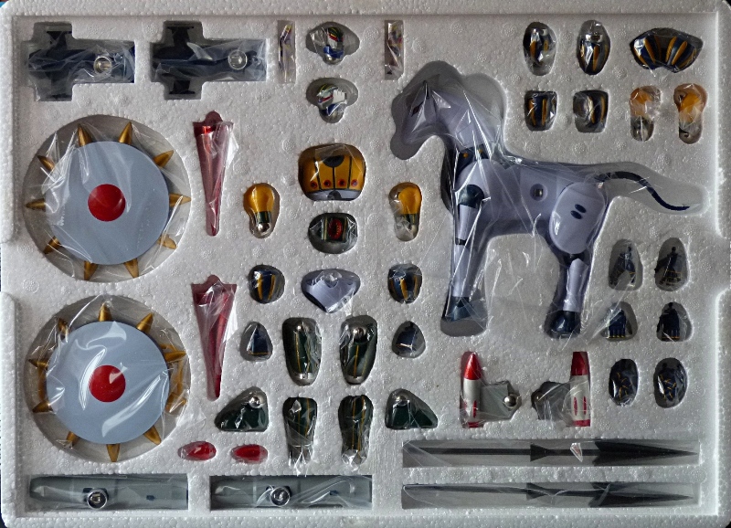 Tutto è contenuto in un unico box di polistirolo con relativo coperchio, niente blister di plastica multistrato, e ciò spiega le grandi dimensioni della confezione. La quantità di parti ed accessori che si trovano all’interno è notevolissima, dopotutto il Jeeg sul teleschermo non si faceva certo mancare armi di ogni tipo, e tutto è avvolto singolarmente in bustine di plastica, dimostrando una lodevole cura nell’imballaggio. Si parte bene direi!