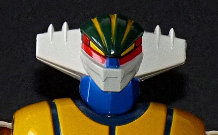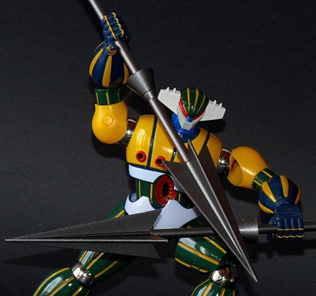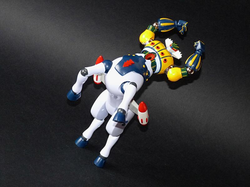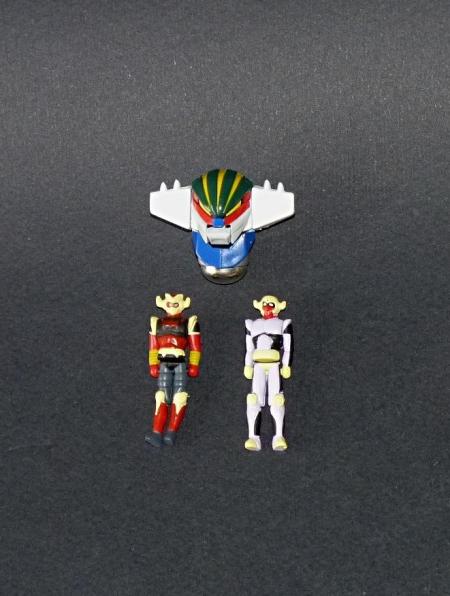 Il resto degli accessori non è caratterizzato da una particolare qualità: i bazooka sono proprio piatti quanto a dettaglio, le trivelle hanno una strana colorazione cromata che non si integra granchè bene con le altre tinte del modello, gli scudi rotanti sono pesanti e tendono a staccarsi troppo facilmente dagli avambracci, a causa di un perno ad incastro troppo piccolo. Ma nel complesso, sono fedeli e riconoscibili, garantiscono una vastissima gamma di possibilità e c’è di che sbizzarrirsi. Assenti invece astro componenti e componenti subacquei (e anche il Big Shooter): se ne sentite la mancanza potreste anche chiedervi come mai siano stati inseriti invece ben due bazooka o due lance… probabilmente creare altri appositi stampi avrebbe fatto lievitare ulteriormente il prezzo. Le miniature di Hiroshi sono un simpatico bonus, si possono agganciare alla seconda testa disponibile e con una semplice trasformazione il nostro cyborg simulerà il morphing che si vedeva in tv… peccato che le miniature si facciano letteralmente a pezzi appena si comincia a manipolarle, e che la resa estetica della faccia trasformata sia discutibile, con solchi, cavità ed elementi a vista che andavano coperti. Ma ripeto, come simpatica ciliegina in aggiunta a tutto il resto può starci, anche se la realizzazione è quella che è.