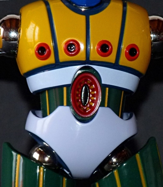 16 cm di altezza per 320 grammi di peso denotano una buona quantità di metallo nella composizione del modello, si nota subito quando lo afferrate perché trasmette quella bellissima sensazione di consistenza e compattezza tipica dei modelli meno giocattolosi. La cosa è curiosa, visto che parliamo di un prodotto che basa buona parte dei propri equilibri su interazioni magnetiche, e naturalmente una buona bilanciatura e distribuzione dei pesi è fondamentale per la buona riuscita di questa tipologia di chogokin, sempre così difficoltosa da realizzare con risultati decenti.