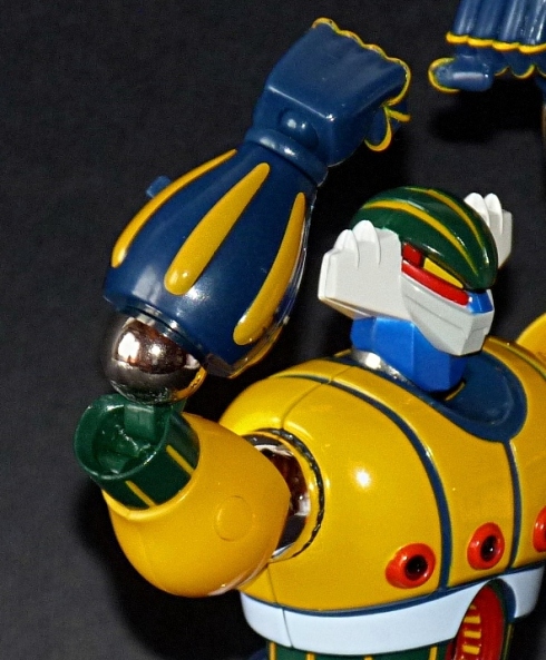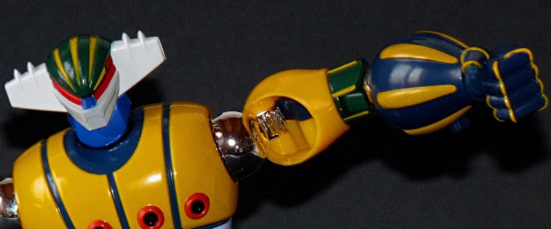 La testa ha una mobilità discreta e si basa completamente sull’aggancio magnetico sferico: è possibile inclinare il capo in avanti e indietro in misura soddisfacente, mentre invece la rotazione laterale è un po’ ostacolata dalla presenza del torace, che limita il movimento del collo, e il possibile sfregamento può causare alla lunga perdite di vernice, quindi fate attenzione. Lo sculpt facciale è molto bello, colorato, fedele all’anime e dotato di buon dettaglio. Qualche soluzione per evidenziare meglio la bocca (chiamiamola così!) sarebbe stata cosa gradita, ma il dettaglio non viene comunque perso grazie al gioco tra luci ed ombre provocato dal rilievo di questa parte. Le spalle presentano un doppio snodo: il primo, magnetico e ad attrito, collega il braccio al busto, permette una completa rotazione per avanti-alto-dietro, ed è una bella pensata perché consente la tenuta di qualsiasi posa grazie alla sua solidità. La sfera metallica è posta all’interno di esso, e grazie a Dio lo sfregamento spalla-torace avviene tra due parti di plastica, nonostante la cromatura a specchio potrebbe indurre a pensare che quella esterna sia metallica, quindi si scongiurano temuti “effetti grattugia” sul materiale meno resistente. Il secondo snodo permette alle braccia un’estensione laterale di circa 90° ed è anch’esso a scatto. Quando la spalla viene estesa in questo modo, purtroppo rivela impietosamente la cavità al suo interno, causando il primo di una lunga serie di brutture estetiche che scopriremo analizzando il modello. Già che ci siamo, passiamo ai gomiti, che presentano lo stesso problema: qui vi è uno snodo ad attrito posizionato appena prima del magnete, la cui azione, combinata con le rotazioni realizzabili facendo scivolare il braccio sulla sfera, garantisce anche qui una buona mobilità. Ma quando si piega il braccio, diciamo oltre i 45°, anche la sfera esce dalla propria sede lasciando un'altra brutta cavità, che esplode in tutta la sua drammatica bruttezza quando si dà al Jeeg una posa fondamentale come quella del raggio protonico/fune mgnetica. Comprendo benissimo le intenzioni e lo studio per garantire una notevole posabilità, ma è un vero peccato che a CM’S non sia venuto in mente qualche modo per nascondere quelle che a molti sembreranno autentiche piaghe, quando in casi simili altre case hanno adottato, ad esempio, placche coprenti oppure giocato con la colorazione, come si poteva fare per le spalle (forse si poteva per lo meno colorare di giallo anche parte dello snodo a vista nella parte superiore). Con questo micidiale uno-due, mi spiace veramente dirlo, il modello perde parecchi punti. Ma il difetto più grande a mio avviso è un altro: l’incredibile problema degli avambracci sparanti. A parte il fatto che non sono un amante di questi meccanismi, specialmente di quei pulsantoni in bella vista (ma metterne uno a raso della superficie??), in questo caso il congegno è di una sensibilità esagerata, tanto che sovente le mani vengono inavvertitamente sparate via solo per aver sfiorato il pulsante oppure, e questo è incredibile, per aver cambiato inclinazione ad un arto e aver quindi generato lievi vibrazioni! Inconcepibile! C’è evidentemente qualche errore di progettazione nelle dimensioni/forza della molla interna all’avambraccio o nella lunghezza del perno uscente dal polso. E notare che ci sono non una, non due, ma ben QUATTRO paia di avambracci abbinabili ai vari accessori, ma a nessuno è venuto in mente di tenerne una standard priva di pulsante da sparo. Meglio non commentare, dico solo che si annaspa in un bicchiere d’acqua.