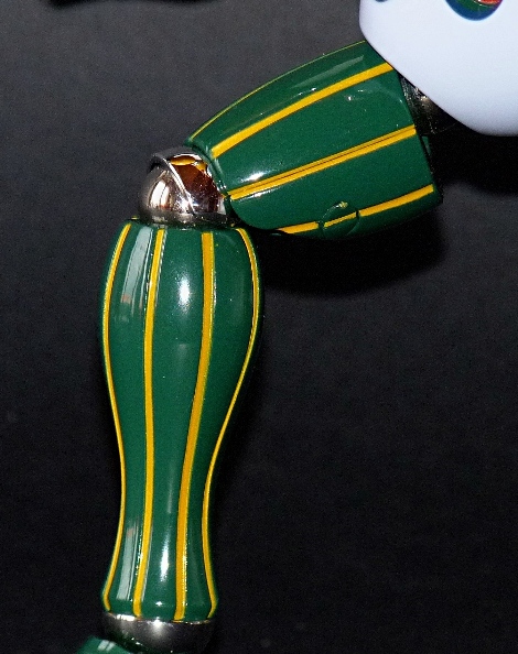 Gli arti inferiori sono due bei blocchetti di zama, anche qui lo sculpt di queste parti curve e corpose mi è piaciuto parecchio, così come due interessanti dettagli tecnici: lo snodo a sfera calamitato da unire al bacino è spostabile in avanti di quei 3-4 mm sufficienti per creare pose più dinamiche senza far cozzare troppo facilmente l’arto con le parti superiori; sempre per ricreare l’effetto attrito, la sfera al livello del ginocchio ruota scivolando all’interno di una semi-coppa, colorata in tinta acciaio metalizzato con l’intenzione di nasconderla se ci si appoggia lo sguardo (al contrario di ciò che si era visto nei prototipi, meno male!). Appena sopra la coppetta, all’interno della coscia abbiamo in addizione anche uno snodo a scatto, e bisogna ammettere che il lavoro ingegneristico per garantire dinamicità al modello è davvero notevole e non scontato. Passando ai piedi, anche qui naturalmente calamita, con sfera parzialmente sagomata per bloccare movimenti indesiderati, e abbiamo anche una pianta del piede inclinabile rispetto al tallone. La suola è intelligentemente gommata, quindi posto su di una superficie adeguata il piede non scivolerà troppo facilmente. Avevo il dentino avvelenato con CM’S per la resa estetica di questi bei piedini (a cui sono stati giustamente affibbiati nomignoli abbastanza coloriti come “scarpette ortopediche” e via discorrendo…), ma devo ammettere che dal vivo il difetto è molto ridimensionato, o almeno questa è la mia sensazione, e probabilmente si integrano in modo passabile con un soggetto più antropomorfo di altri come il nostro Jeeg.