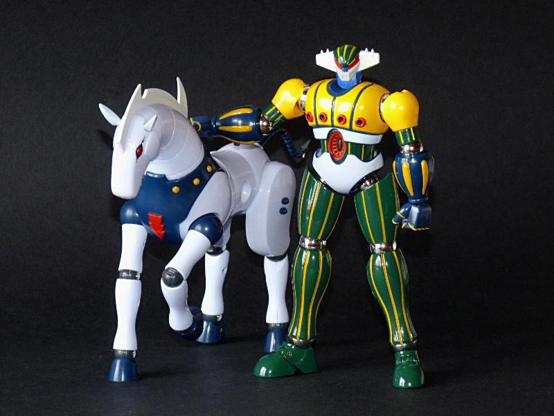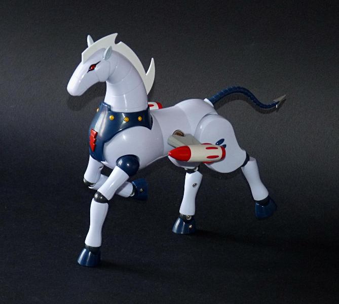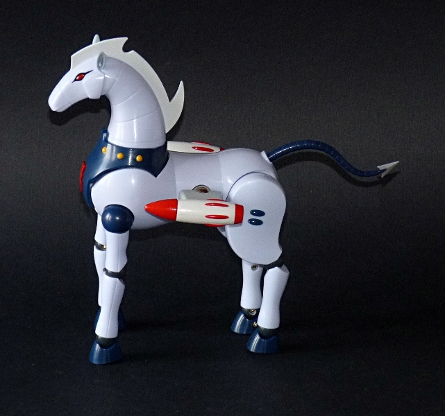 Il cavallino robotico è interamente costruito in plastica, è leggermente più alto del Jeeg e pesa circa 140 grammi. Considerandolo come un accessorio, tutto sommato è fatto più che discretamente, immediatamente riconoscibile rispetto alla controparte animata, ma il paragone con il metalloso e curato Jeeg è improponibile: in confronto sembra un semplice giocattolo. Comunque non mancano dettagli e accortezze come i tappini per le viti, snodi a scatto per le zampe e il collo (il muso invece è inchiodato, come il busto). Mobilità interessante, con zampe anteriori estendibili anche lateralmente, e possibilità di impennare il quadrupede senza utilizzare supporti extra. La ciliegina, naturalmente, è la configurazione in centauro, per cui si sfila la magnetica testa equina e la si sostituisce al Jeeg privato degli arti inferiori: il risultato ha sicuramente il suo perché, possente e d’effetto, solido e accattivante. E’ ancora possibile impennarlo senza aiutino! Ma è totalmente instabile, chiaro… Questa modalità centauro non è davvero niente male e fa la sua sporca figura. Provatela, potreste inaspettatamente sceglierla come posa da esposizione nella vostra vetrina.