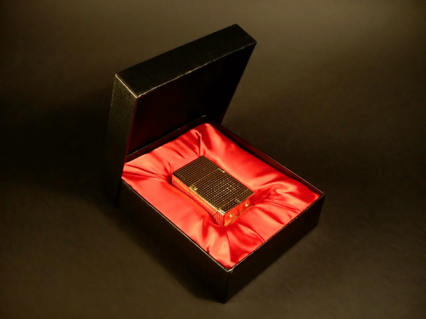 - Una scatola di cartoncino nero rigido molto elegante sul cui coperchio è stampato a lettere dorate il nome del modello. All'interno della scatola, adagiato in un bell'alloggiamento rivestito di raso rosso, come un vero e proprio accendino, troviamo il nostro modello.