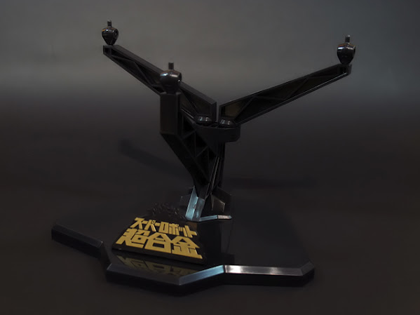 Con questa uscita, Bandai ha deciso di gratificare gli acquirenti di un piccolo omaggio. Stiamo parlando del trident stage, acquisibile in Giappone con l’acquisto del modello o in alternativa con quello di 3 Super Robor Chogokin a scelta (motivo per cui alcuni negozi non lo avevano disponibile nonostante la disponibilità del modello). Trattasi di un espositore con apposita targhetta con il tipico logo della serie e dotato di 3 bracci (uno fisso, centrale e due mobili, laterali) in grado di dare sostegno ciascuno contemporaneamente a un SRC in posa di volo. E’ decisamente funzionale ed appagante per l’occhio la possibilità di vedere 3 di questi chogokin in plastica posa di volo o a simulare scontri reciproci come già visto negli anime. Verrebbe quasi da dire che vale la pena di acquistare il modello non fosse altro per questo bel gadget.