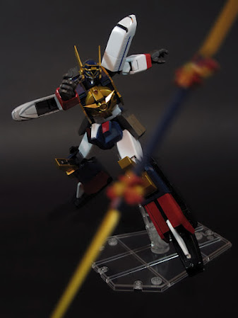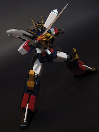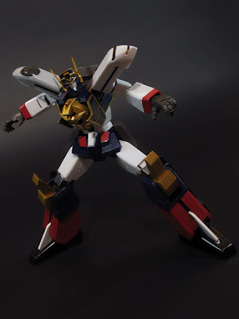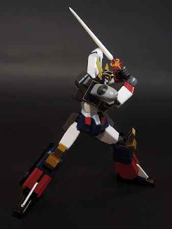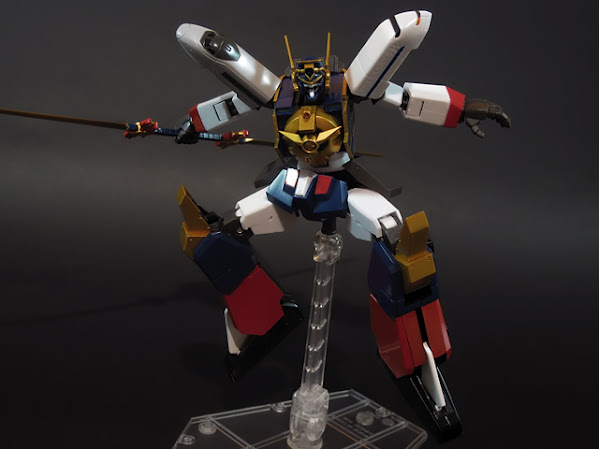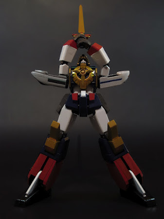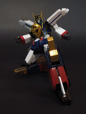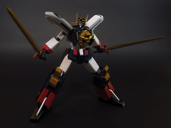 Estratto dalla confezione il chogokin trasmette subito una bella sensazione di rassicurante pesantezza, i 185 grammi distribuiti su 16 cm di altezza (calcolati all’apice delle due antenne ai lati della testa) non saranno da guinnes dei primati ma si difendono più che dignitosamente. Come in molti suoi predecessori, anche in questo Super Robot Chogokin la zama è concentrata quasi esclusivamente a livello degli arti inferiori, sono infatti di metallo i piedi e le parti esterne delle gambe mentre tutto il resto, con la sola eccezione del blocco dello snodo delle anche e della parte circolare esterna del diadema sul petto, è in plastica. La peculiare distribuzione dei pesi con localizzazione delle parti più pesanti negli arti inferiori ha nella notevole stabilità del modello anche nelle pose più estreme il suo vantaggio principale. Anche in questo caso, infatti (ma con i chogokin di questa serie la cosa non è ormai più una novità), abbiamo una posabilità al limite dell’impossibile, favorita dalle potenzialità estreme di praticamente tutti i punti di snodo del modello. Le articolazioni sono tutte ad attrito ma la cosa non dovrebbe porre problemi di tenuta neanche col passare degli anni viste le esigue sollecitazioni che gli snodi sono chiamati a sostenere soprattutto dal ginocchio in su, e cioè là dove il modello è più leggero. Analizzando nel dettaglio le giunture devo dire che ad una prima, superficiale valutazione, sono rimasto deluso dalle caviglie le quali parevano presentare movimenti molto limitati. In realtà è bastato dare un occhio al foglio di istruzioni per comprendere che gli snodi a questo livello sono estraibili tirando il piede in basso. Questo movimento cambia decisamente le carte in tavola facendo acquistare moltissimo soprattutto nell’inclinazione all’interno ed all’esterno del piede e di conseguenza alla posabilità dell’intero modello. Notevoli anche i movimenti di estensione del piede, favoriti dallo scorrimento dell’inserto bianco ancorato al dorso in una guida sulla faccia anteriore della gamba. Anche per il ginocchio è stato fatto un piccolo capolavoro tecnico. Come già osservato nello Zeorymer di questa stessa serie lo snodo del ginocchio è infatti articolato sia a livello della gamba (dove fa il grosso del movimento grazie anche alla concomitante mobilità dello sperone dorato) che all’attacco con la coscia dove assicura un supplemento di escursione tale da permettere alla gamba di flettersi totalmente sulla coscia con escursione fino a 180 gradi. In particolar modo quest’ultimo movimento è permesso dallo scorrimento delle due metà anteriore e posteriore della coscia l’una sull’altra, una interessantissima soluzione finora mai apprezzata in un chogokin ma solo a livello di kit. Altro snodo altra goduria: le anche consentono di realizzare praticamente tutti i movimenti desiderabili grazie anche alla mobilità, permessa da perni a sfera, dei tre elementi (anteriore, posteriore e laterale) del gonnellino in modo tale che essi non siano di impedimento. La coscia infatti può essere flessa ed abdotta a 90 gradi ed estesa quasi nella stessa misura nonché discretamente ruotata sull’asse longitudinale. Il tronco è dotato di due snodi, uno al passaggio bacino-addome (dove modula movimenti di torsione) e l’altro, estraibile, allo stacco addome-torace (dove invece regola la flessione in avanti del torace stesso, implementabile con l’estrazione dello snodo). Le spalle ruotano a 360 gradi ed hanno buone escursioni in flessione ed estensione. Questa ampia libertà di movimenti conferisce pertanto ottima posabilità anche a livello delle braccia permettendo quindi al gokin, per esempio, di impugnare a due mani le spade sollevandole sopra alla testa. Le braccia ruotano liberamente sull’asse longitudinale all’attacco con la spalla, lo stesso fanno gli avambracci al passaggio col gomito. Il gomito è flessibile ben oltre i 90 gradi mentre i polsi hanno discreti movimenti di inclinazione e di flessione-estensione (un po’ scocciante il fatto che per cambiare mano spesso il perno se ne venga via con la mano che si vuole sostituire e debba essere riapplicato). Il collo è dotato di due snodi a sfera, uno all’attacco col torace e l’atro all’aggancio con la testa. Questa soluzione implementa notevolmente la mobilità della testa garantendole rotazione a 360 gradi, inclinazioni laterali, estensione e flessione estreme. Anche i reattori del backpack sono mobili e parzialmente inclinabili. La verniciatura è nel complesso molto buona e curata, fatta eccezione per un paio di segni di distacco dalle sprue localizzati nella parte inferiore della faccia posteriore delle gambe e su qualche impugnatura delle spade (peccati veniali a onor del vero) non ho constatato particolari imperfezioni. Plastiche grigie un po’ discutibili quanto a qualità, sia a livello del backpack che degli elementi laterali del gonnellino. Senza infamia e senza lode gli accessori nonostante la discreta ricchezza in spade dell’armamentario anche se devo ammettere che impugnando lo spadone il modello risulta molto scenografico. Bella la lancia realizzabile dall’unione delle due spade dorate con l’apposito connettore.