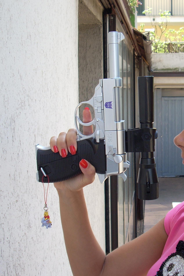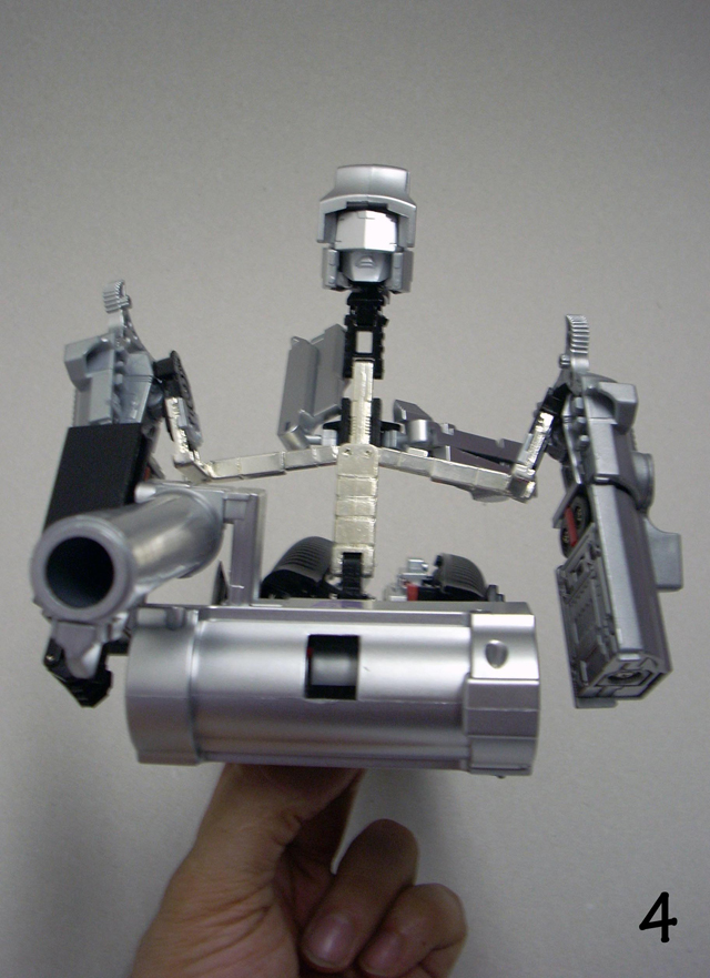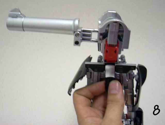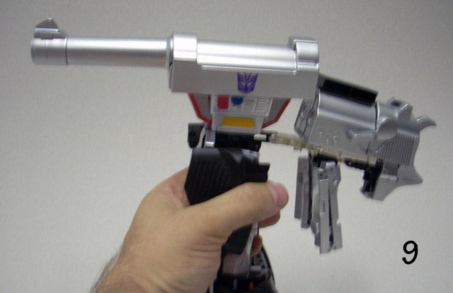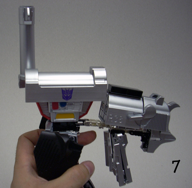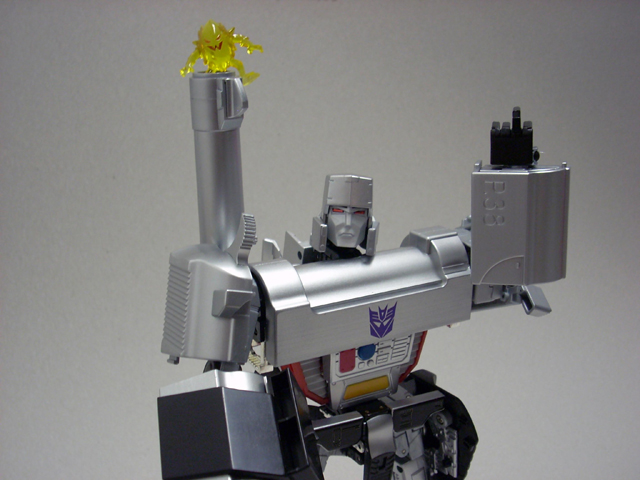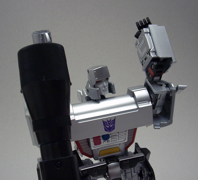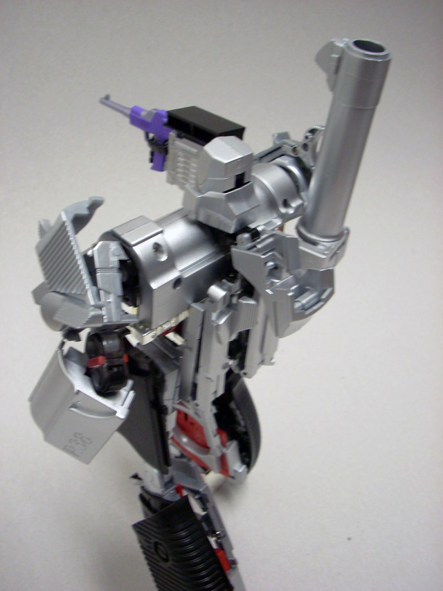 620gr x 32 cm di altezza il nostro Destron leader si caratterizza anche lui per la prevalente presenza di plastica e l' assenza quasi assoluta di zama.In perfetta scala con i precedenti pm 01/04 ne fanno un partner ideale in vetrina, diciamo uno step successivo obbligato.Pur non essendo uguale al 100% alla sua rappresentazione animata, non si fatica a riconoscerlo, serafica forse l' espressione facciale ma il mentone ed i ciglioni sono i suoi.Emozionanti gli occhi metallici rossi ed incastonati.Il robot pare ben proporzionato a parte la cronica magrezza delle gambe per via della trasformazione.A differenza dell' mp 01/04 non ho notato presenze di rimasugli di sprue palesemente evidenti, mentre critico le cromature che solo dopo due contatti tendono a opacizzare.La testa è dotata del classico giunto sferico nulla di particolare, mentre è simpatica la possibilità di modificare l' espressione facciale operando sull' elmo che alzandosi ed abbassandosi nasconde i ciglioni di Megatron.Articolazioni delle spalle sufficienti, limitate in abduzione ruotano comunque di 360 gradi.In prossimità dei gomiti, complice la trasformazione, si ha un doppio snodo sfruttabile anche per pose improbabili ma comunque al limite dell' accettabile.Il polso ruota e si torce leggermente mentre le dita sono articolate singolarmente.Il tronco è fisso senza nessuna possibilità di movimento ma la trasformazione regala a Megatron un bacino munito di balestra semirigida che gli dona la possibilità di flettersi lateralmente. (purtroppo anche più del dovuto e con il mirino/cannone sul braccio pende inesorabilmente sul suo peso.)Le gambe sono munite di ben 4 punti di snodo che in teoria permetterebbero infinite posizioni, limitate invero nella pratica dal peso del mirino se applicato al braccio e dalla misera capacità abduttiva donata dal balestrone nel bacino.Le caviglie sferiche permettono rotazioni a 360 gradi e la parte a copertura del piede consente di bloccarli in posizione.